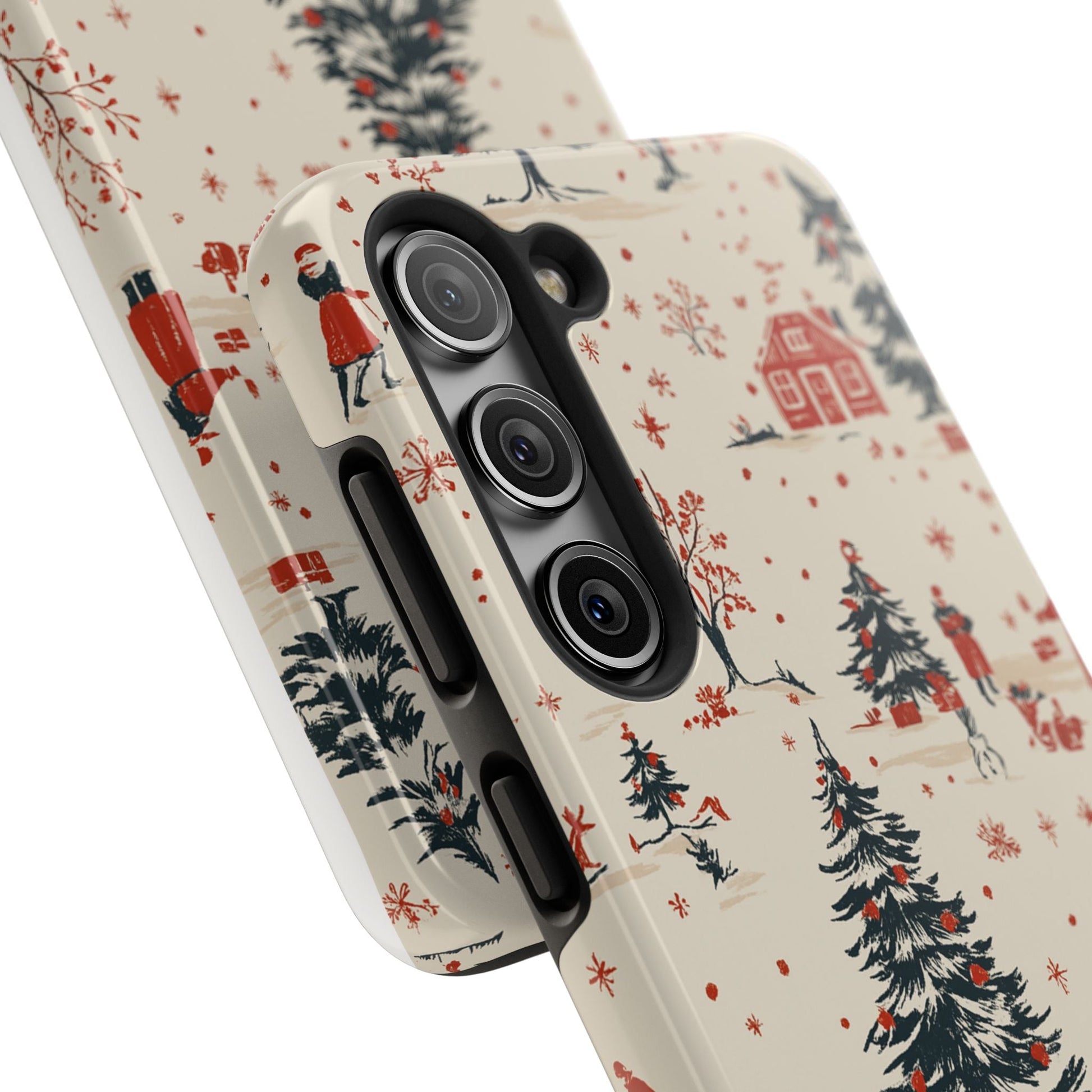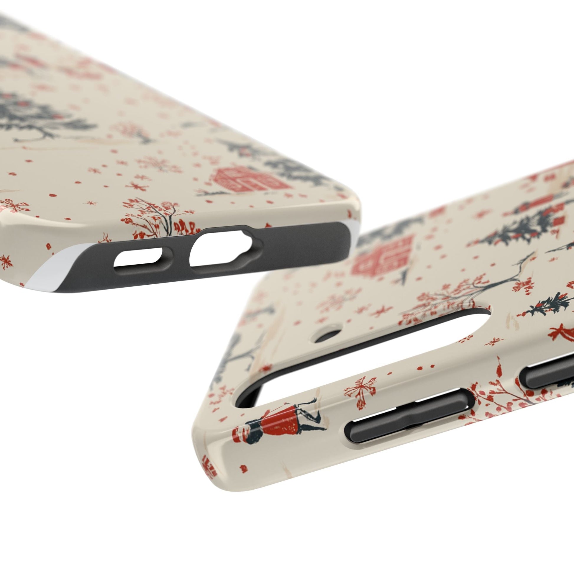 A slim, protective phone case that carries a quiet winter scene — soft cream background, hand-drawn evergreens, tiny skaters and cozy cottages scattered like memories in the snow. The two-piece shell and rubber liner work together to absorb drops and keep the screen raised from flat surfaces, while the glossy, UV-protected finish keeps the illustrated details bright through seasons of use. This case slips easily into pockets and supports wireless charging, so you can move from a brisk walk to a warm café without changing your routine. For adults who love subtle seasonal charm, it adds a gentle, nostalgic note to everyday life and keeps your phone safe without shouting for attention.