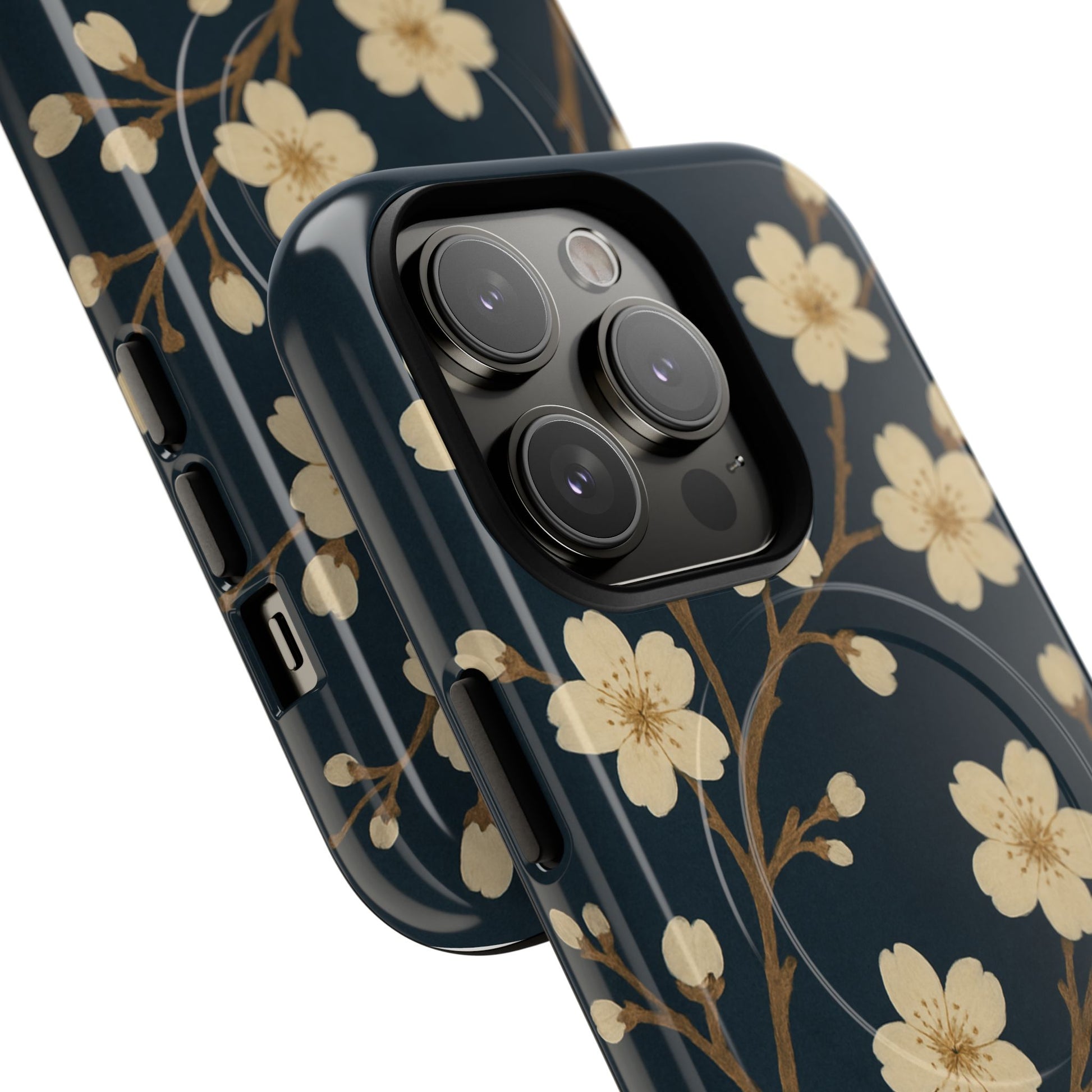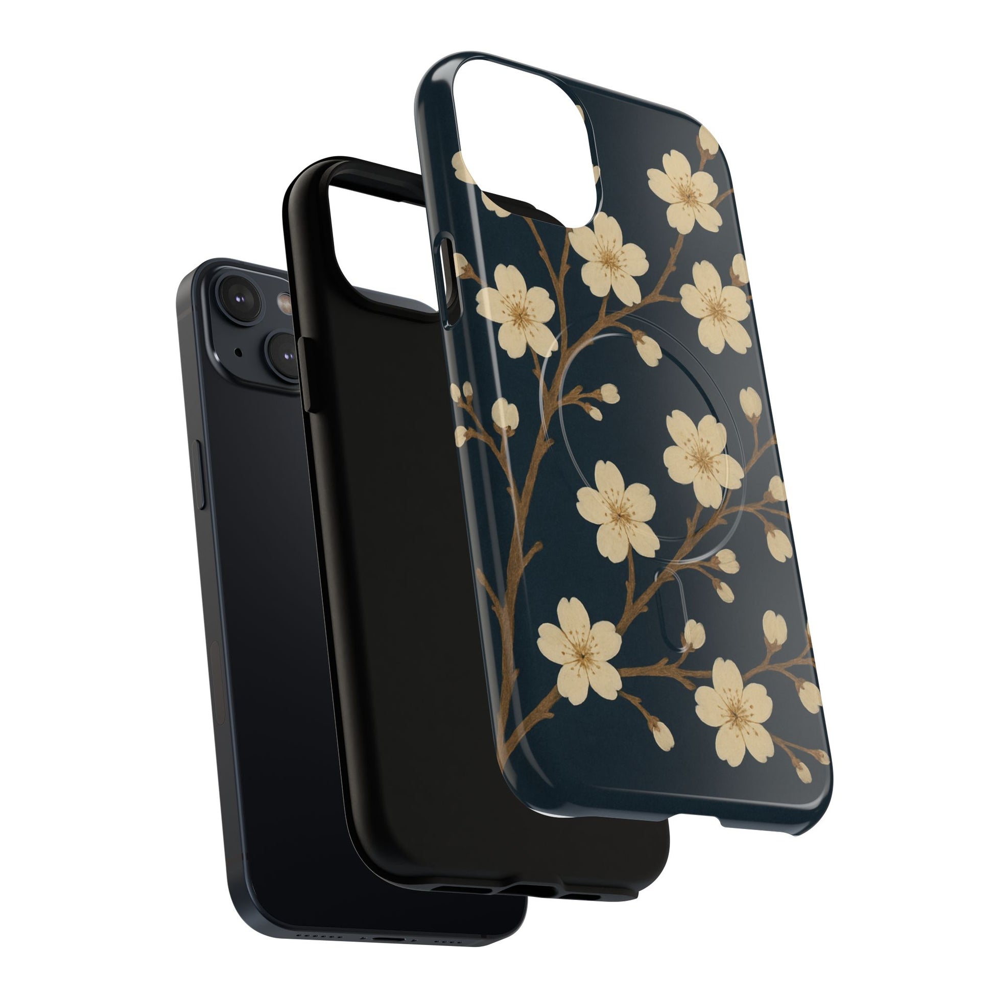 Navy Cherry Blossom Floral iPhone Case - Compatible with MagSafe