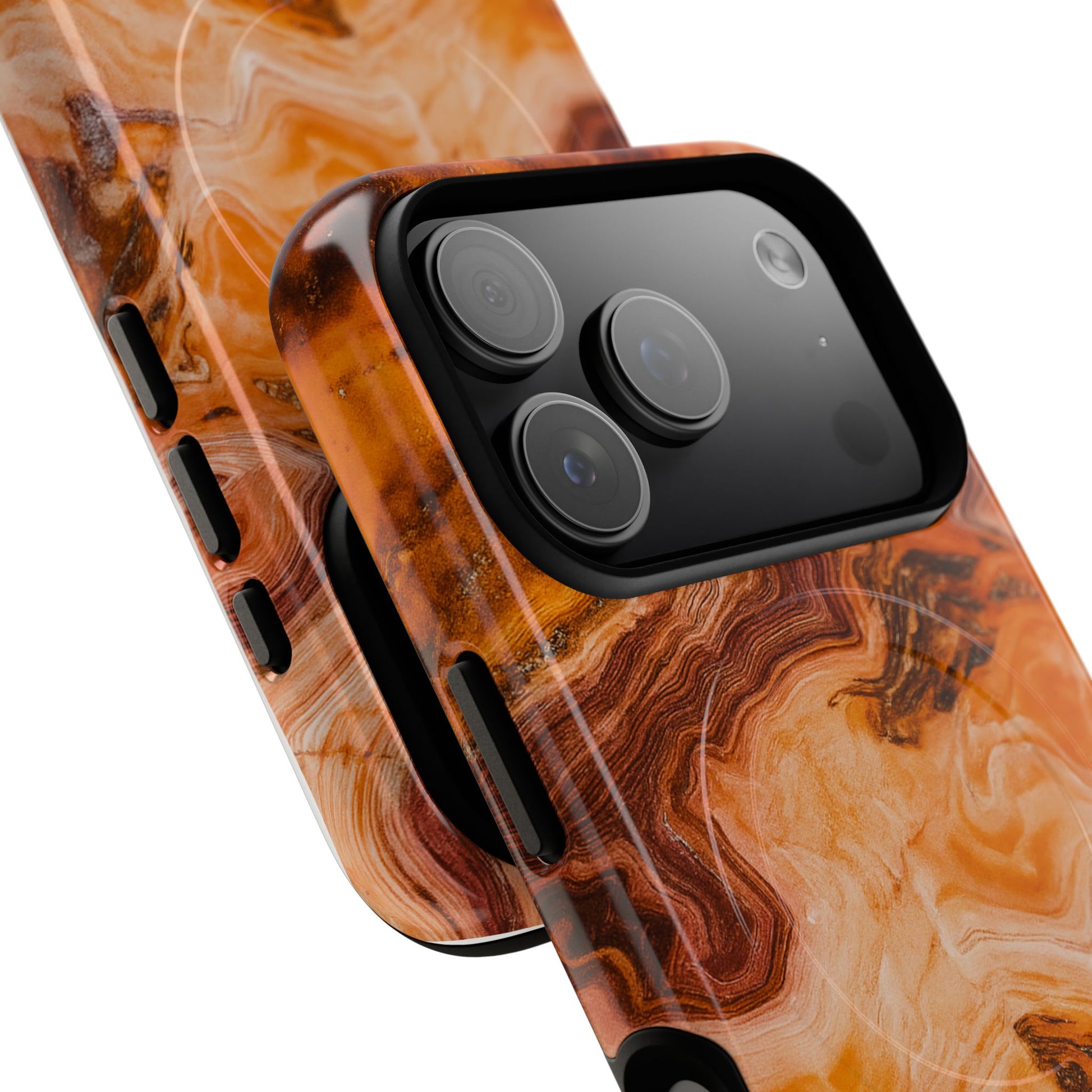 A durable, stylish phone case that looks like warm, swirling agate. The rich amber and caramel patterns create a lived-in, natural vibe that blends protection with personality. Dual-layer construction and a soft TPU liner absorb shocks while the rigid polycarbonate shell resists impacts and scratches. MagSafe-compatible magnetic module keeps wireless charging and accessory snaps effortless. Choose glossy for a jewel-like sheen or matte for a softer, tactile finish — both keep ports open and camera edges protected. This case fits into daily life whether you’re rushing between meetings, exploring city streets, or settling in with a good book; it’s built to take knocks without losing its artisanal look.