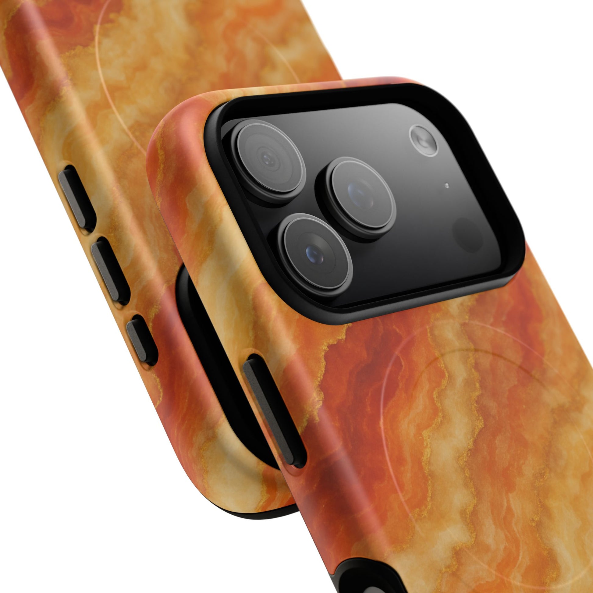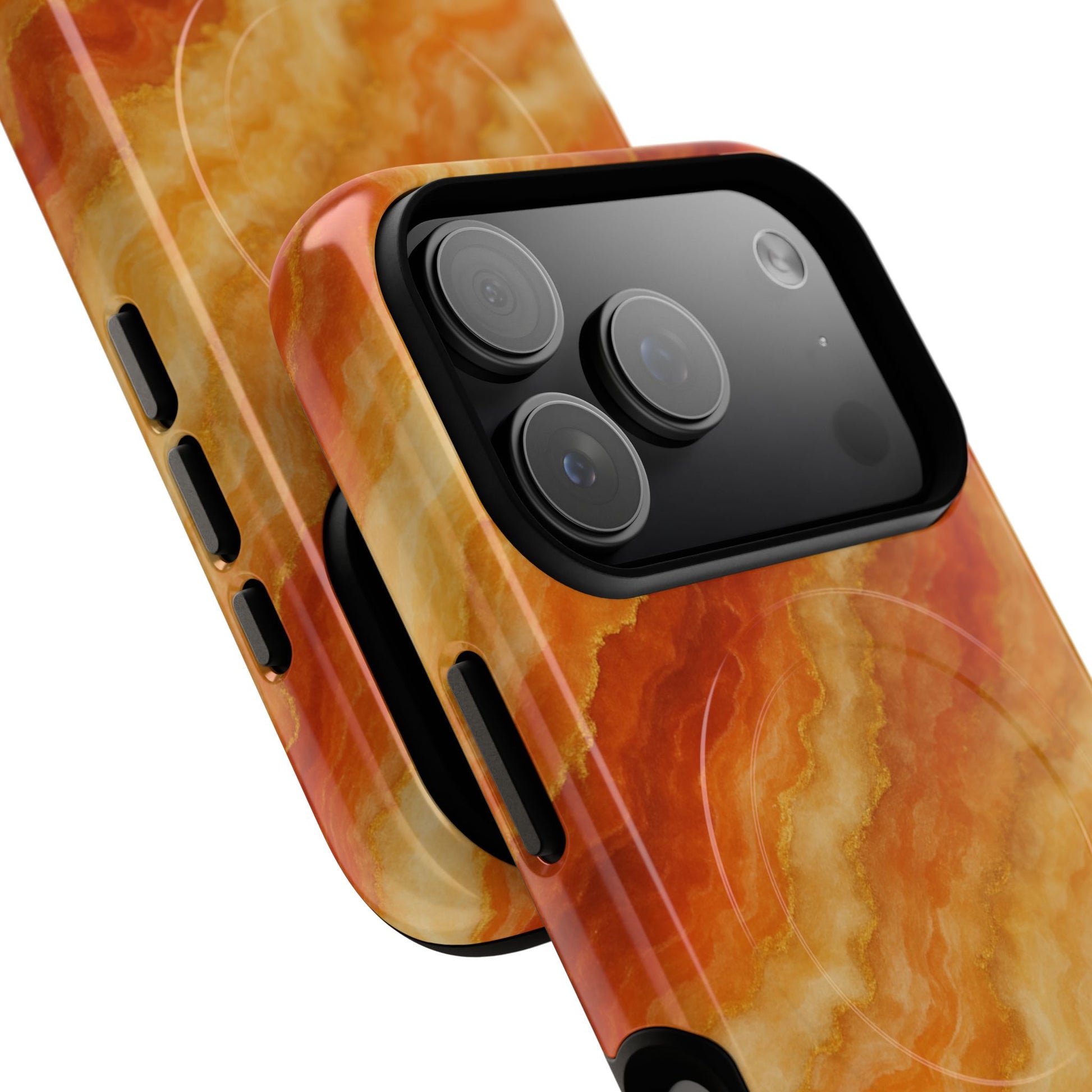 This slim, protective phone case wraps your iPhone in a warm band of agate-like swirls—amber, rust, and honey layered into a glossy or matte finish. It feels substantial in the hand thanks to the dual-layer construction: a hard polycarbonate shell holds the print, while a soft TPU liner cushions drops and absorbs shocks. The MagSafe-compatible magnetic module snaps into place for wireless charging and accessory use, and precise cutouts keep ports and cameras clear. It’s built for adults who like their tech to look like a small piece of wearable art—earthy, tactile, and quietly confident.
