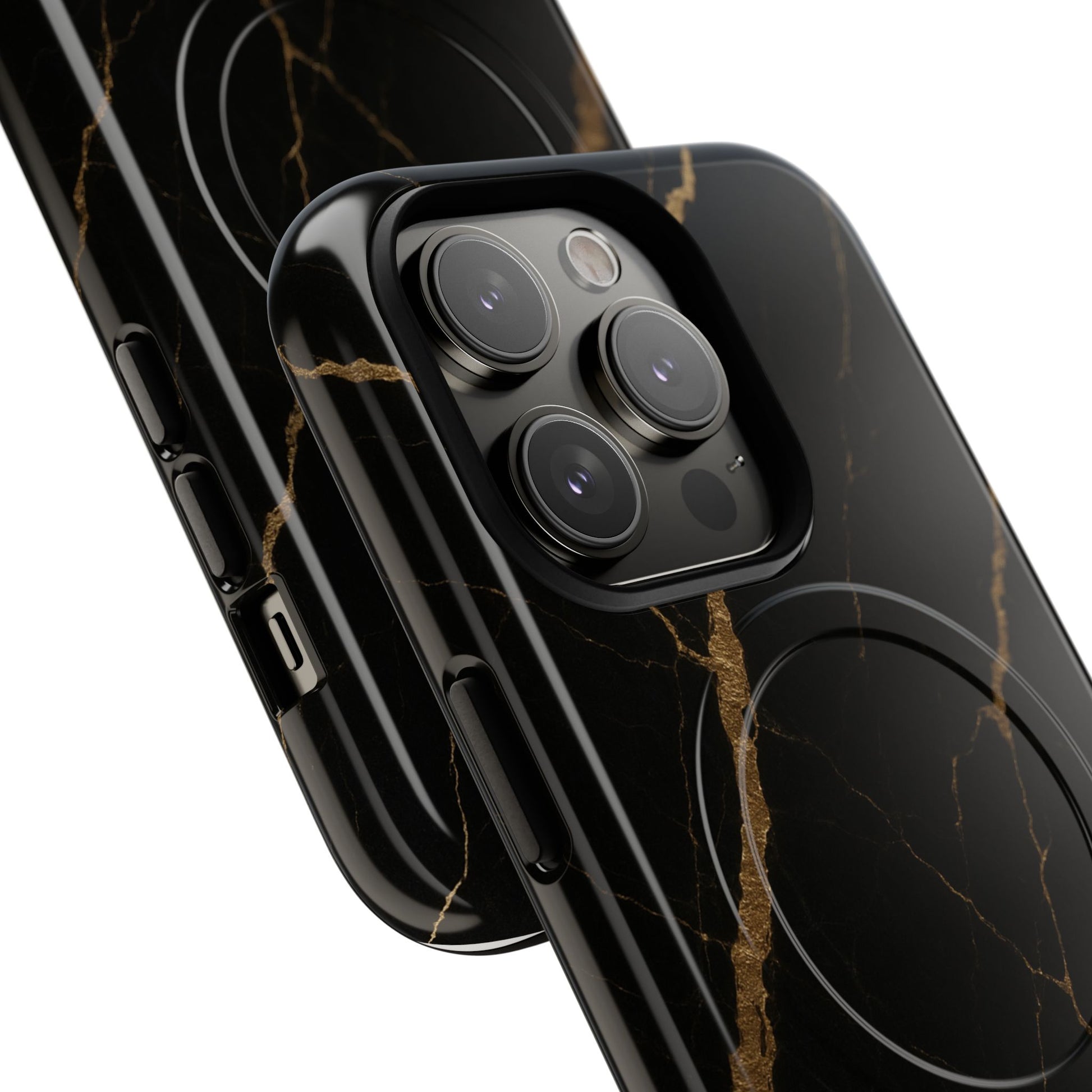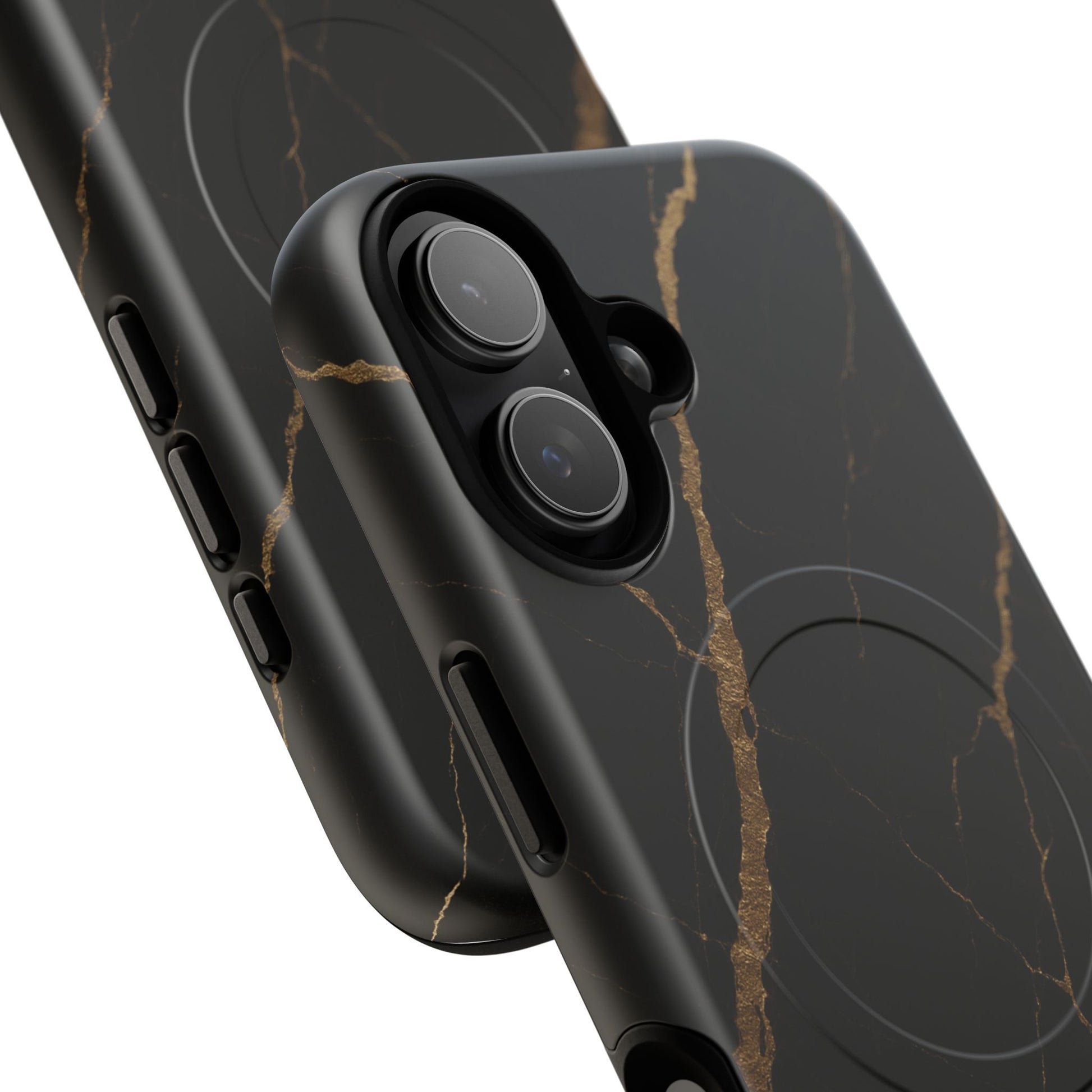 Sleek, protective, and quietly luxurious — this phone case wraps your device in a glossy black marble look with warm gold veining and MagSafe compatibility. The dual-layer design pairs a rigid polycarbonate shell with a shock-absorbing TPU liner so the case stands up to day-to-day knocks while keeping slim lines. The MagSafe magnetic module sits flush for secure wireless charging and accessories, and precise cutouts keep ports and buttons accessible. Choose glossy for deep, reflective color or matte for a muted, tactile finish. This case speaks to someone who prefers refined, understated style without sacrificing modern protective performance.