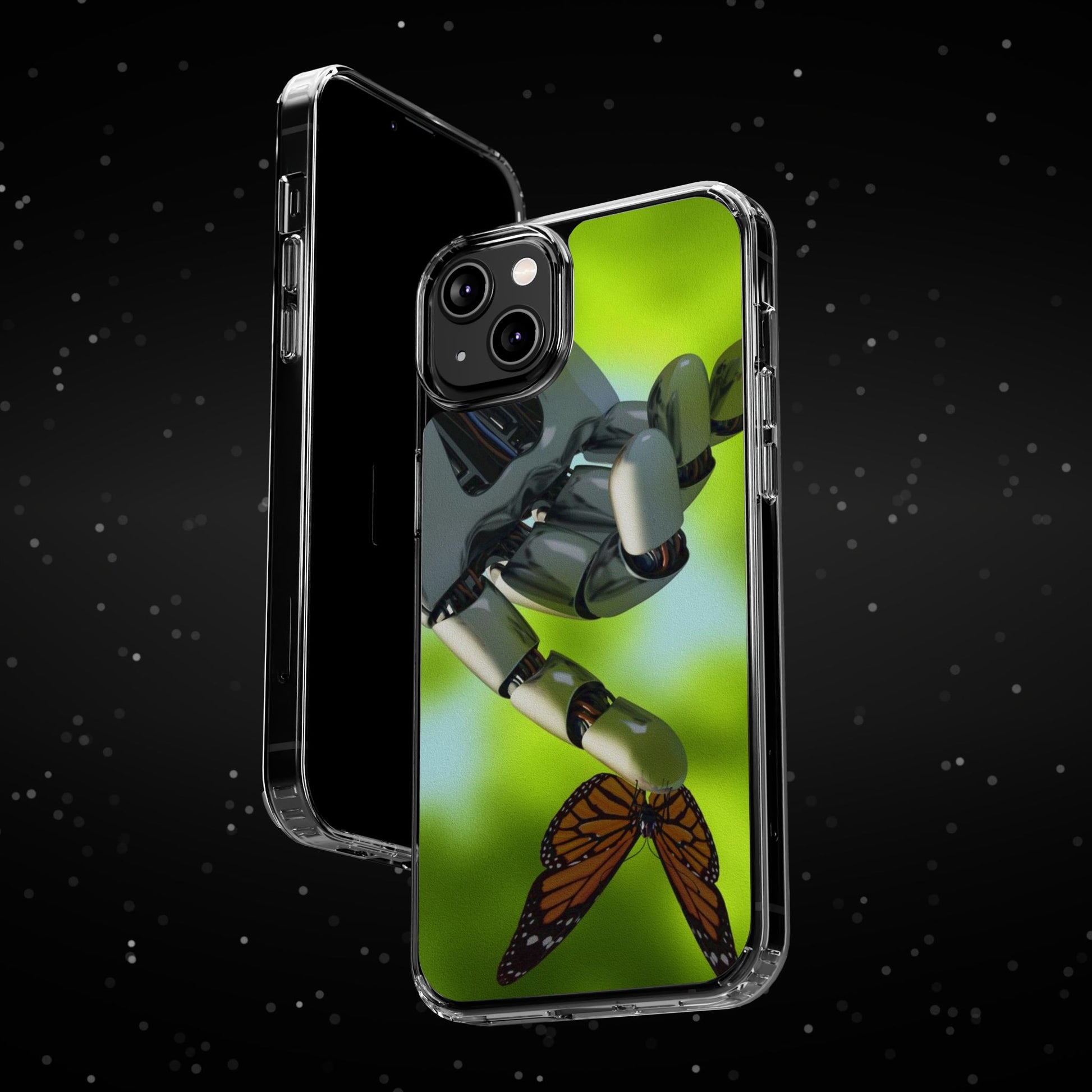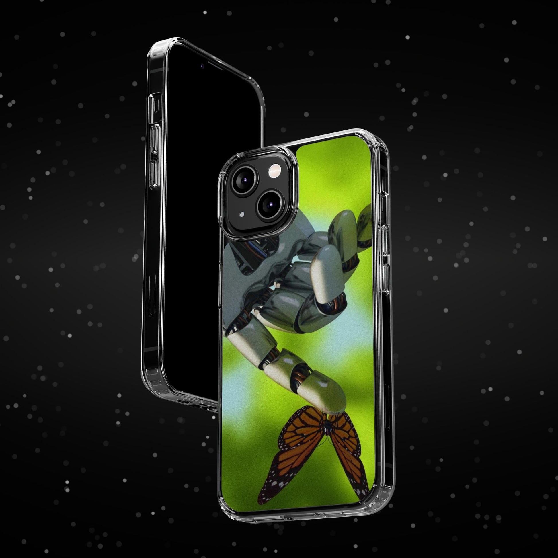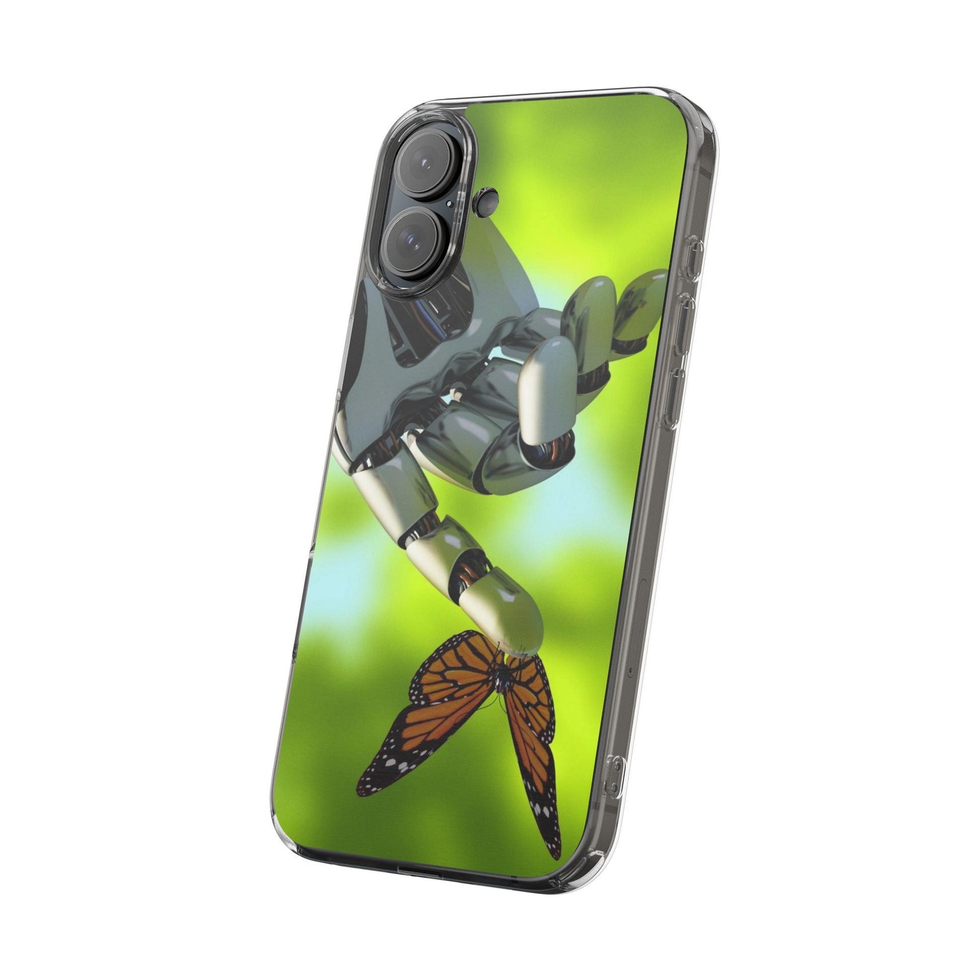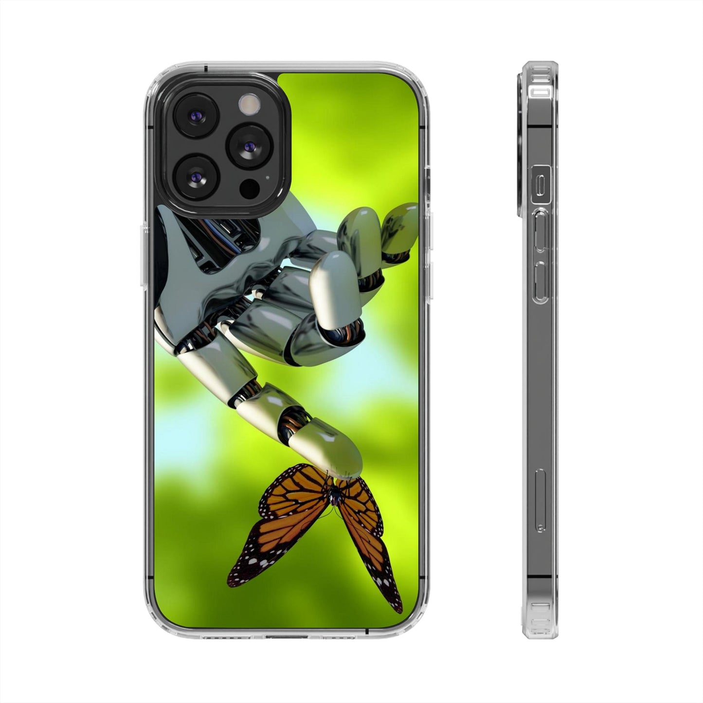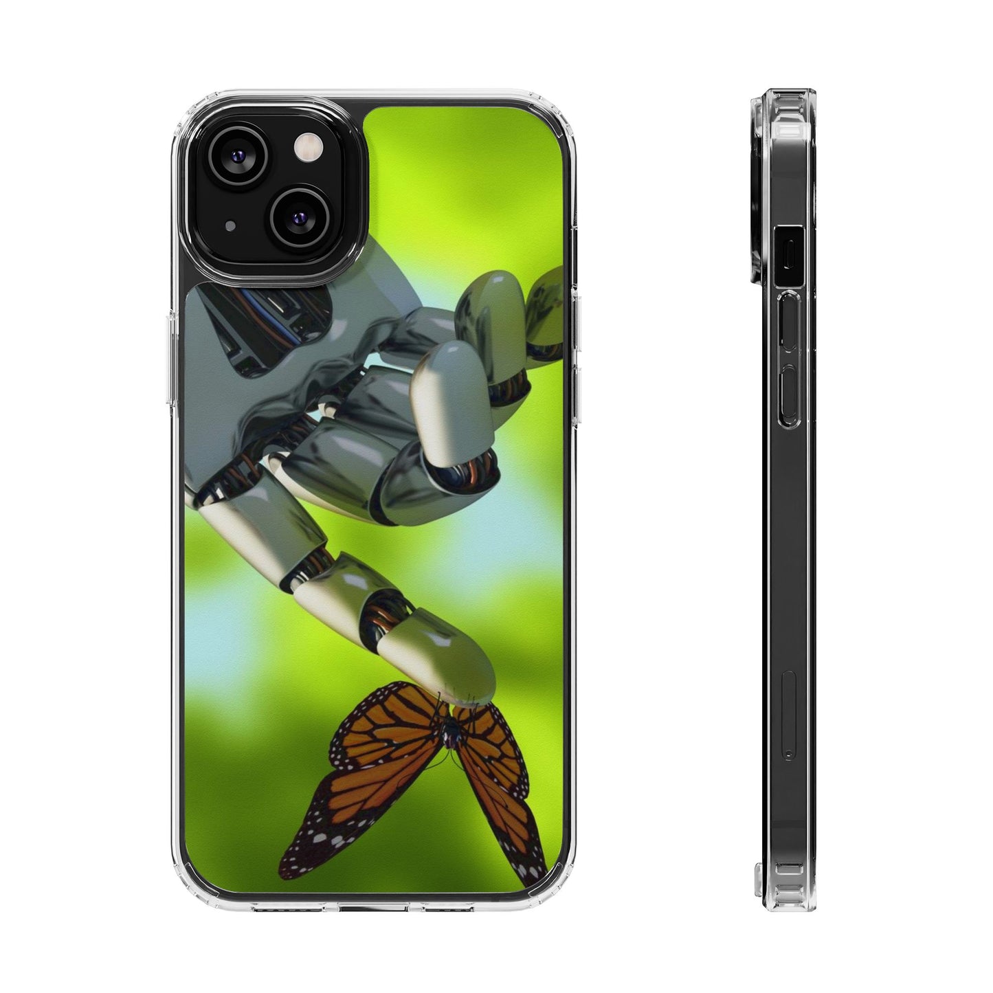 Clear Cases for iPhone 14 Series with Robotic hand and Butterfly.