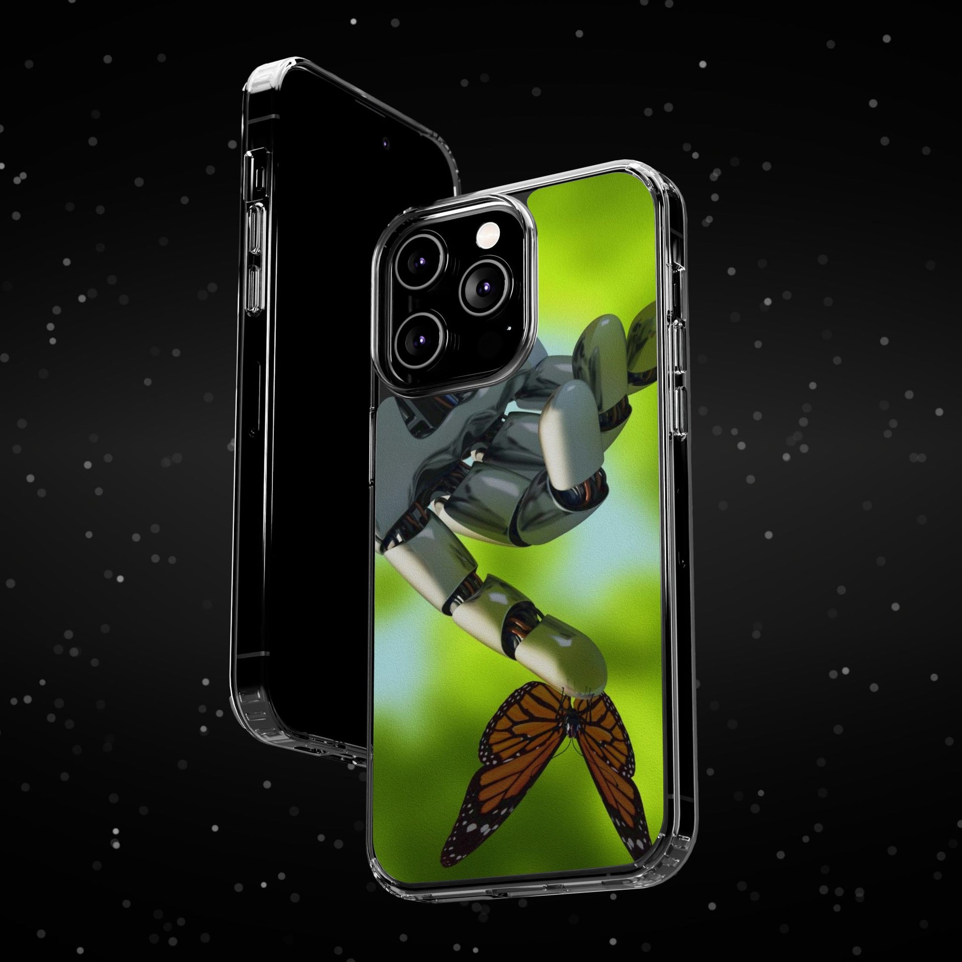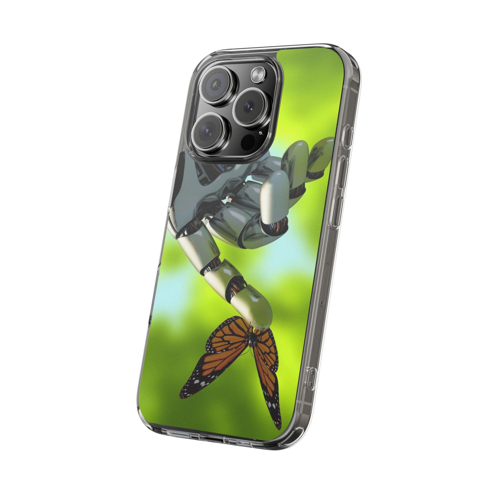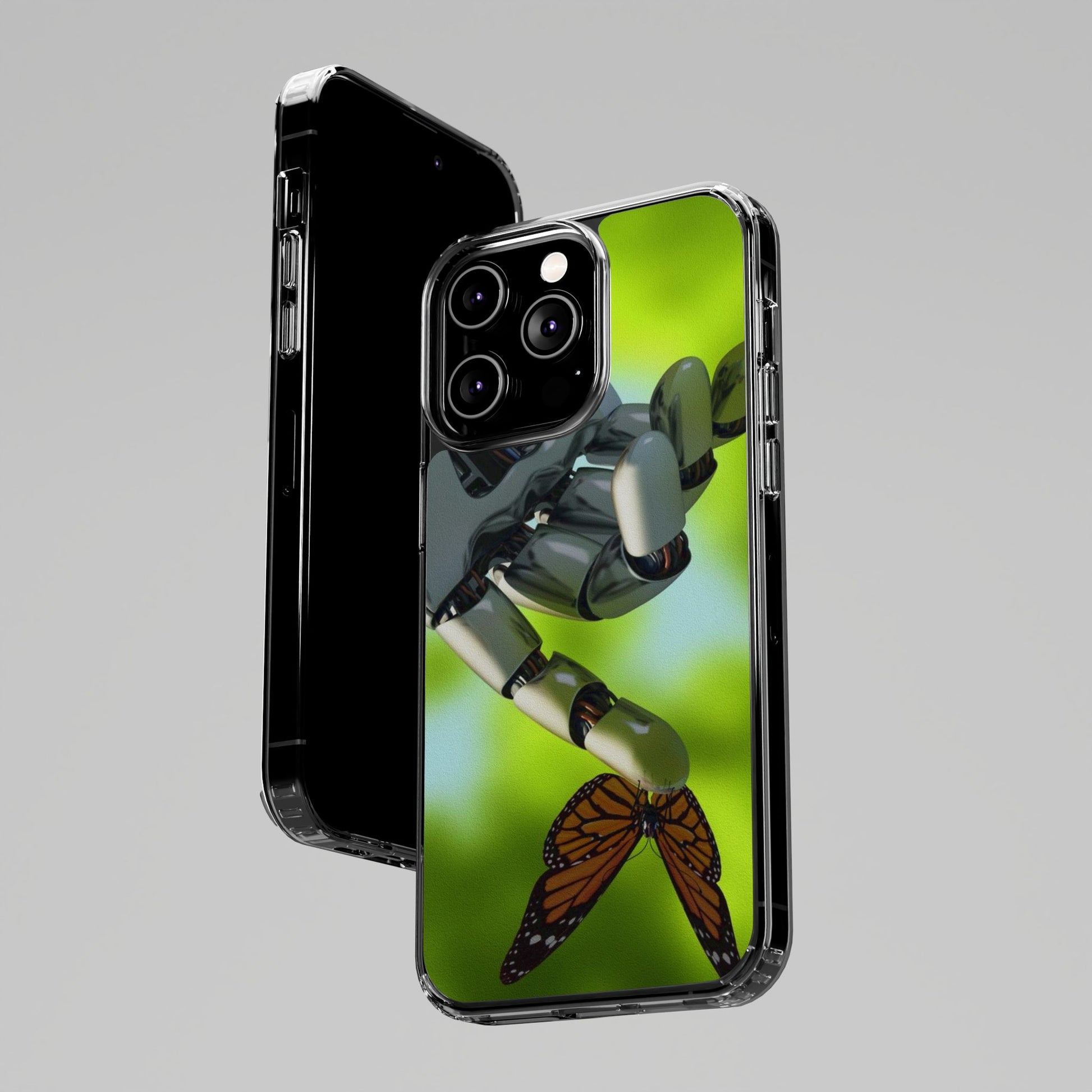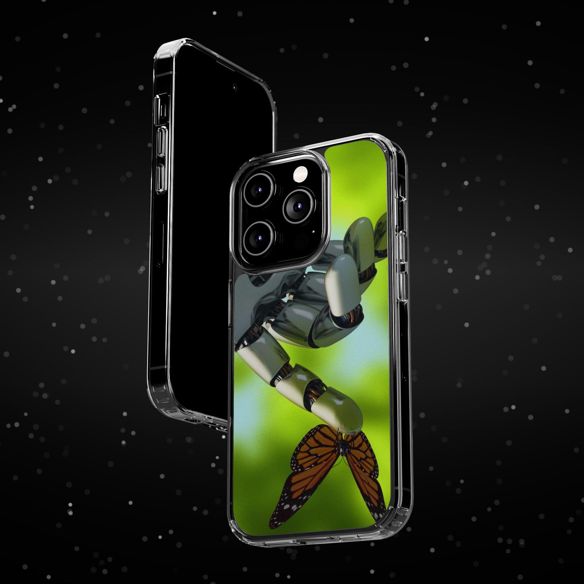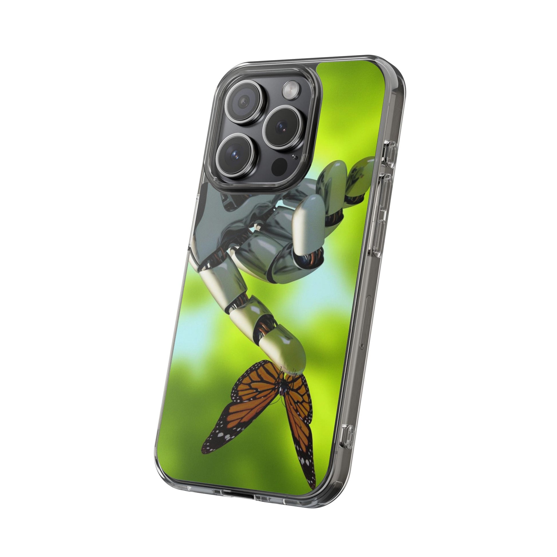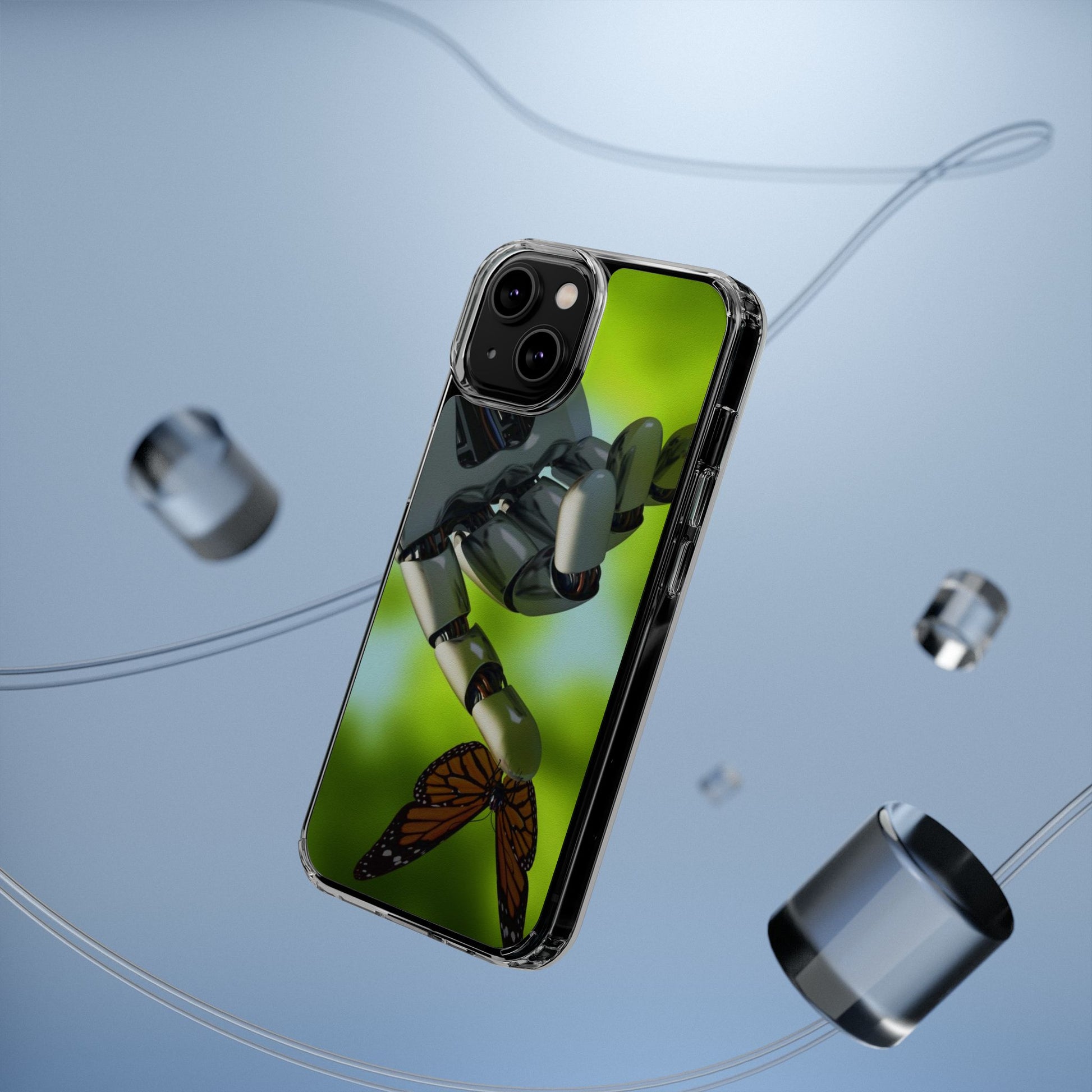 Clear Cases for iPhone 14 Series with Robotic hand and Butterfly.