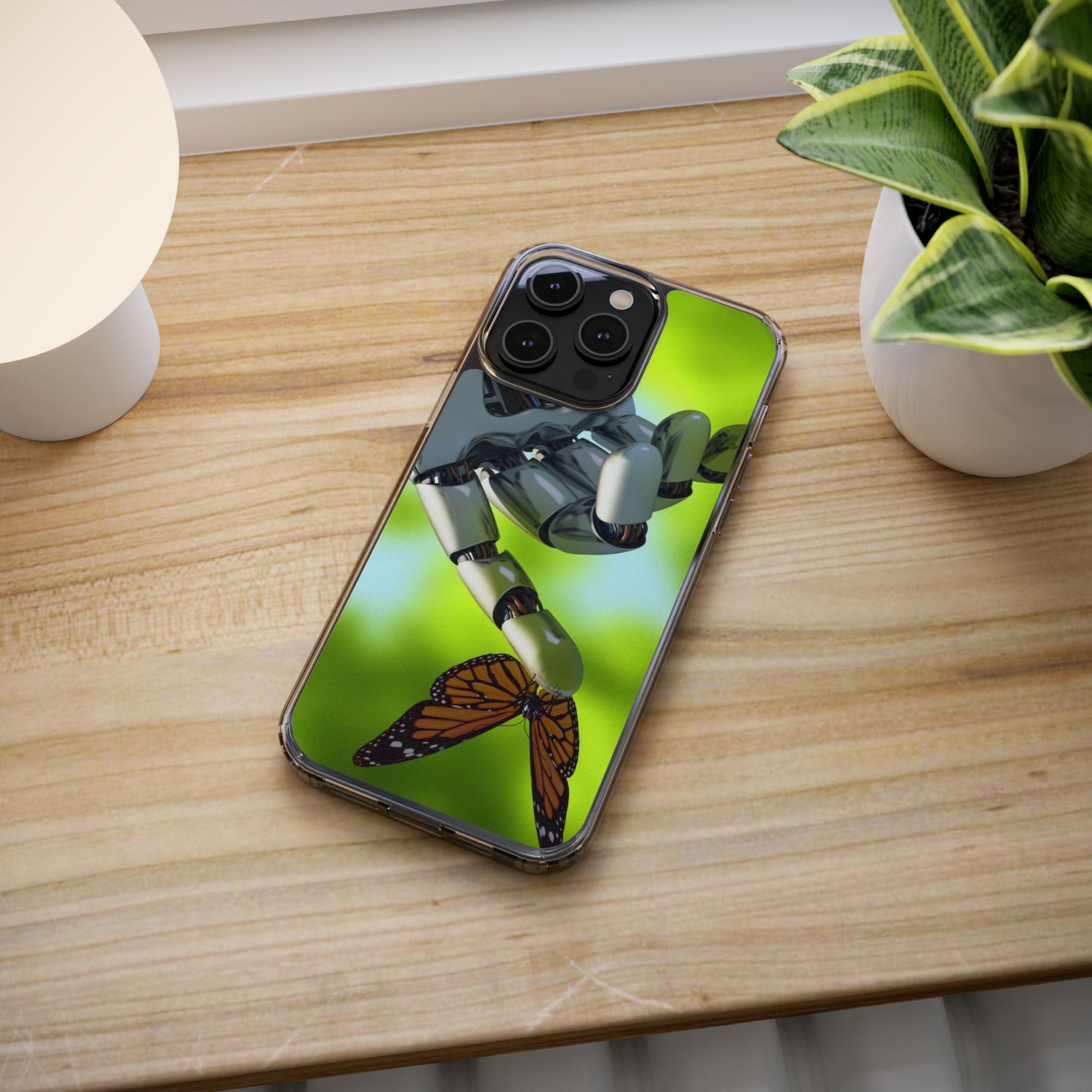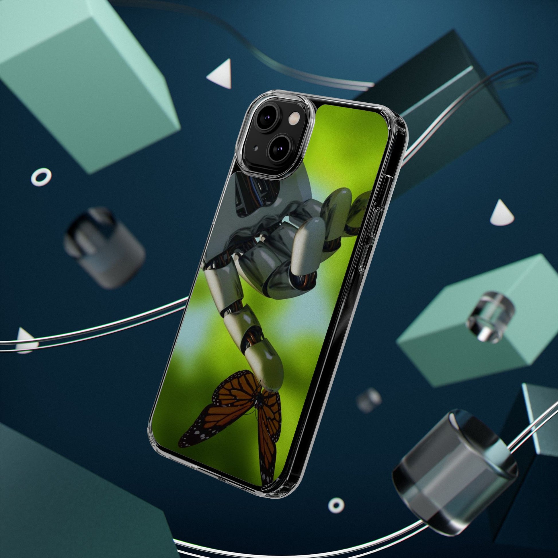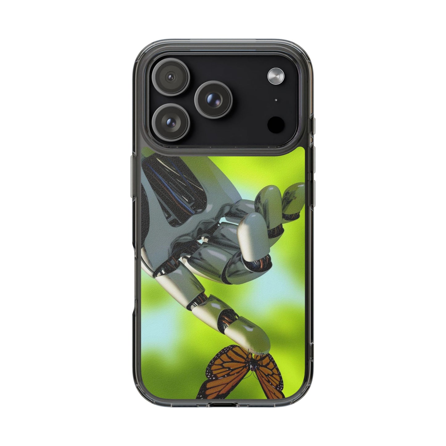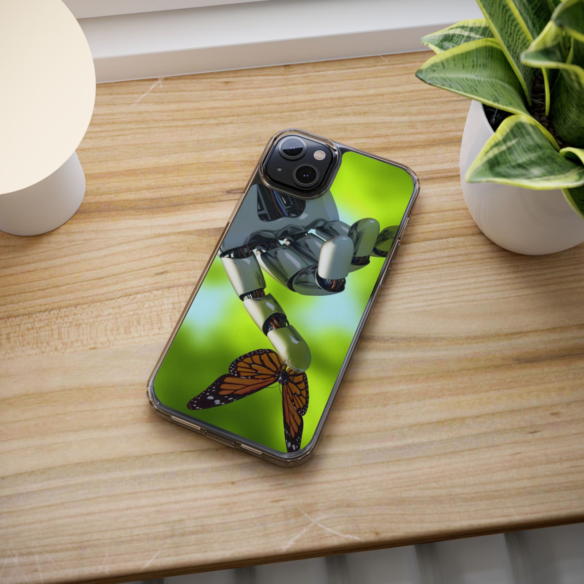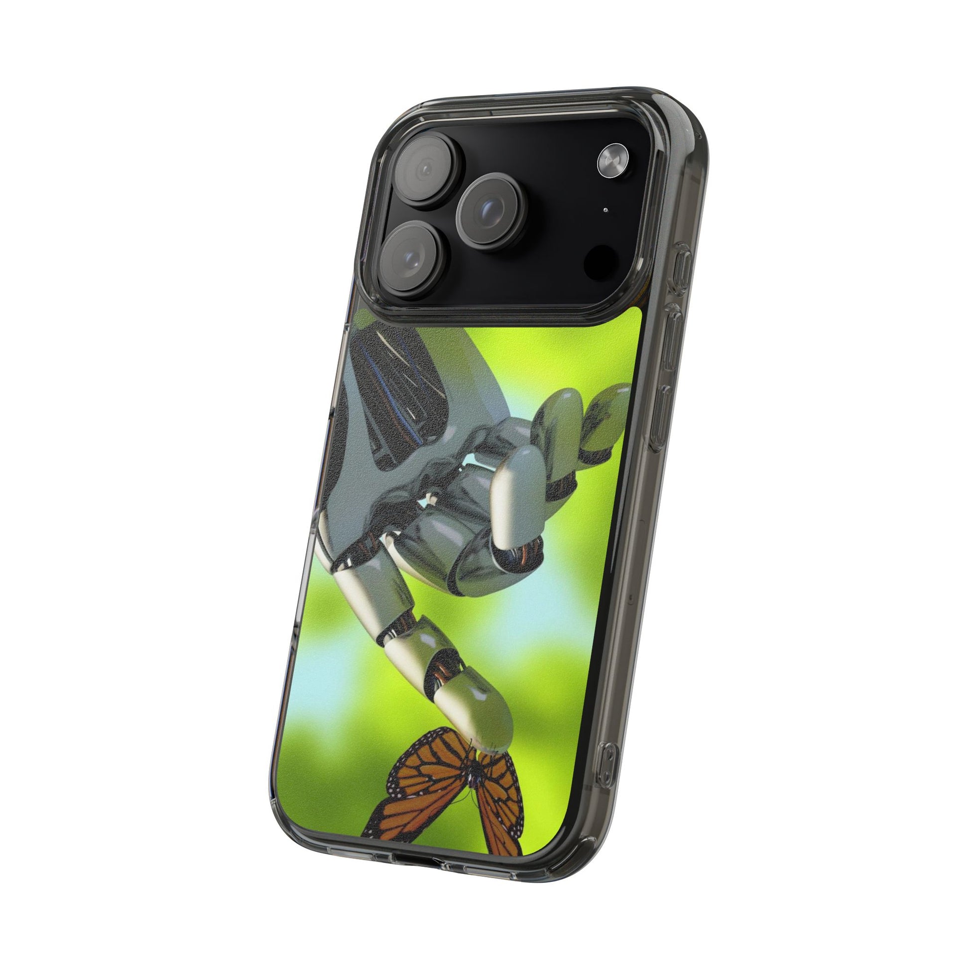 Clear Cases for iPhone 14 Series with Robotic hand and Butterfly.