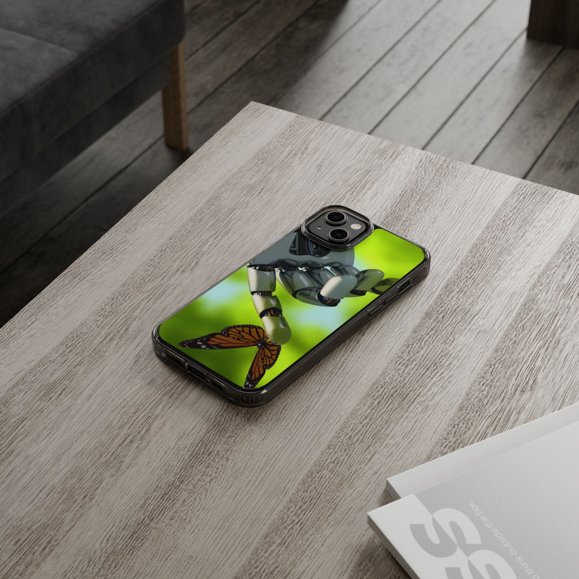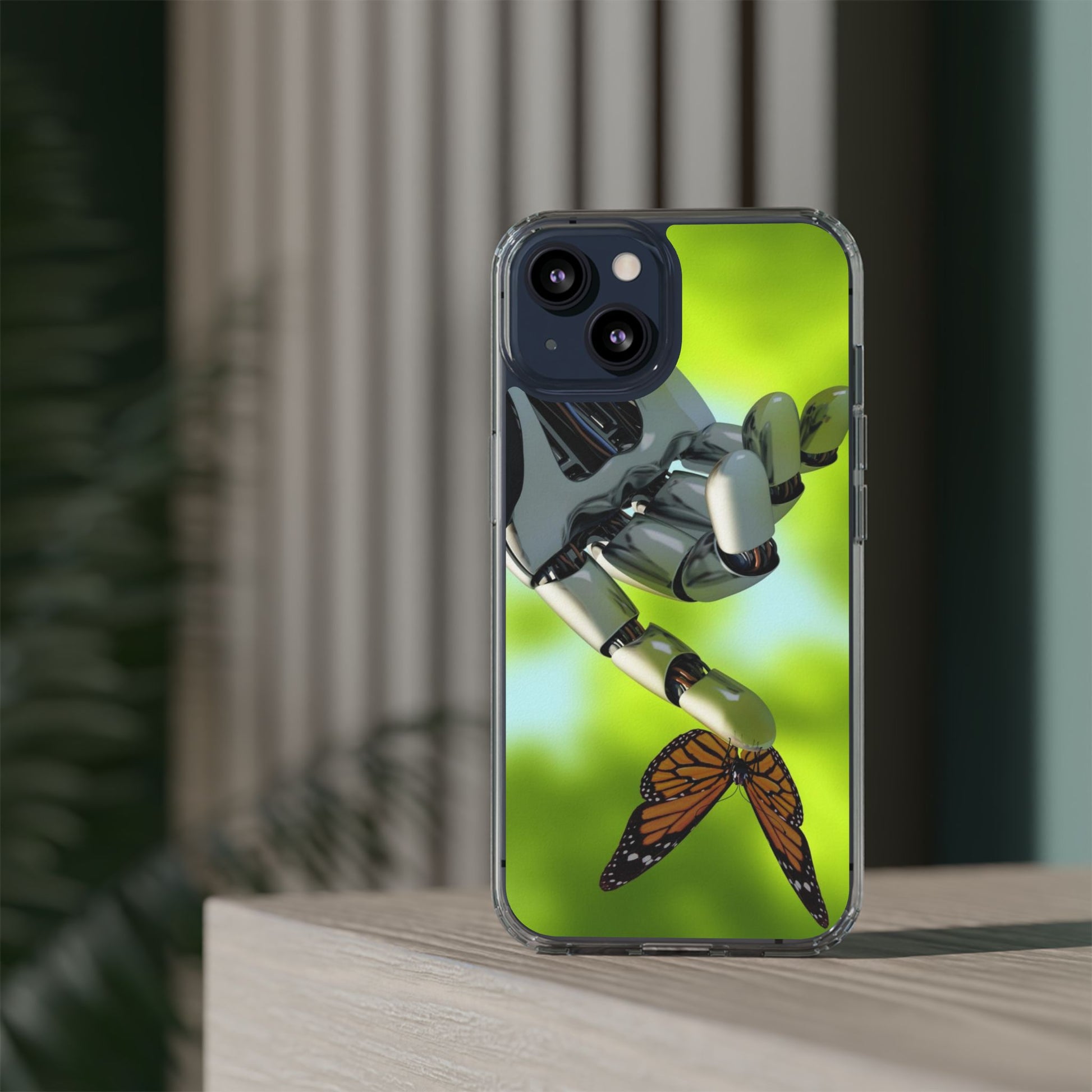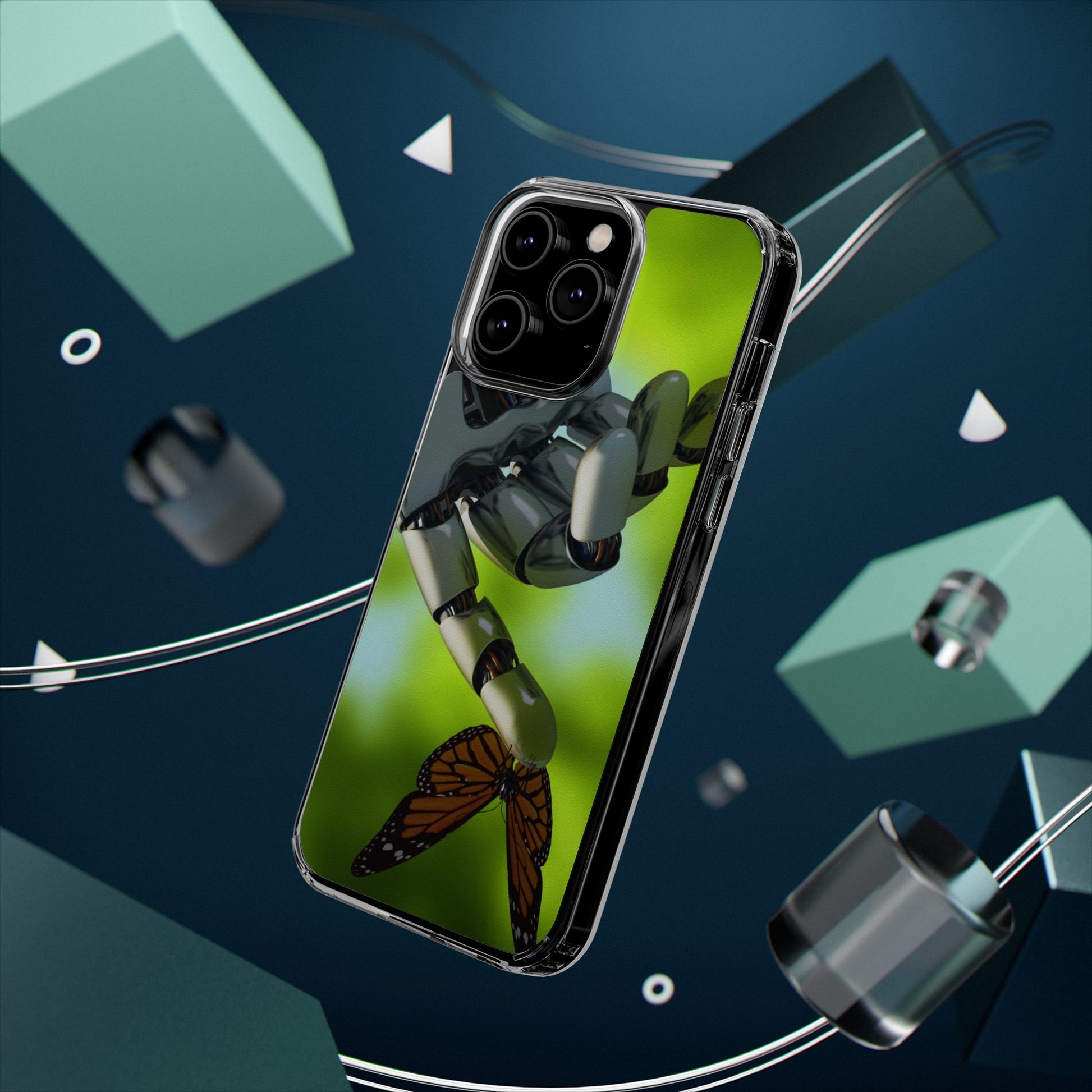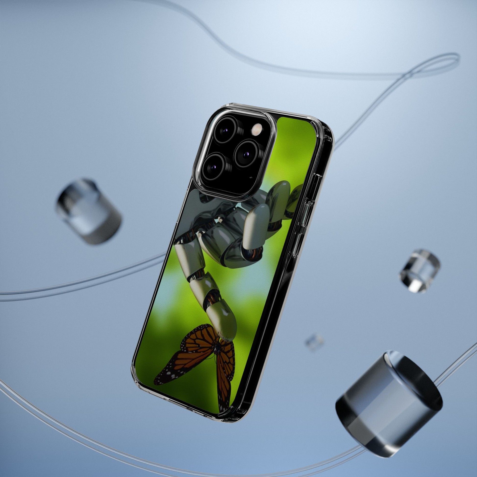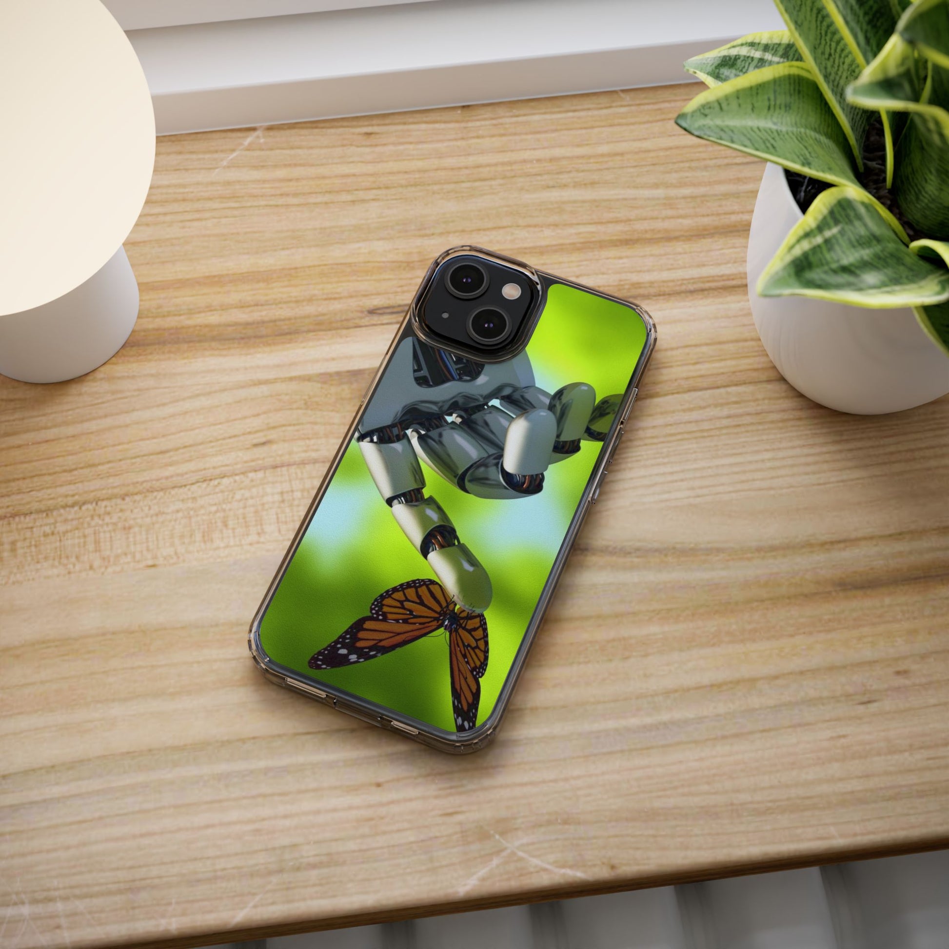 Clear Cases for iPhone 14 Series with Robotic hand and Butterfly.