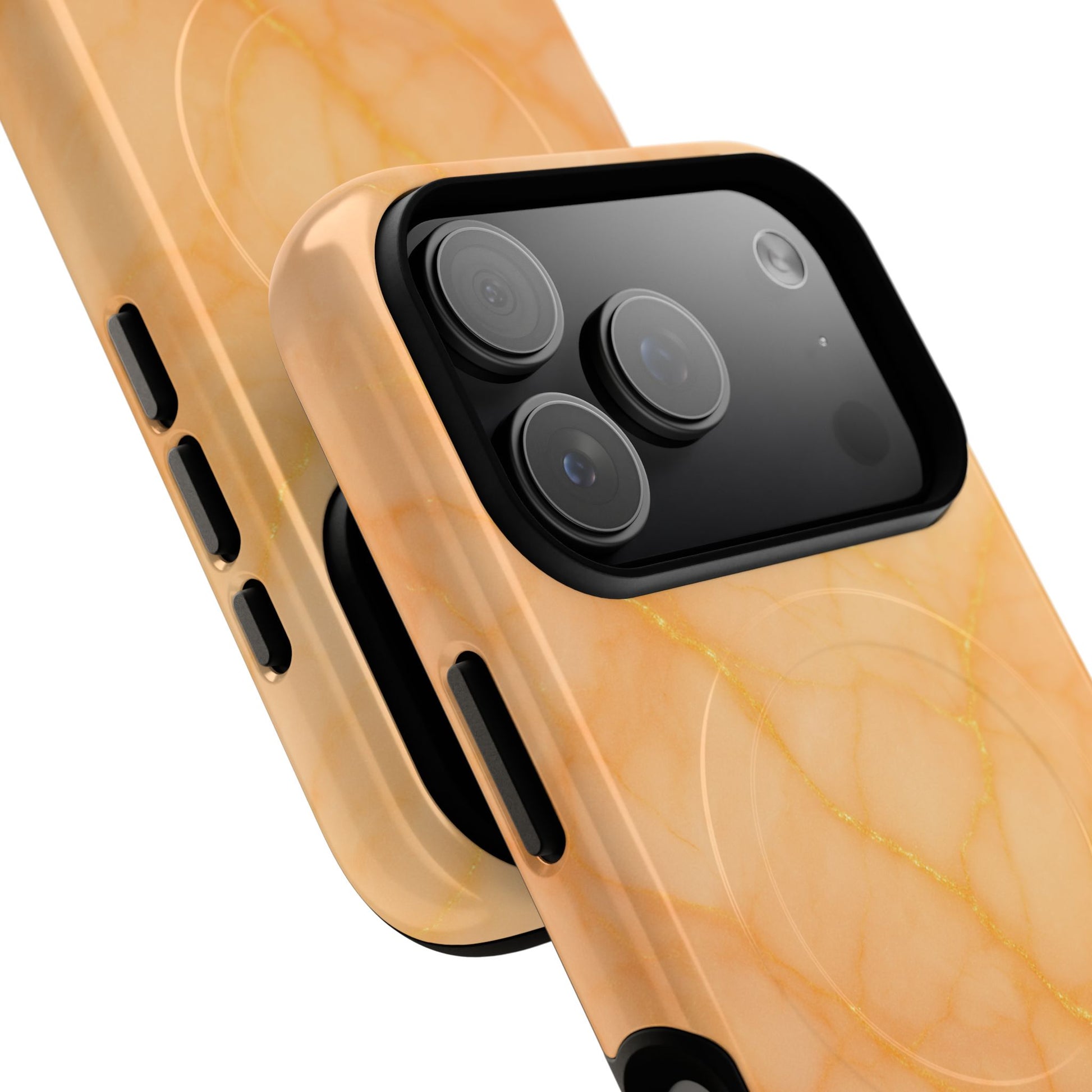 Warm, tactile, and quietly elegant — this tough magnetic phone case wraps your device in a soft amber marble that glows like late-afternoon light. The glossy/matte printed shell carries a full-coverage 3D ink transfer so the veining feels continuous around edges. Inside, a premium TPU silicone liner cushions drops while the rigid polycarbonate shell resists impacts and daily scuffs. The built-in magnetic module snaps to MagSafe® accessories for effortless use, and precise cutouts keep charging and ports unobstructed. It’s a protective everyday companion that reads like jewelry: discreet, durable, and designed to age gracefully with your phone.