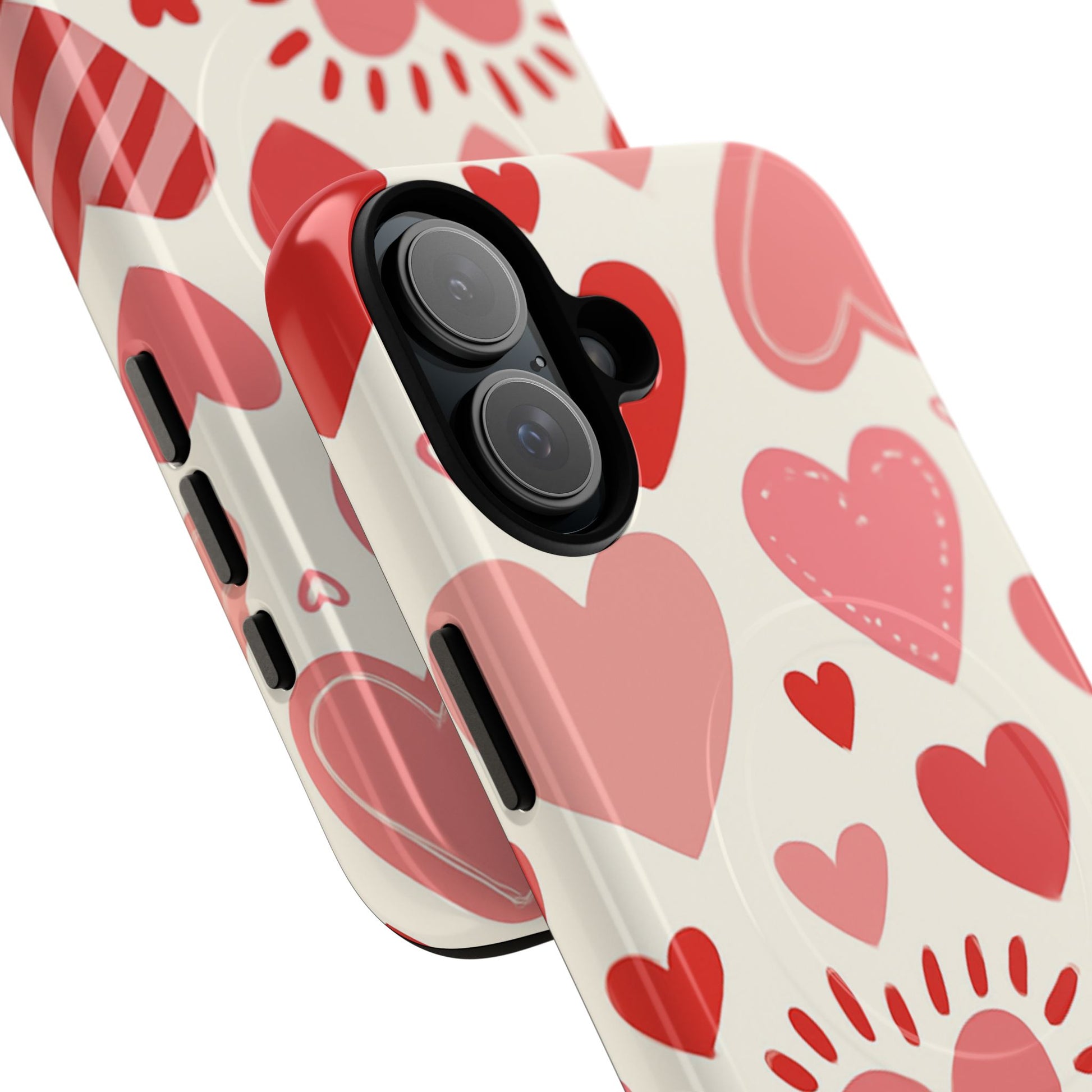 This slim, tough magnetic phone case brings playful romance to your daily carry. A dual-layer shell combines a glossy (or matte) 3D wrap print with a shock-absorbing TPU liner to protect against drops while showing off a hand-drawn scatter of hearts in warm reds and blushes. The MagSafe-compatible magnetic module keeps wireless chargers and accessories aligned, while precise cutouts leave ports and cameras unobstructed. Lightweight yet impact resistant, the case wears like a small, cheerful statement—great for someone who likes their tech protected and a little sentimental.