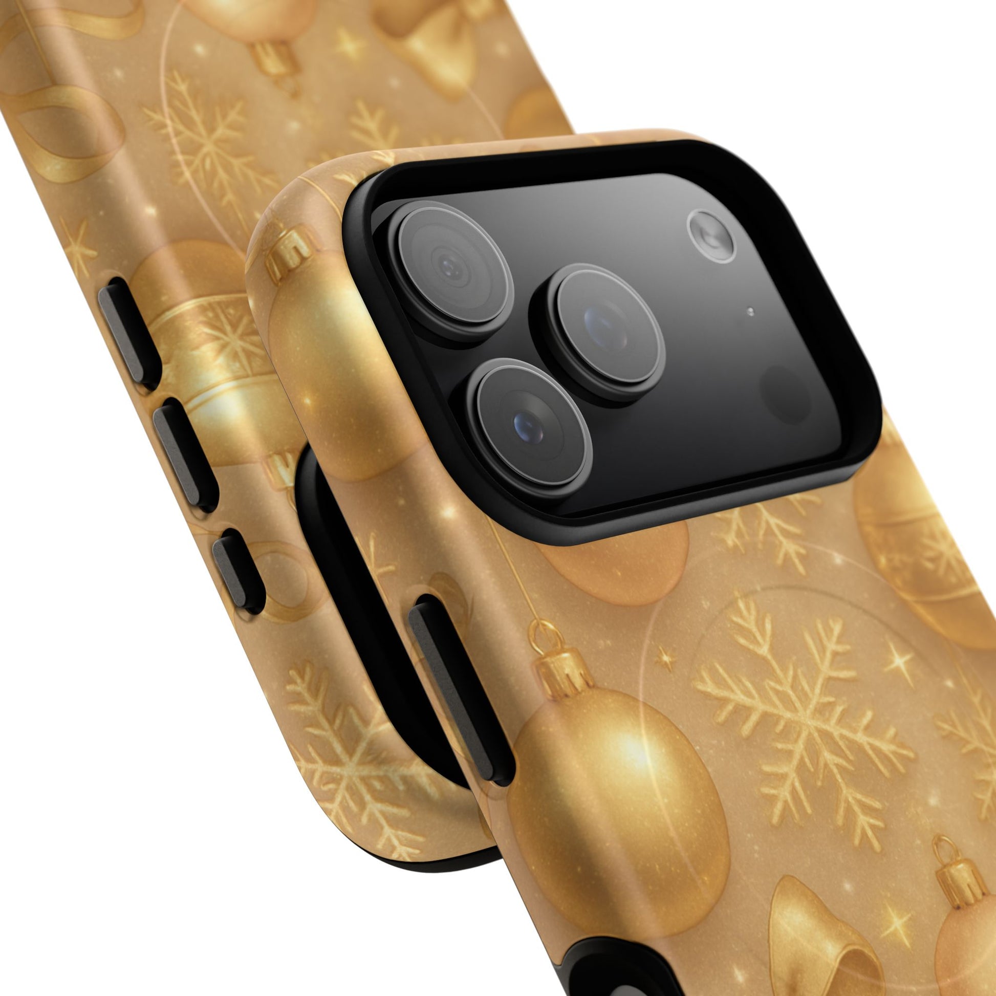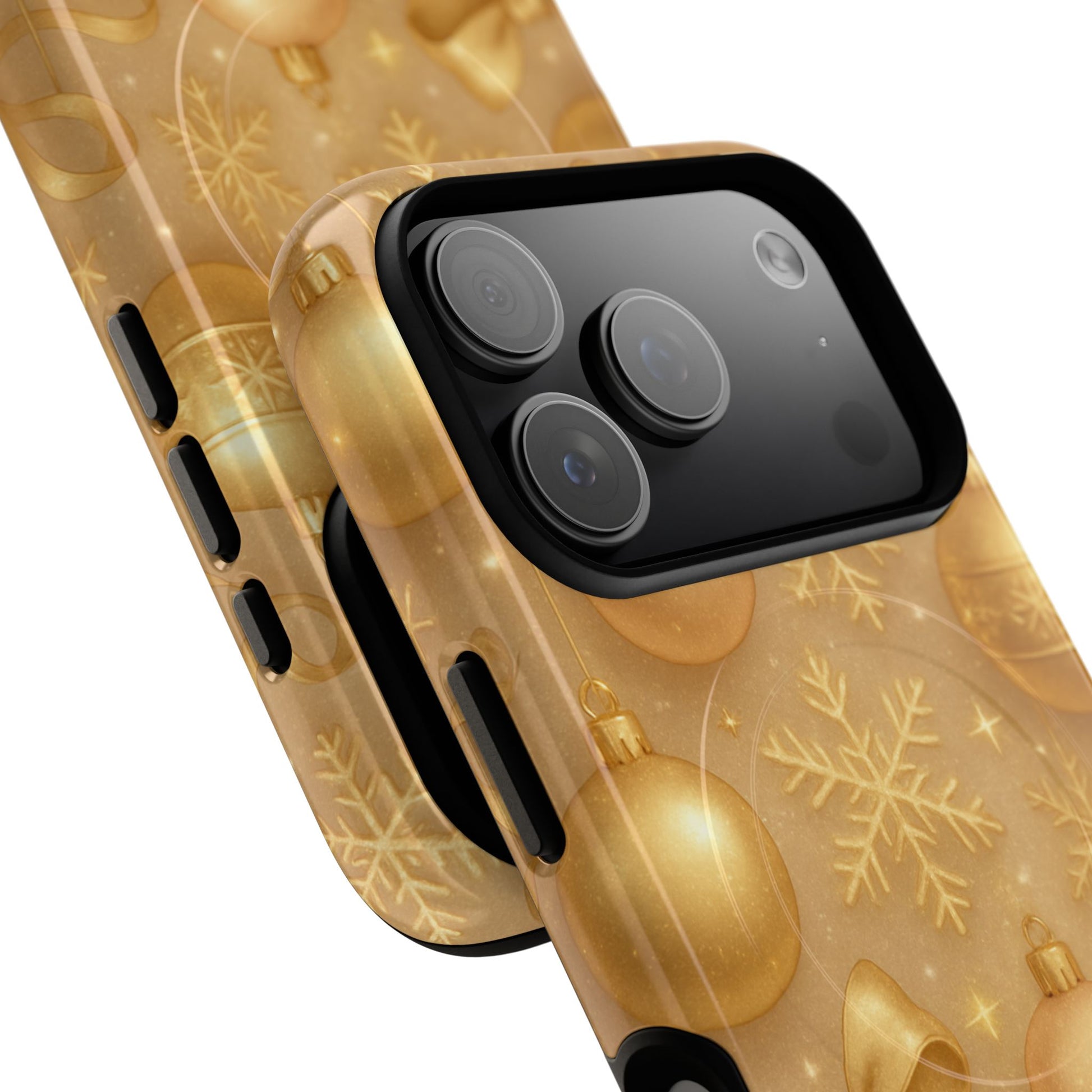 Wrap your phone in warm holiday glow with this durable magnetic phone case. A repeating pattern of golden ornaments, ribbons and snowflakes shimmers across the glossy or matte shell, turning everyday use into a little festive ritual. The dual-layer construction and TPU silicone liner cushion against drops, while the built-in magnetic module aligns with MagSafe® accessories so your charging and wallets snap on cleanly. It’s made from tough polycarbonate with precise port openings and a premium finish sourced from South Korea — designed to protect daily and celebrate seasonally.