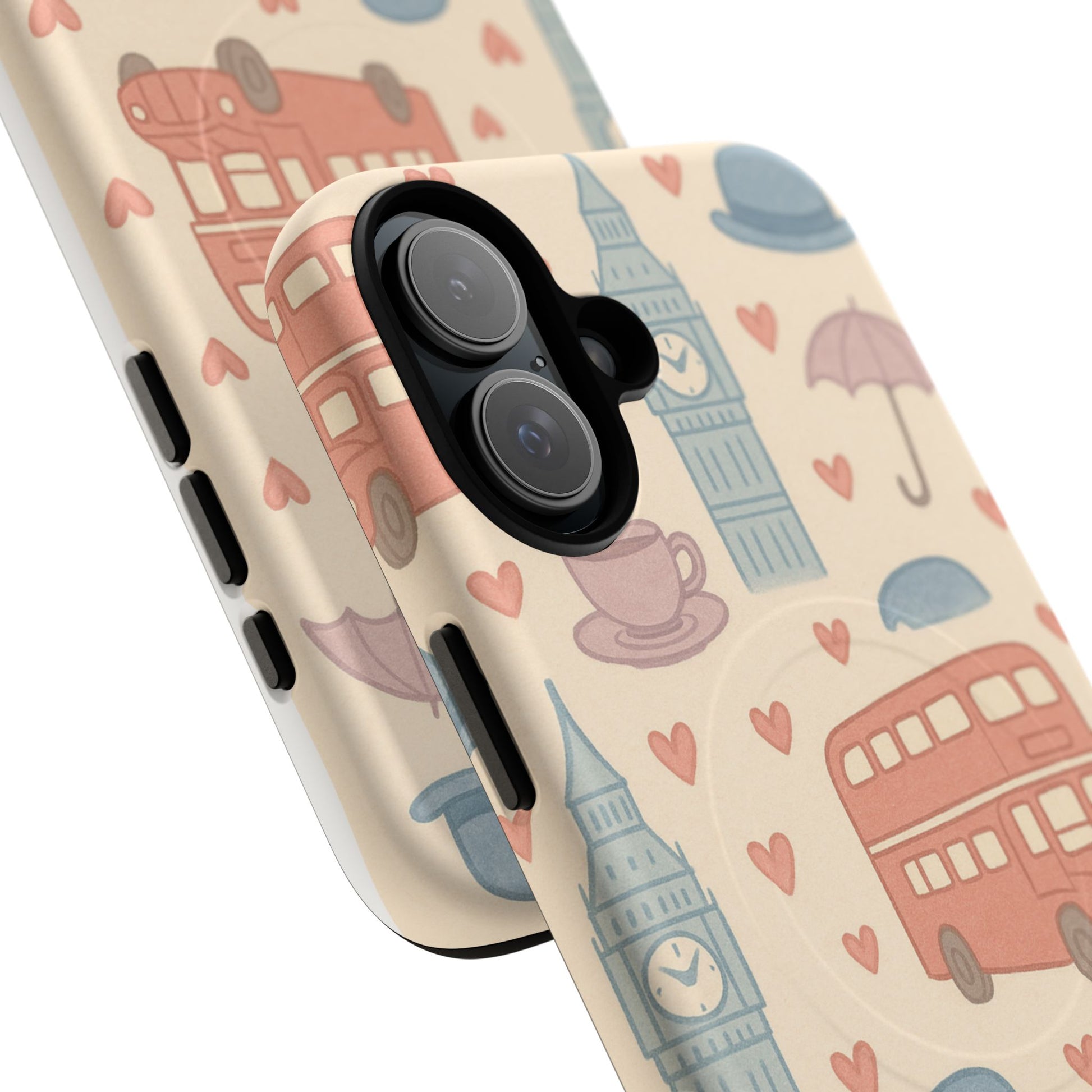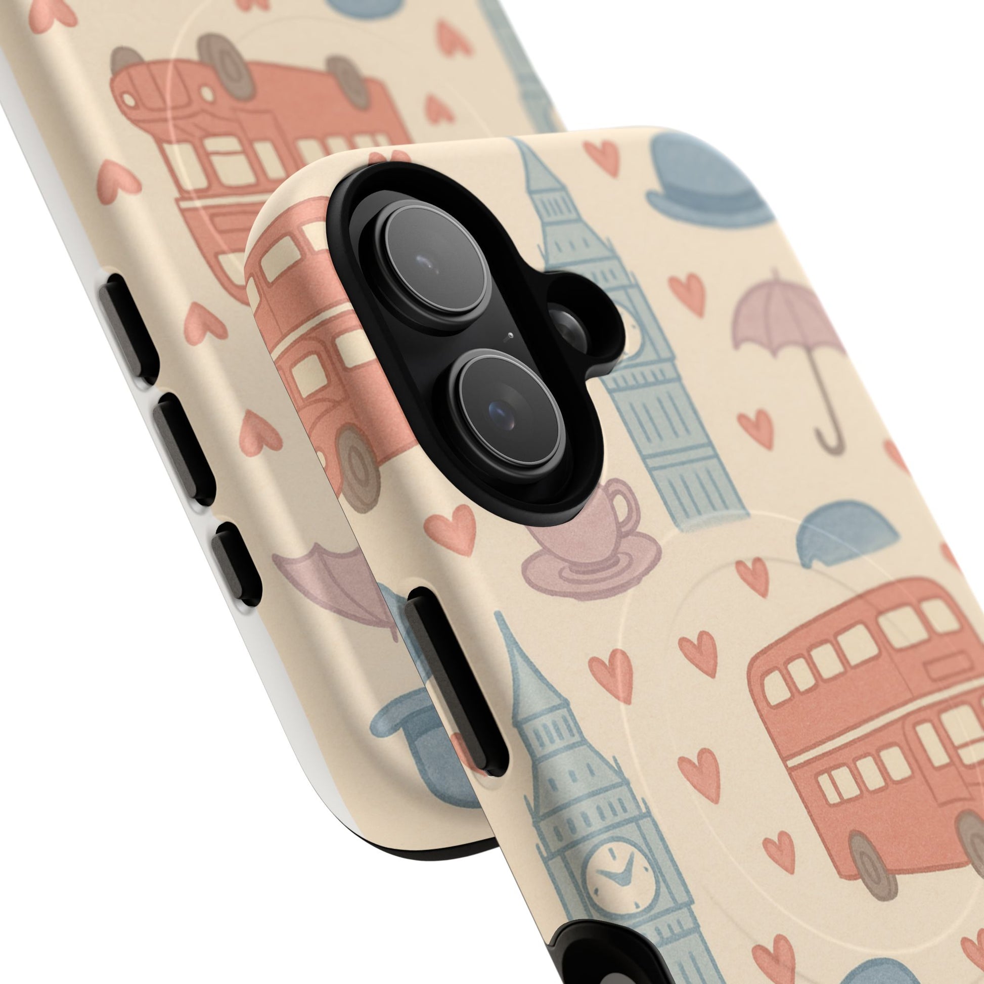 Carry a little London charm everywhere you go. This tough magnetic phone case wraps a soft pastel pattern of double-decker buses, Big Ben, teacups, umbrellas and bowler hats around a dual-layer shell that absorbs shocks while staying slim. The silicone TPU liner cushions drops and the glossy or matte outer finish keeps the print vibrant. MagSafe-compatible magnets snap to accessories for hands-free use. It’s the sort of everyday accessory that feels cheerful on your desk, cozy in your bag, and reassuring in the moment you drop your phone on cobblestones or concrete.