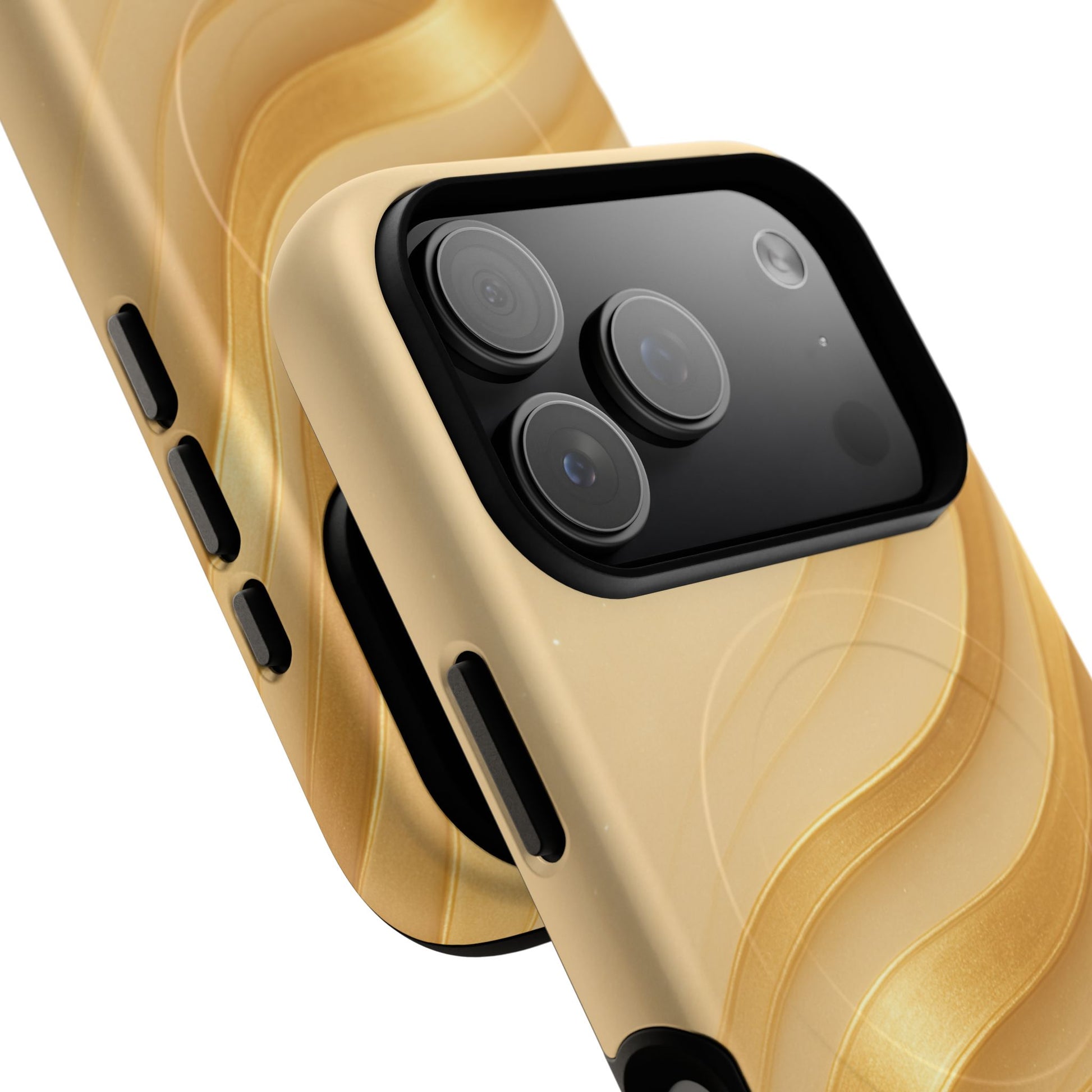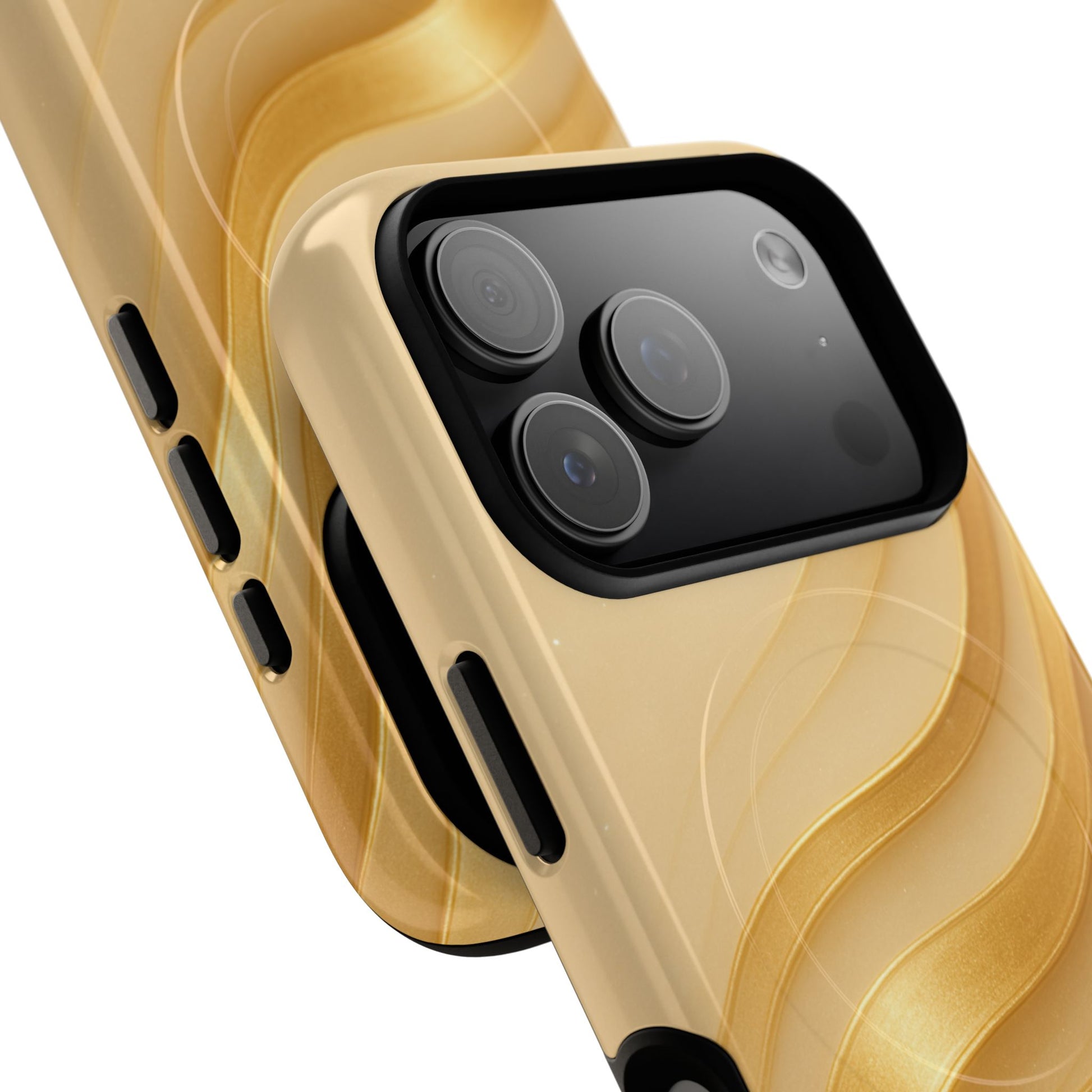 A sleek, protective phone case that combines tough, dual-layer construction with a sophisticated wave pattern in warm gold tones. The glossy or matte finish showcases a 3D wrap design that appears to flow across the back, while the TPU silicone liner cushions impacts and a polycarbonate shell resists daily wear. MagSafe-compatible magnets sit neatly inside so you can snap on chargers and accessories without removing the case. Slim around ports and buttons, it keeps your phone fully usable while giving it a refined, modern look that reads as both functional and artful.