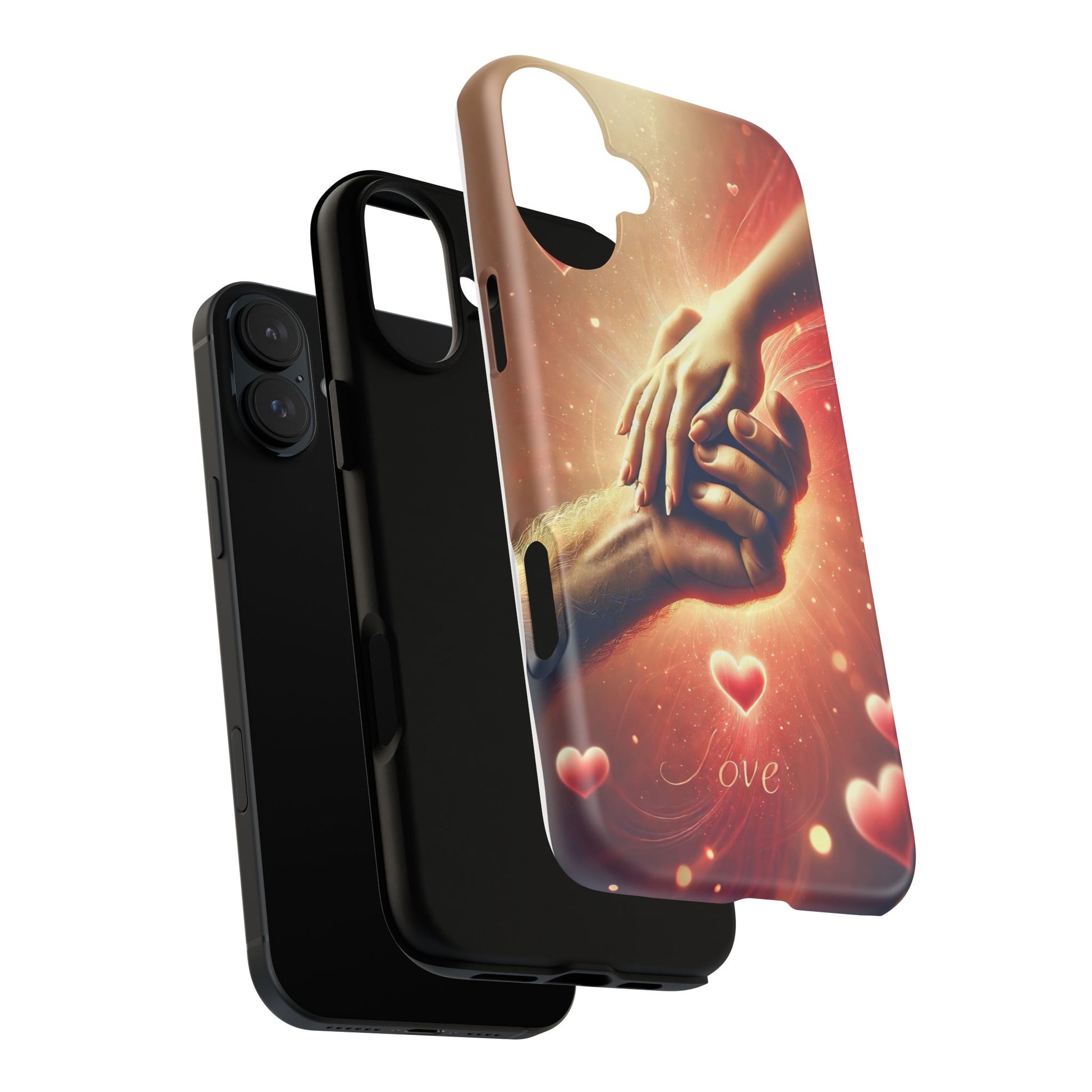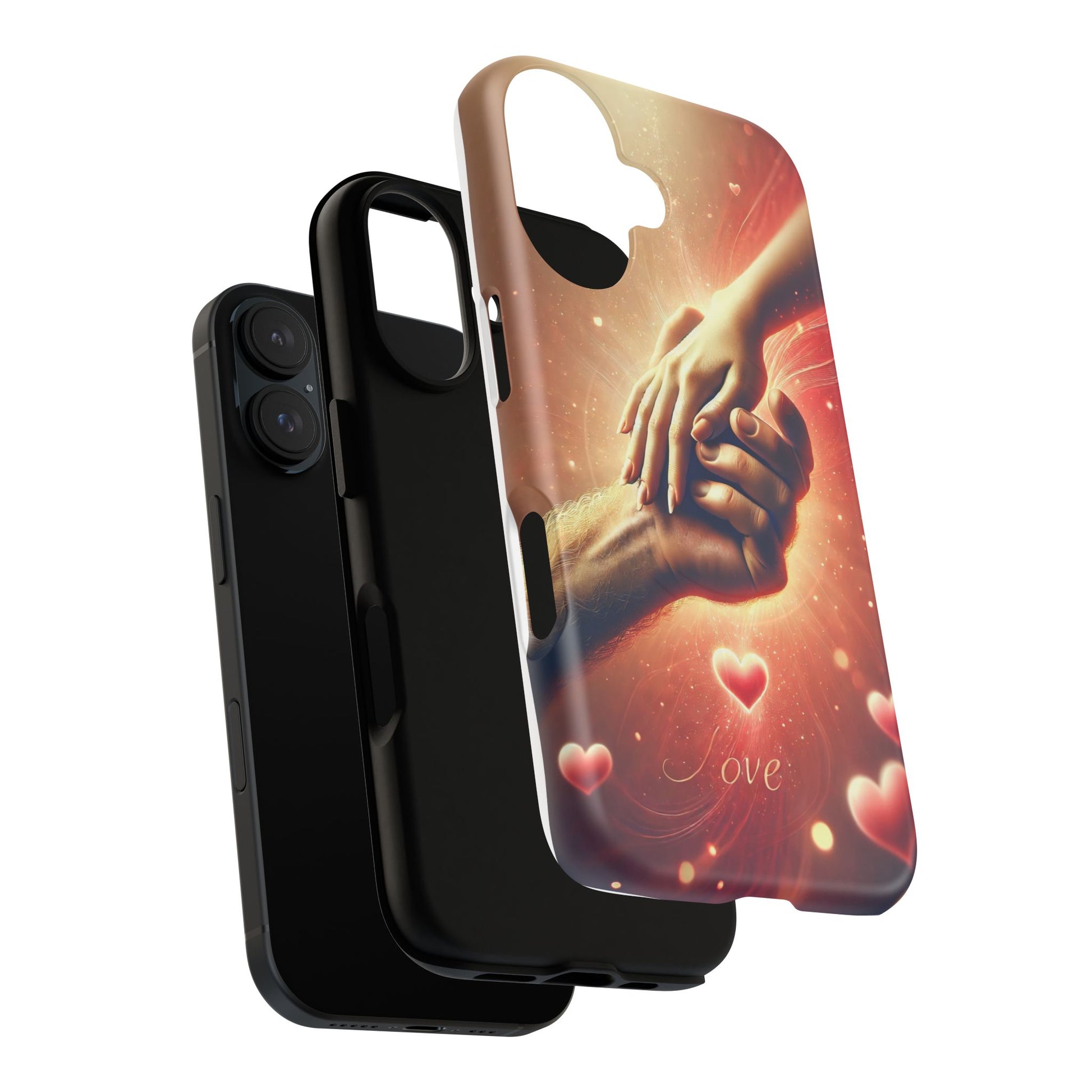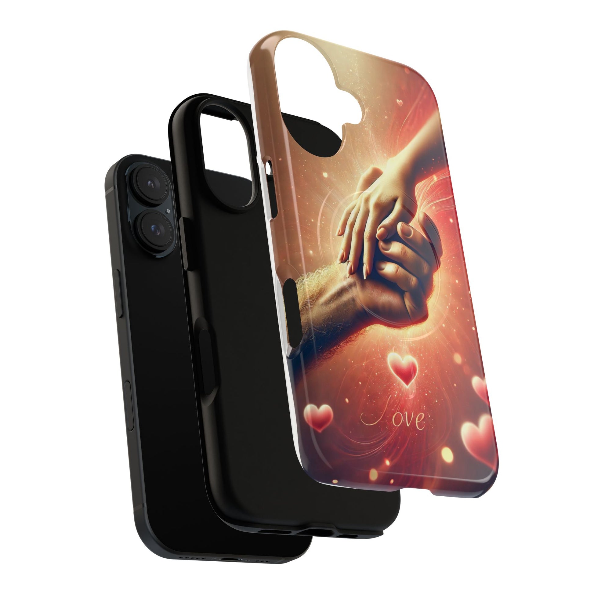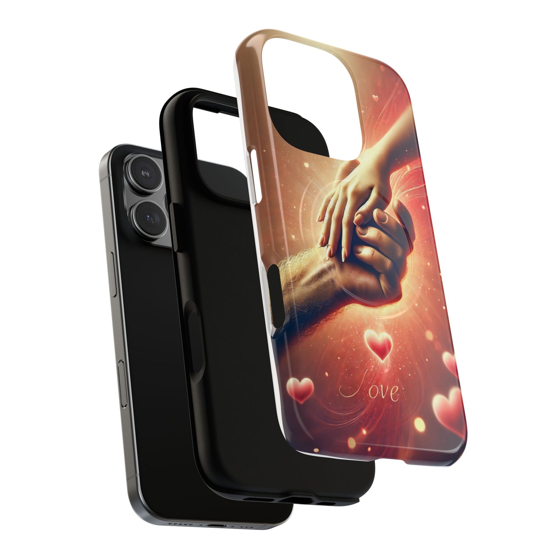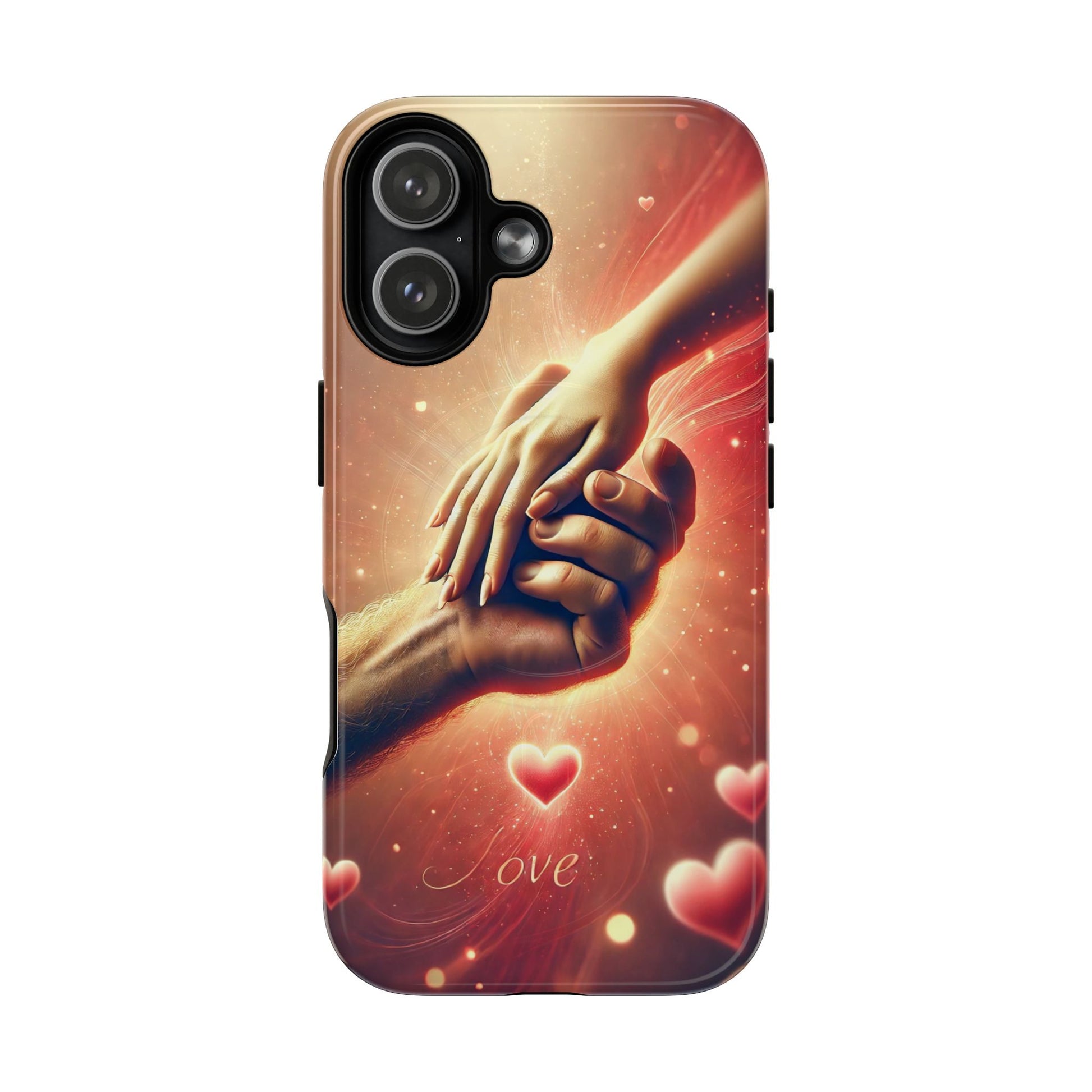 A tough magnetic phone case featuring a hands in love design. This phone case gives off a romantic and whimsical vibe, perfect for those who are in love or love love-themed products. Ideal for Valentine's Day, anniversaries, or as a sweet gift for a special someone.