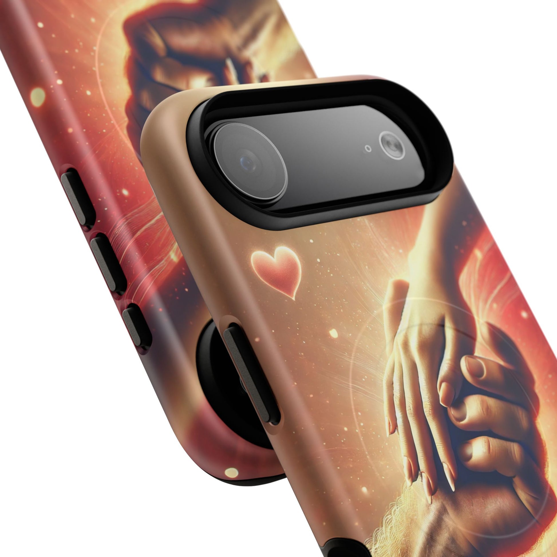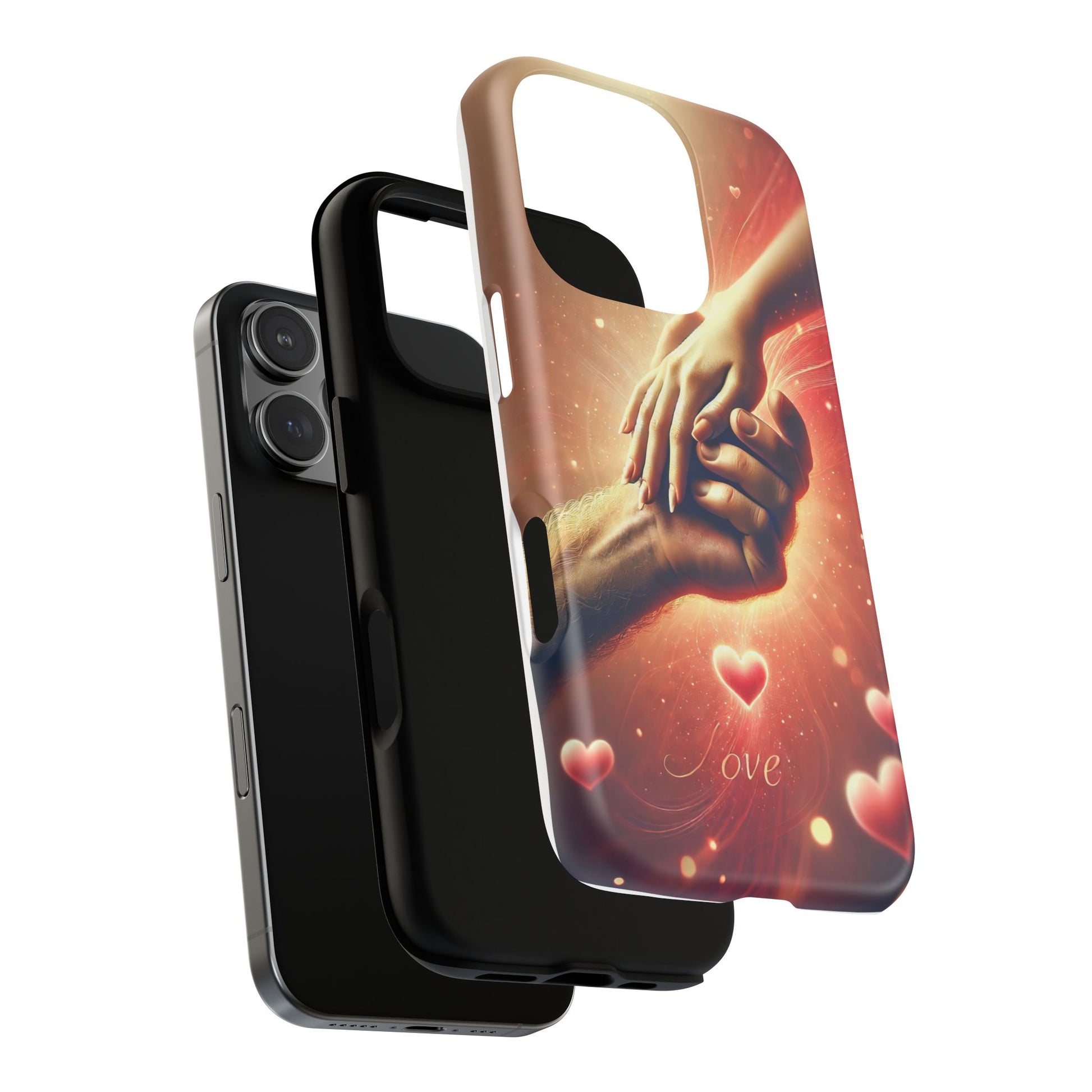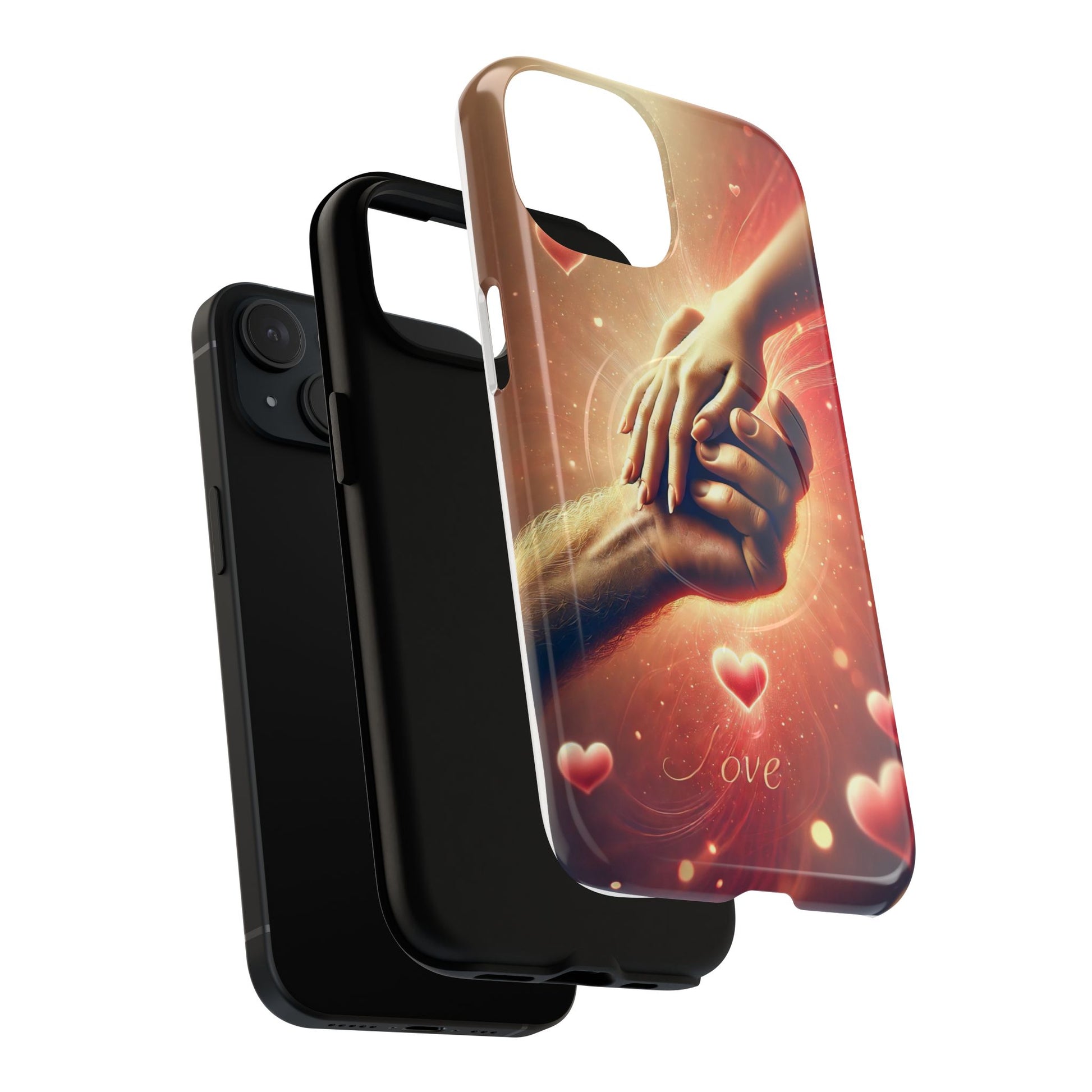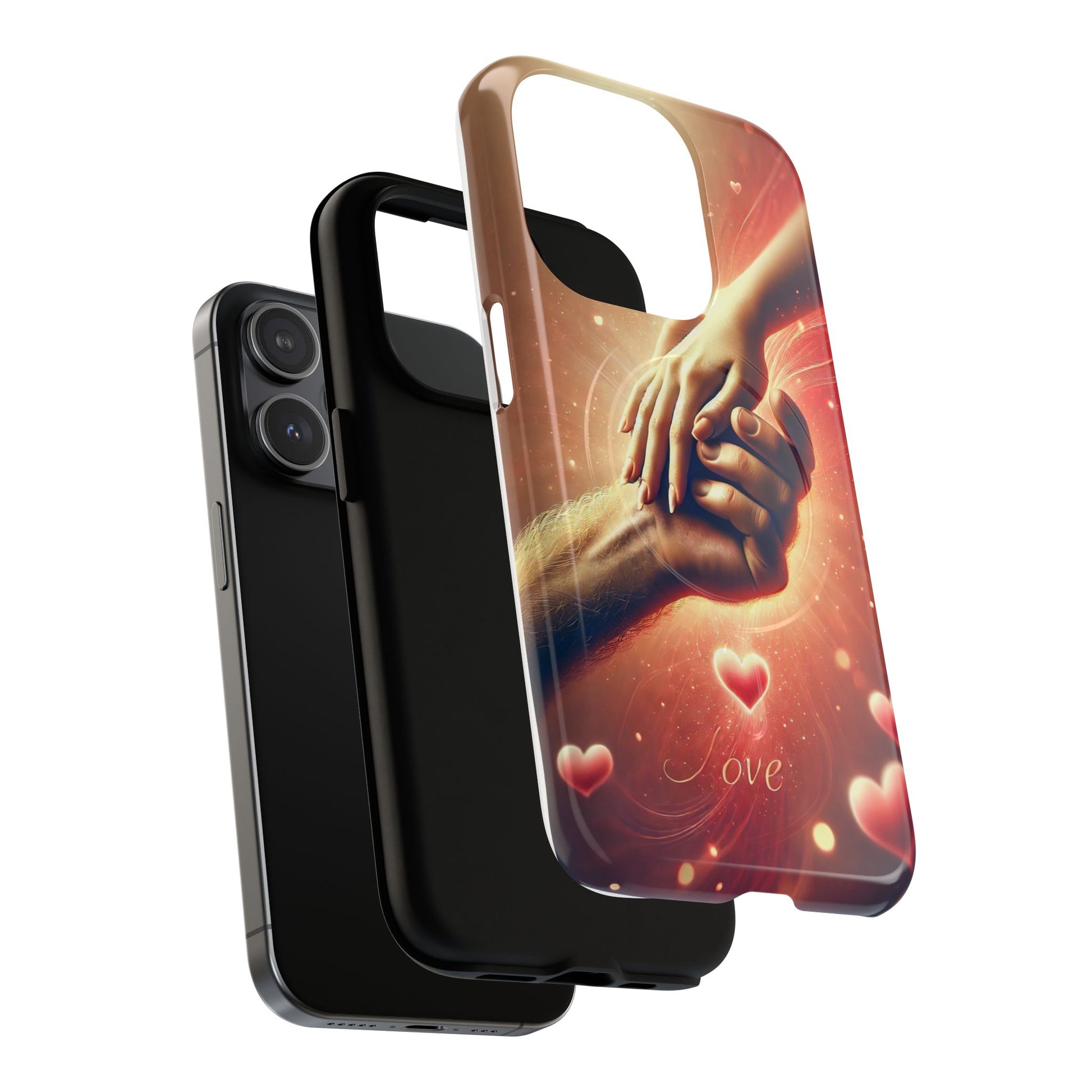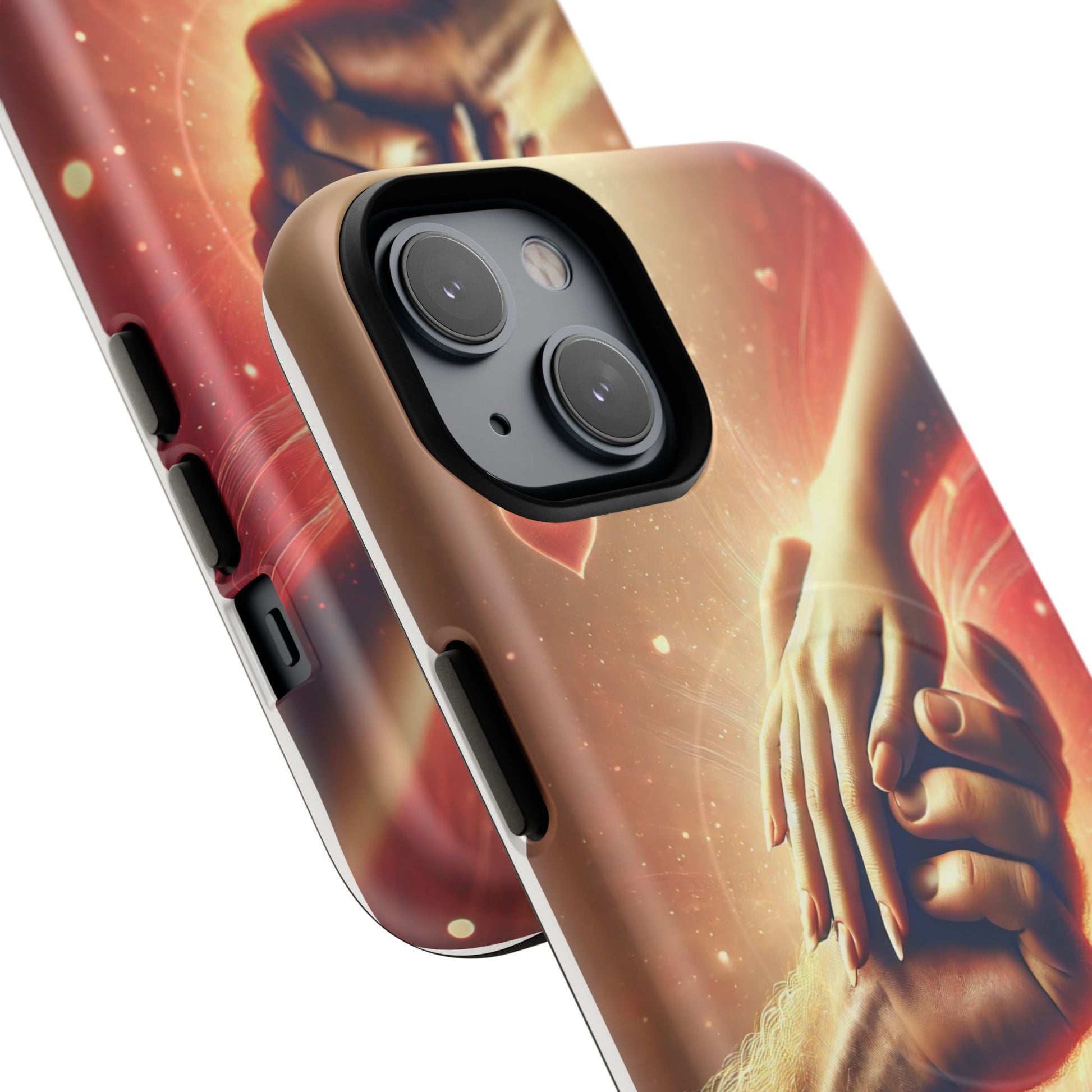 A tough magnetic phone case featuring a hands in love design. This phone case gives off a romantic and whimsical vibe, perfect for those who are in love or love love-themed products. Ideal for Valentine's Day, anniversaries, or as a sweet gift for a special someone.