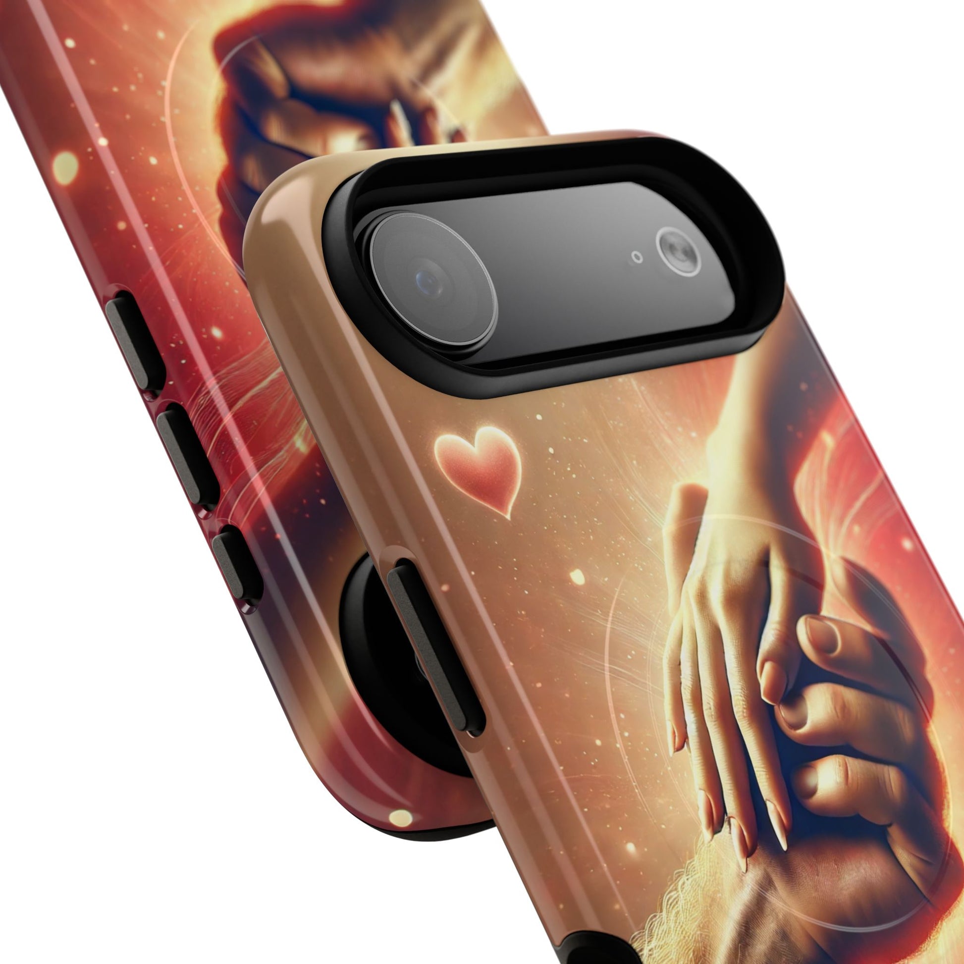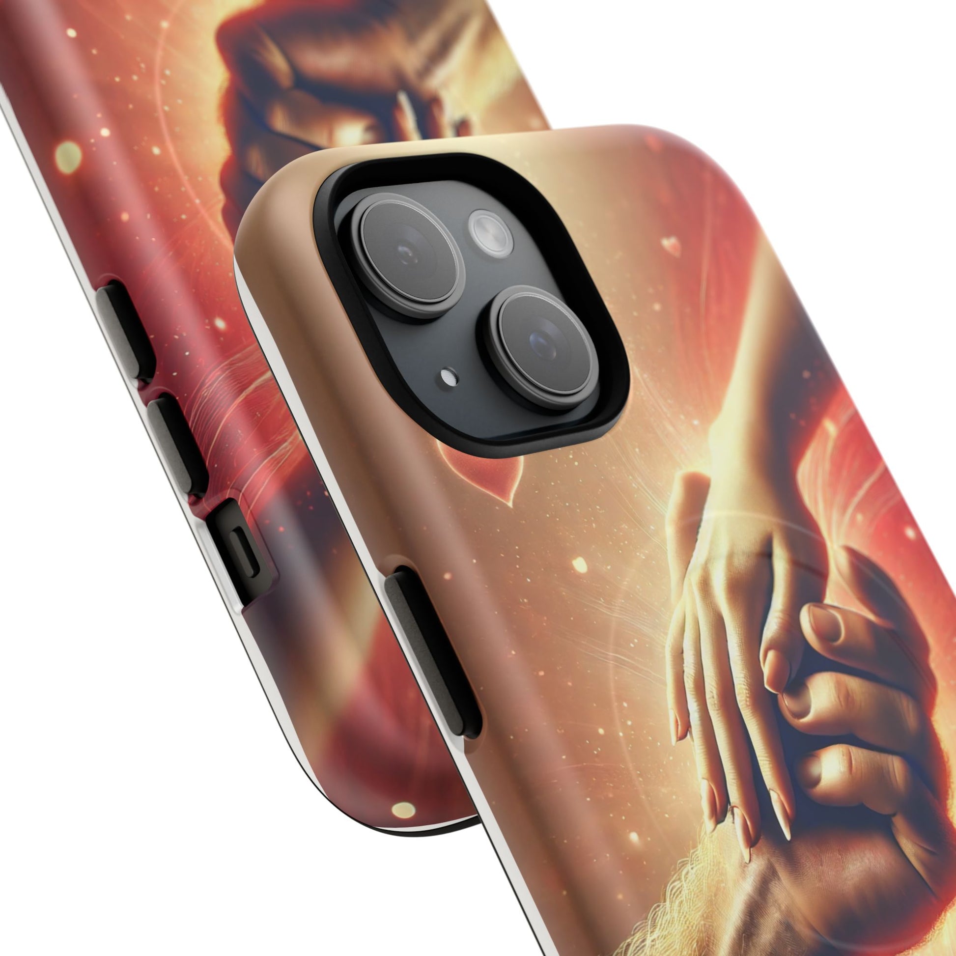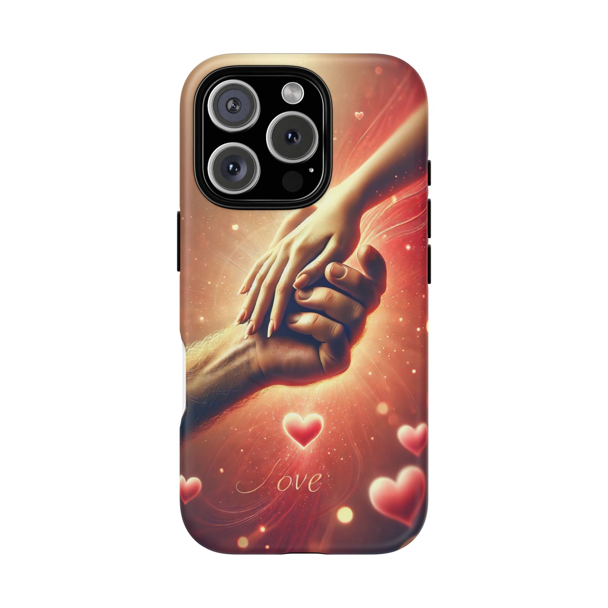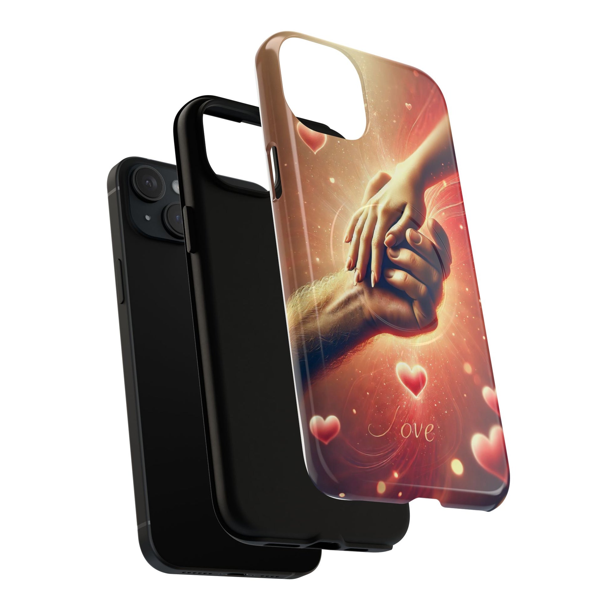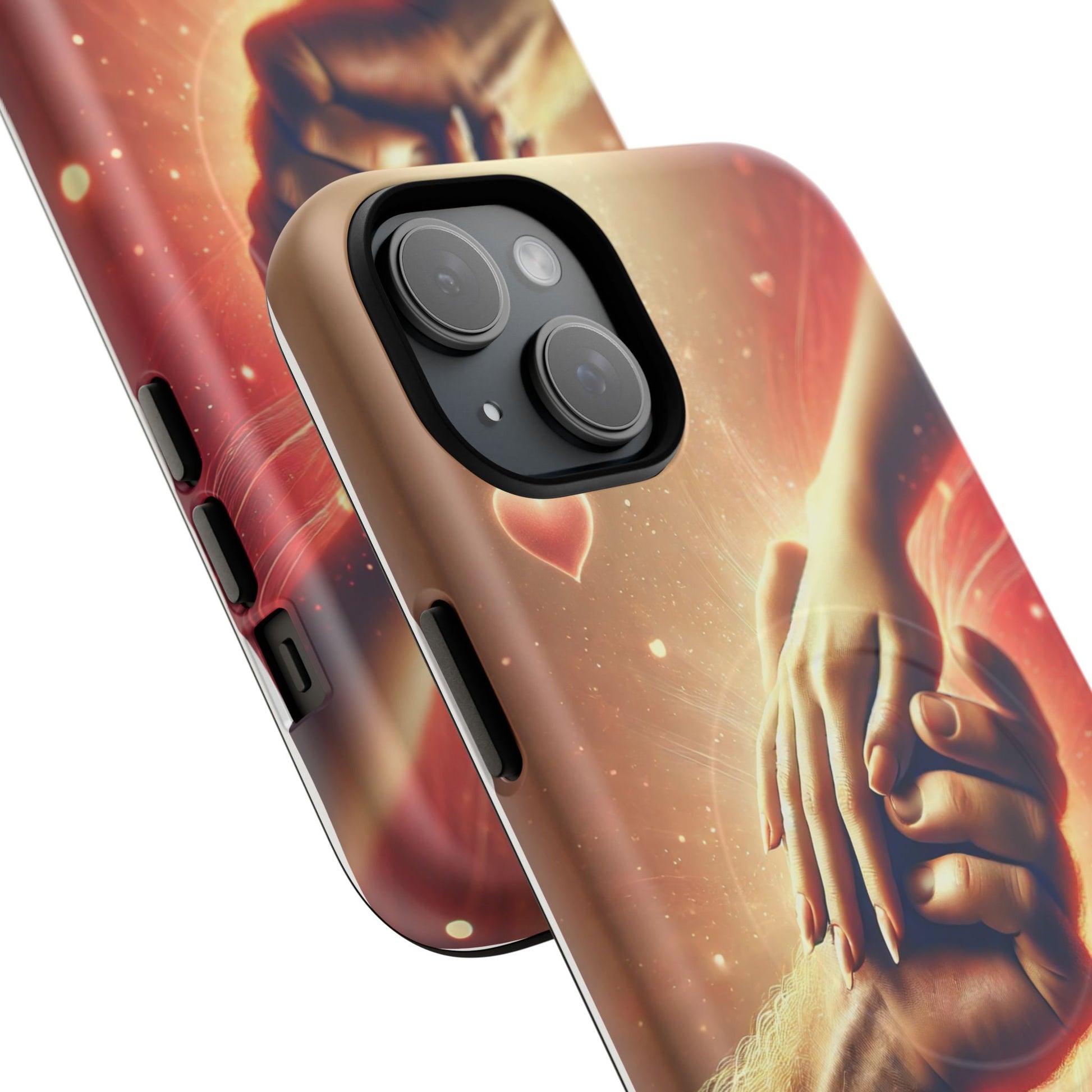 A tough magnetic phone case featuring a hands in love design. This phone case gives off a romantic and whimsical vibe, perfect for those who are in love or love love-themed products. Ideal for Valentine's Day, anniversaries, or as a sweet gift for a special someone.