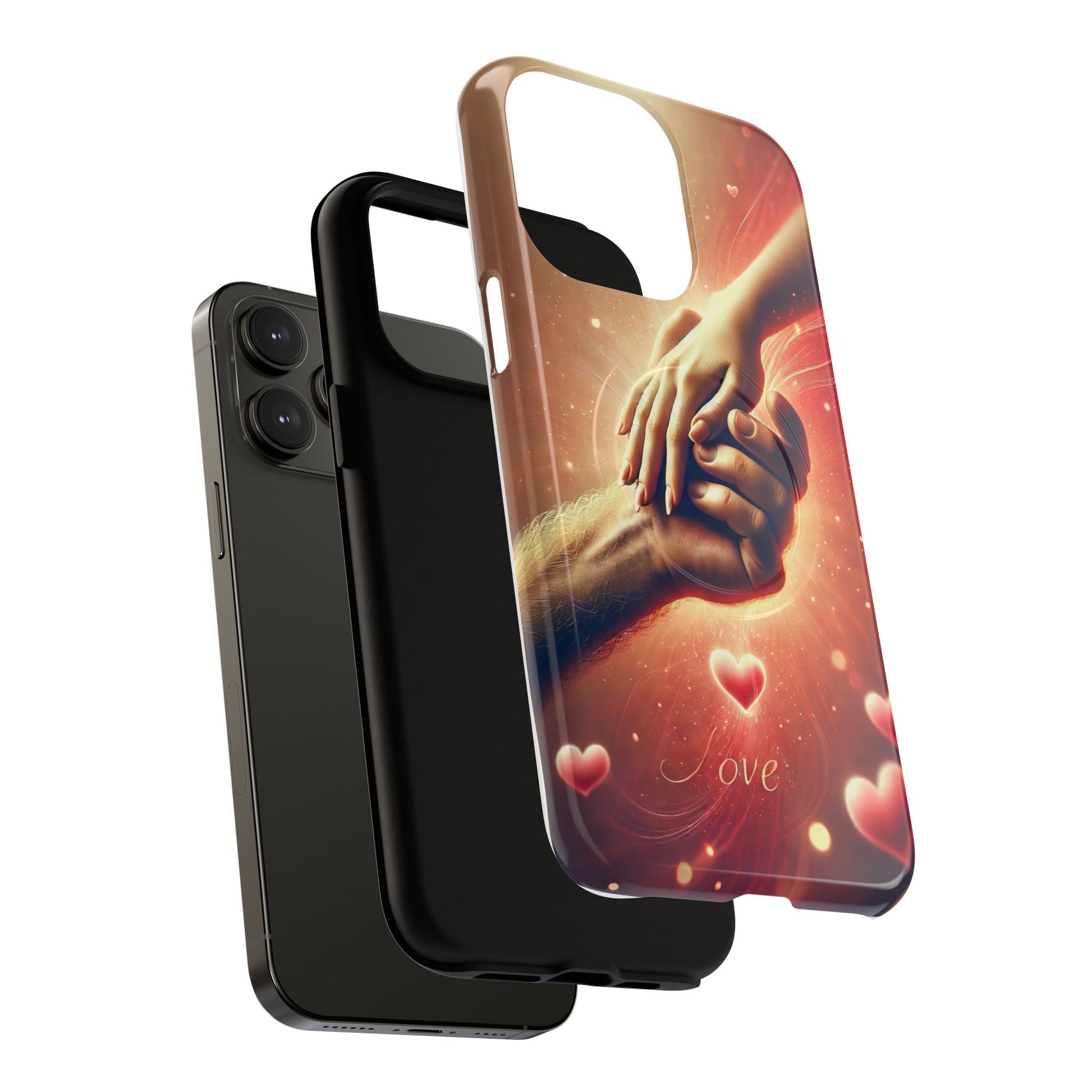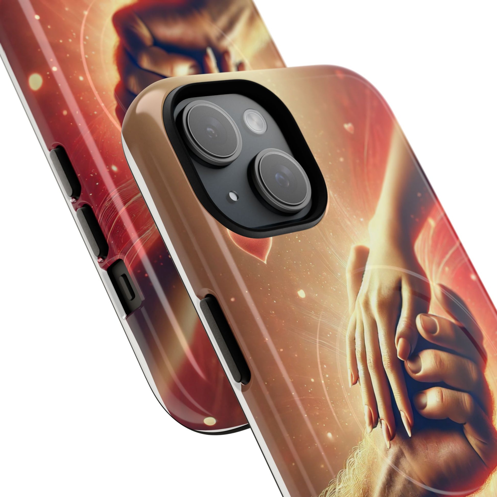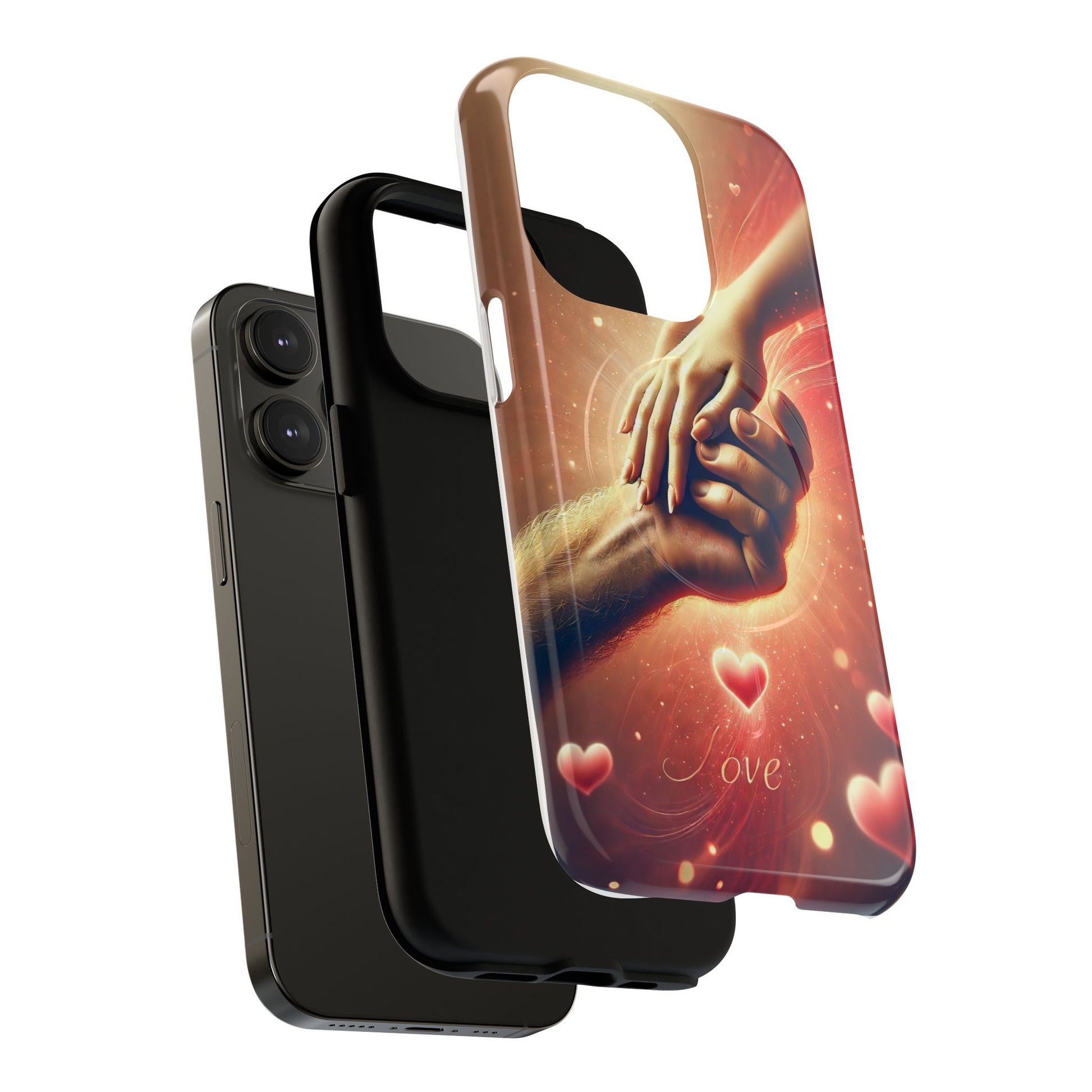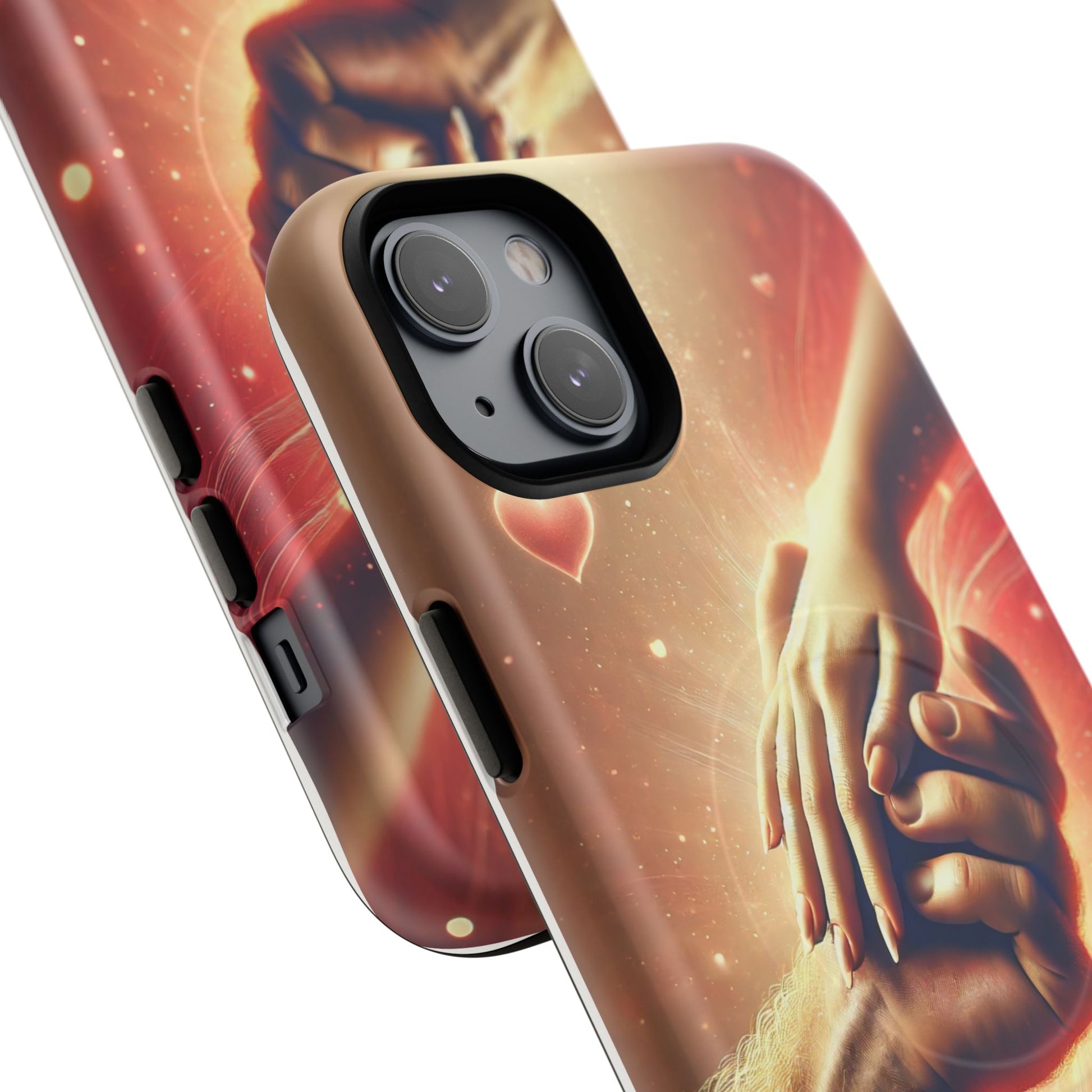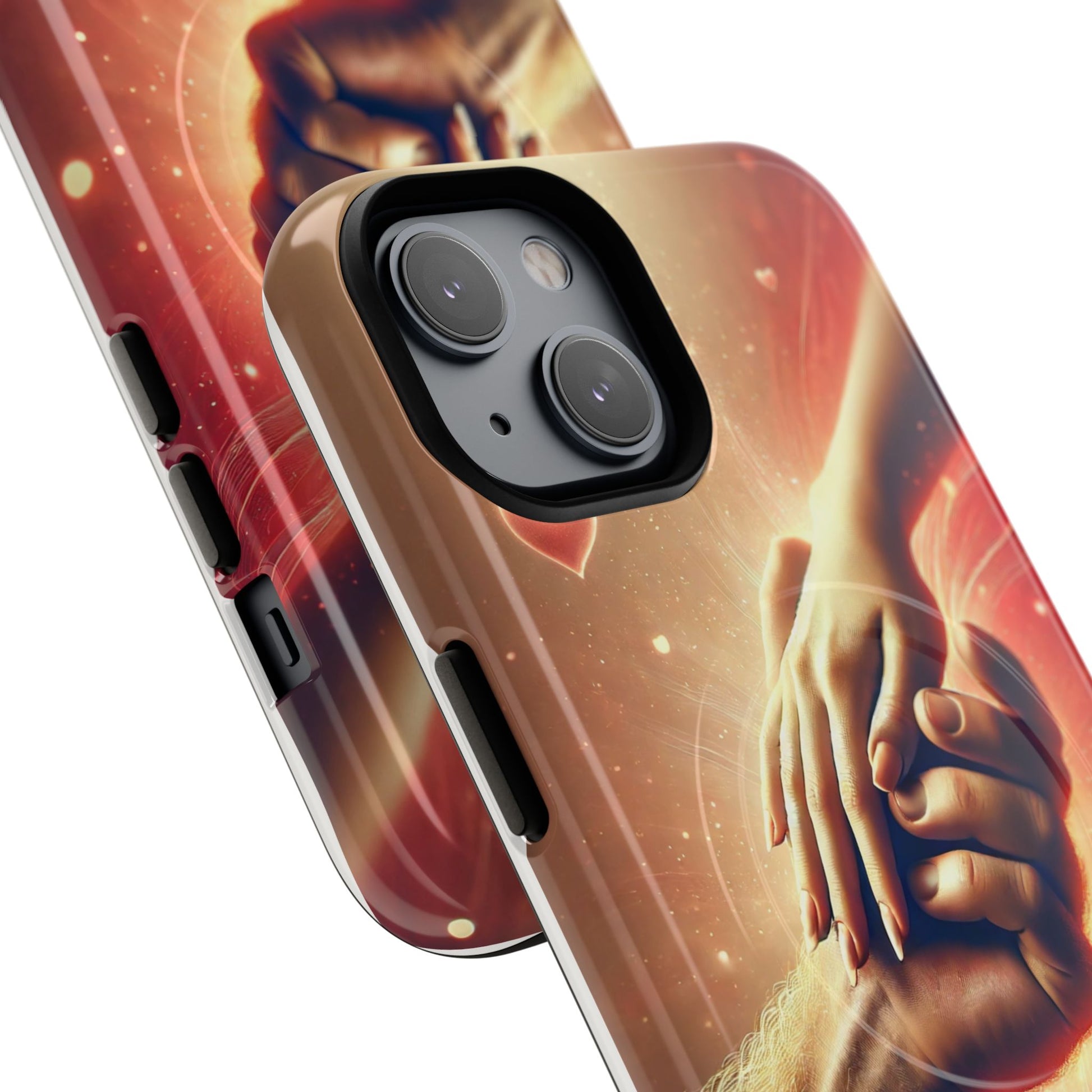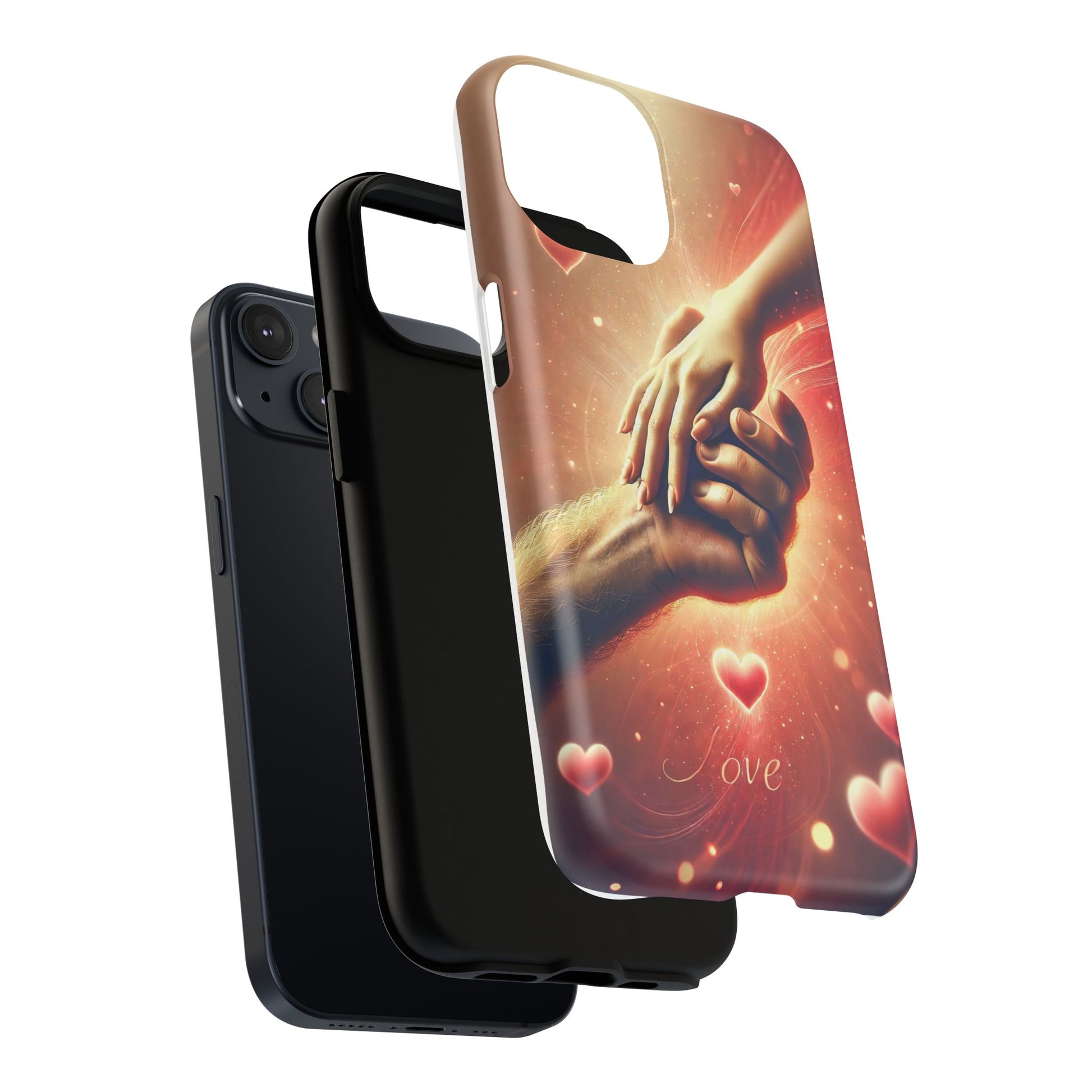 A tough magnetic phone case featuring a hands in love design. This phone case gives off a romantic and whimsical vibe, perfect for those who are in love or love love-themed products. Ideal for Valentine's Day, anniversaries, or as a sweet gift for a special someone.