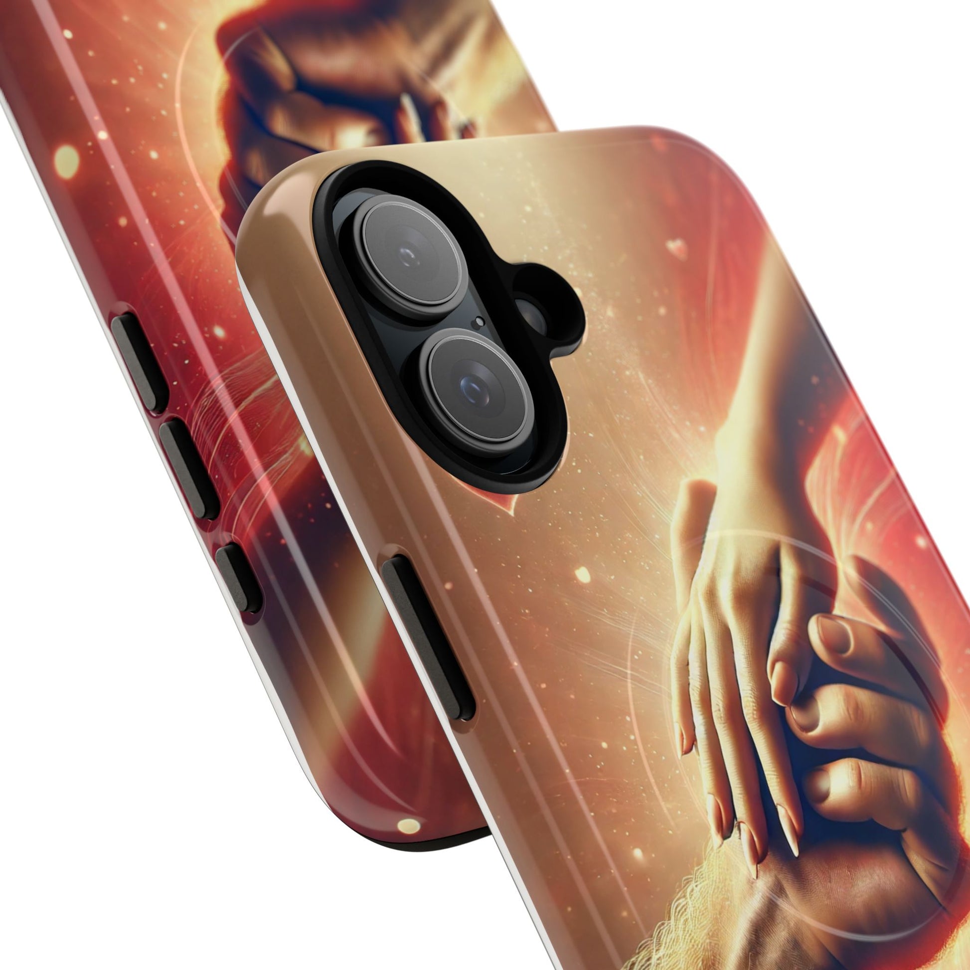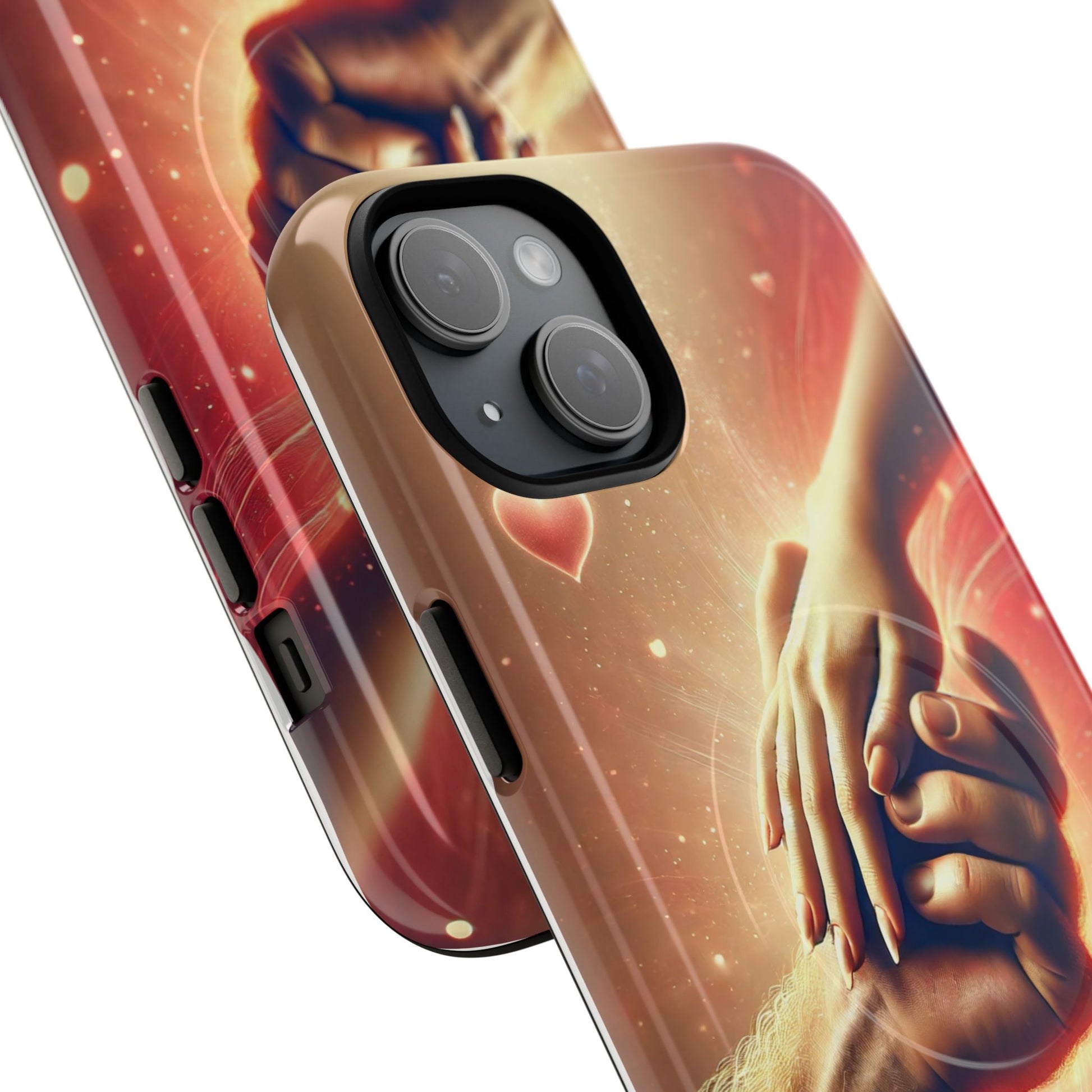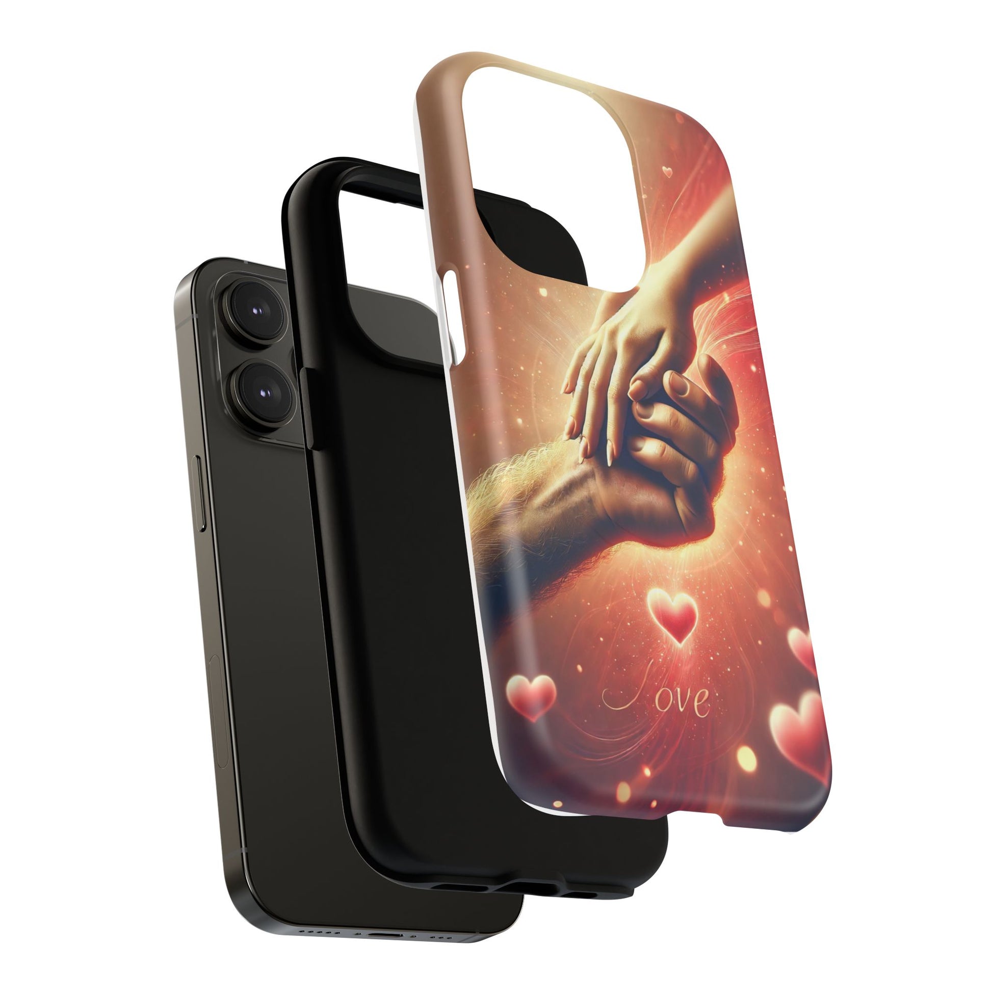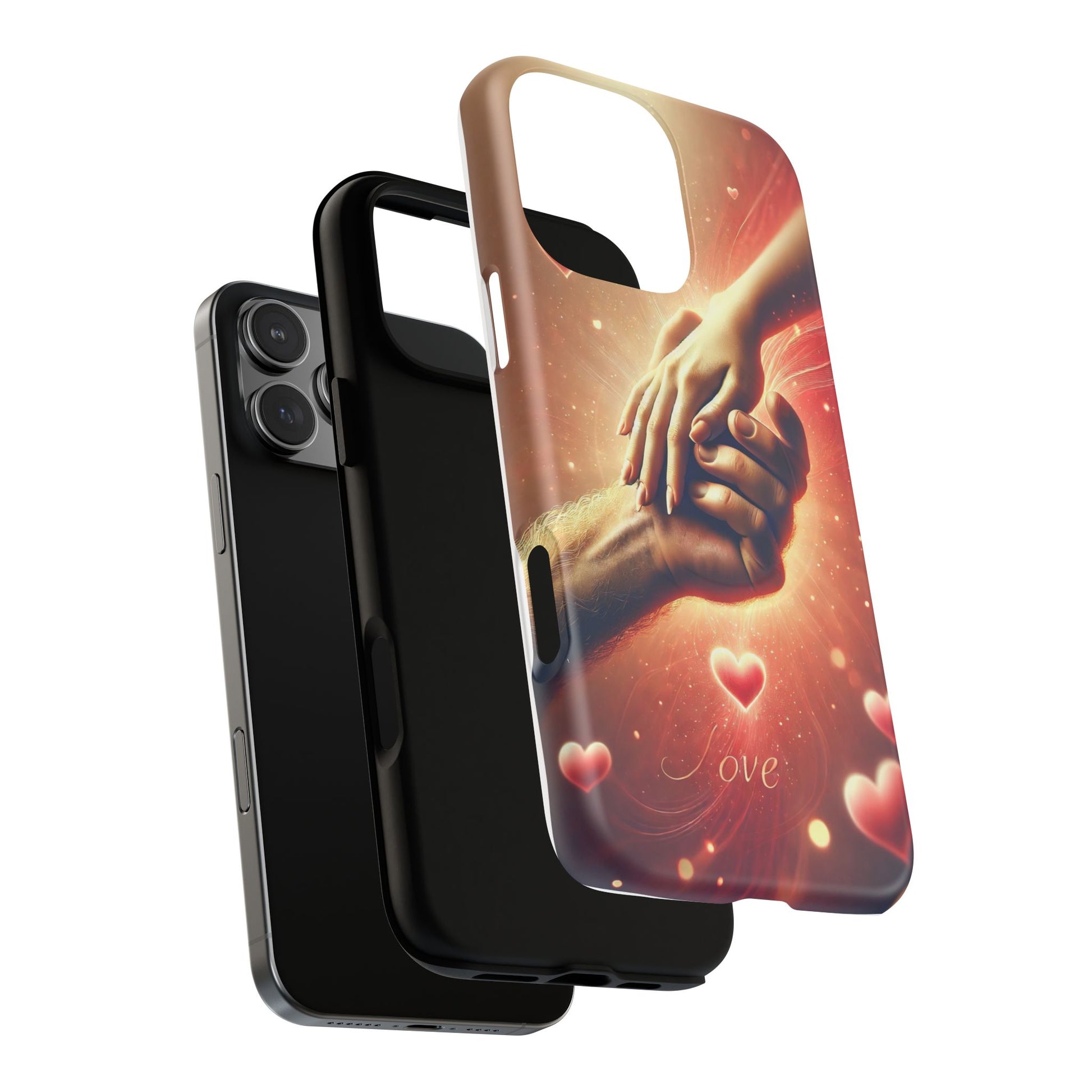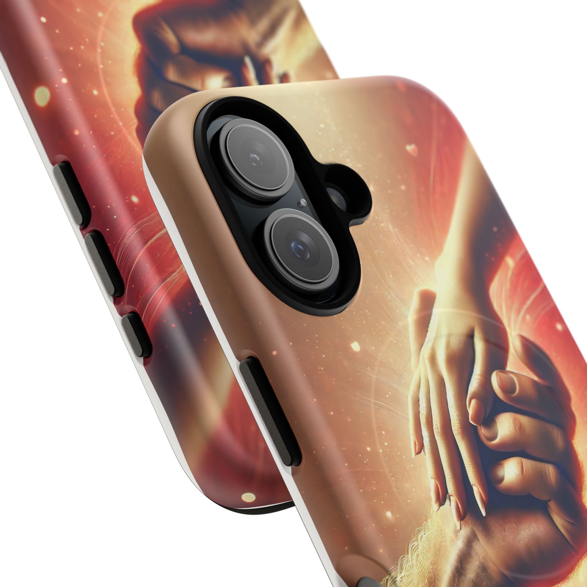 A tough magnetic phone case featuring a hands in love design. This phone case gives off a romantic and whimsical vibe, perfect for those who are in love or love love-themed products. Ideal for Valentine's Day, anniversaries, or as a sweet gift for a special someone.