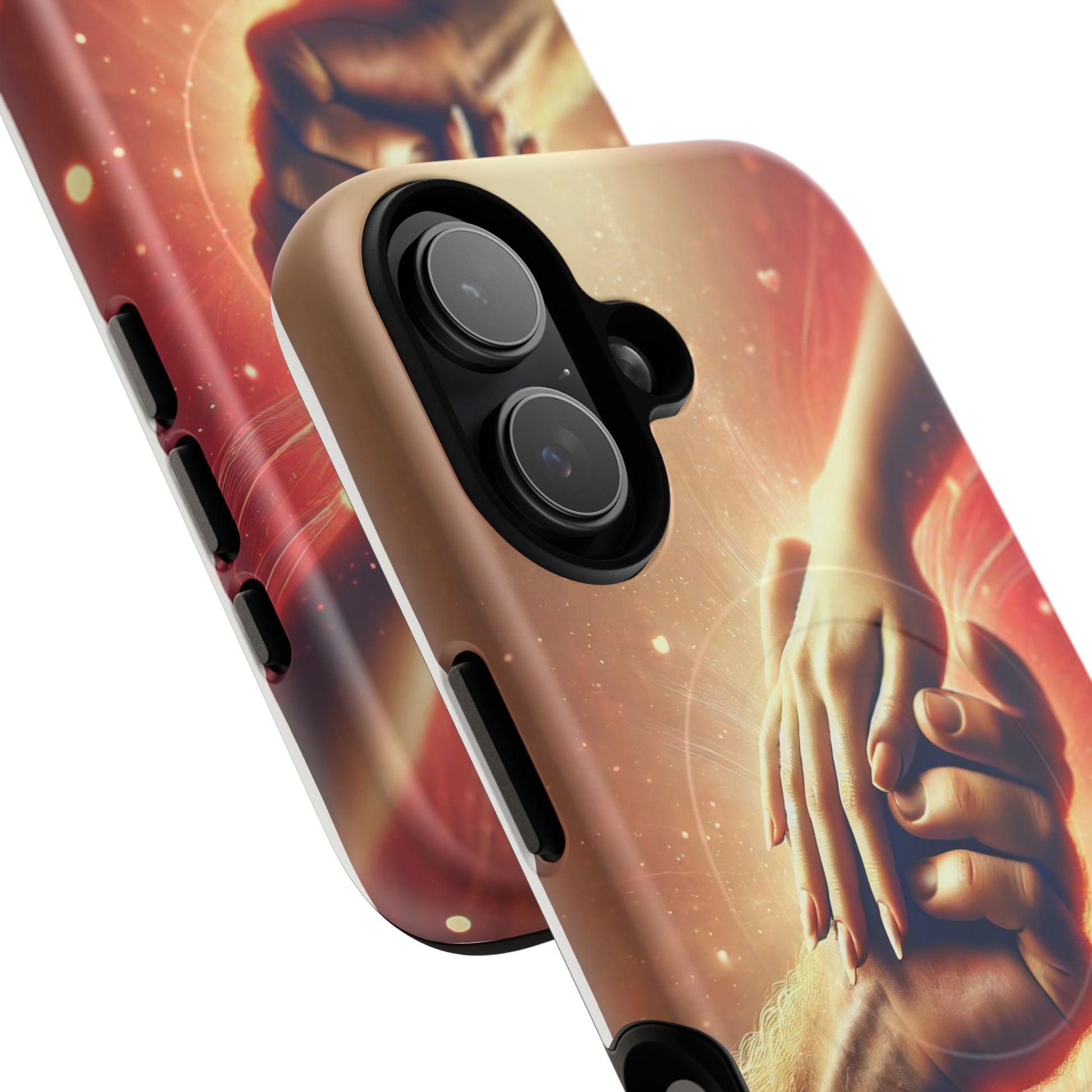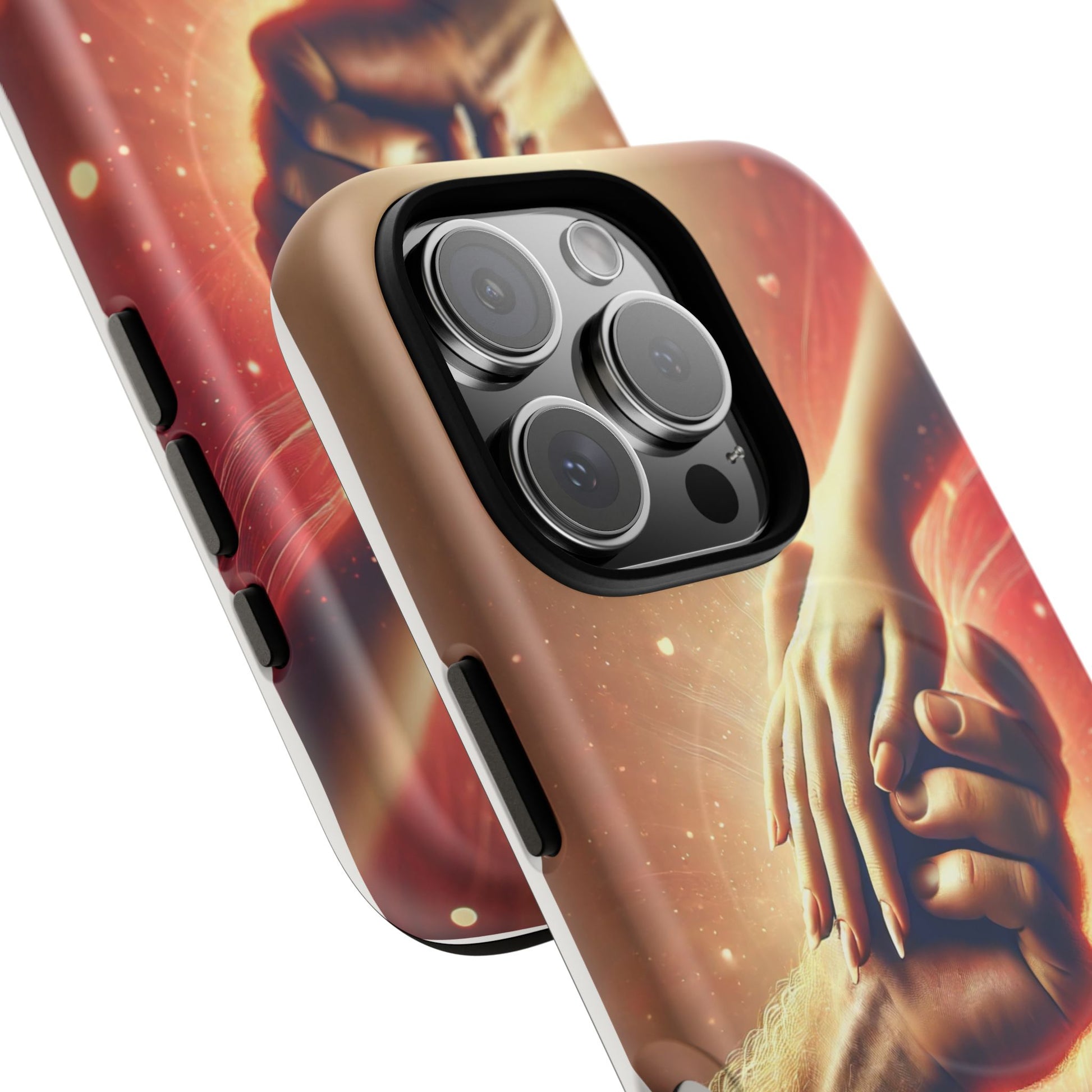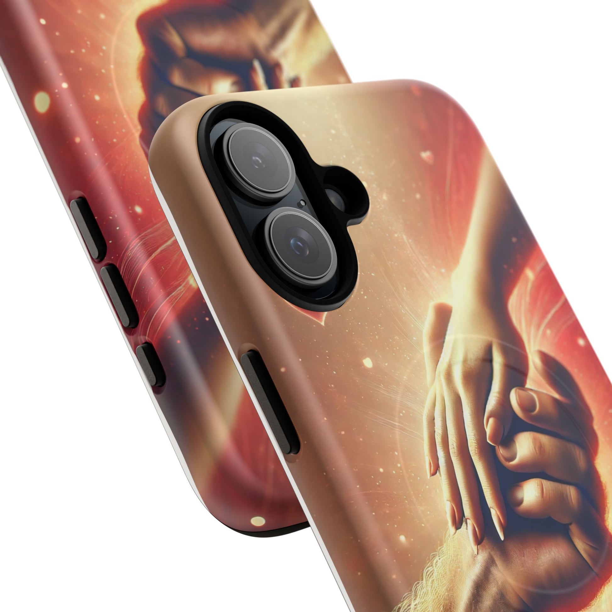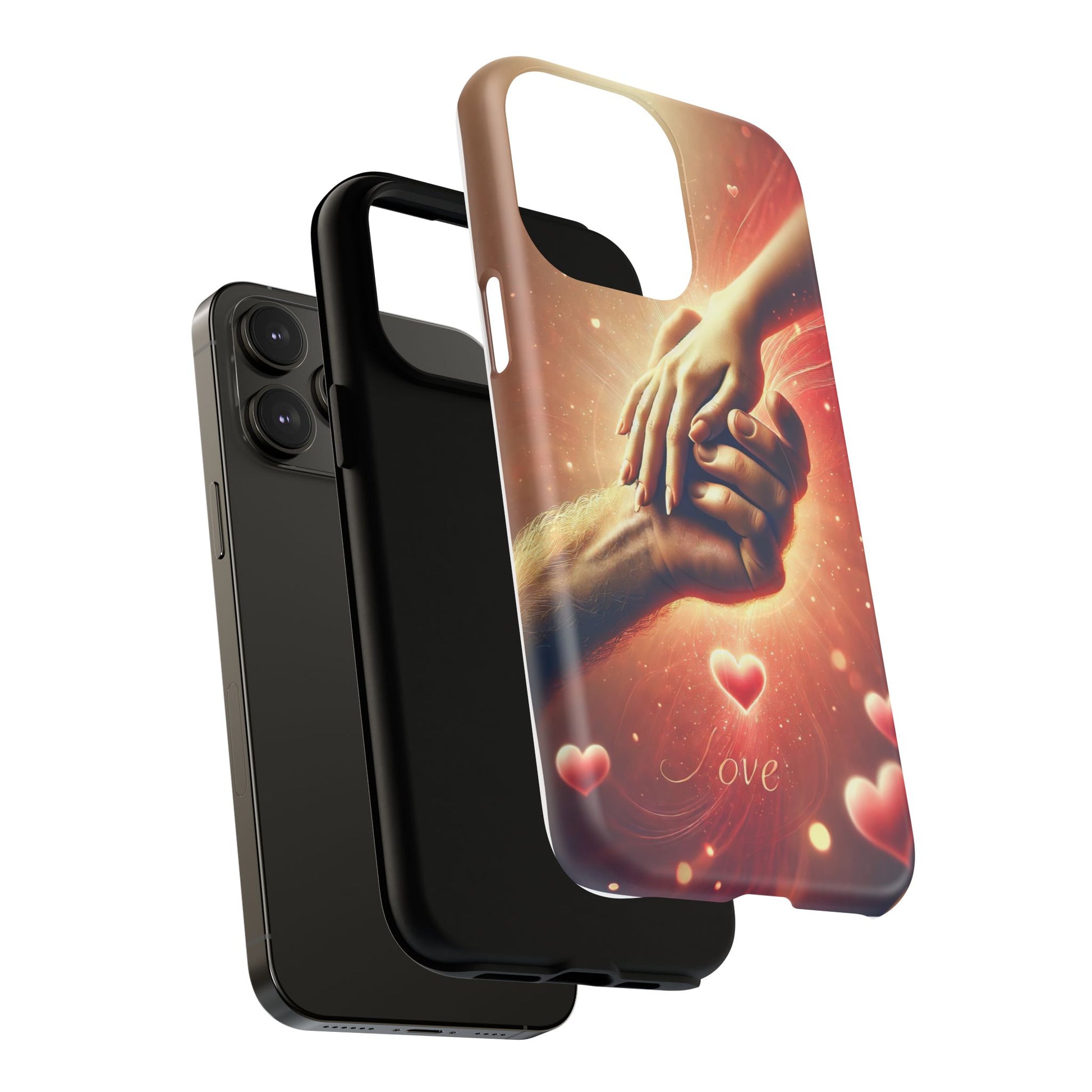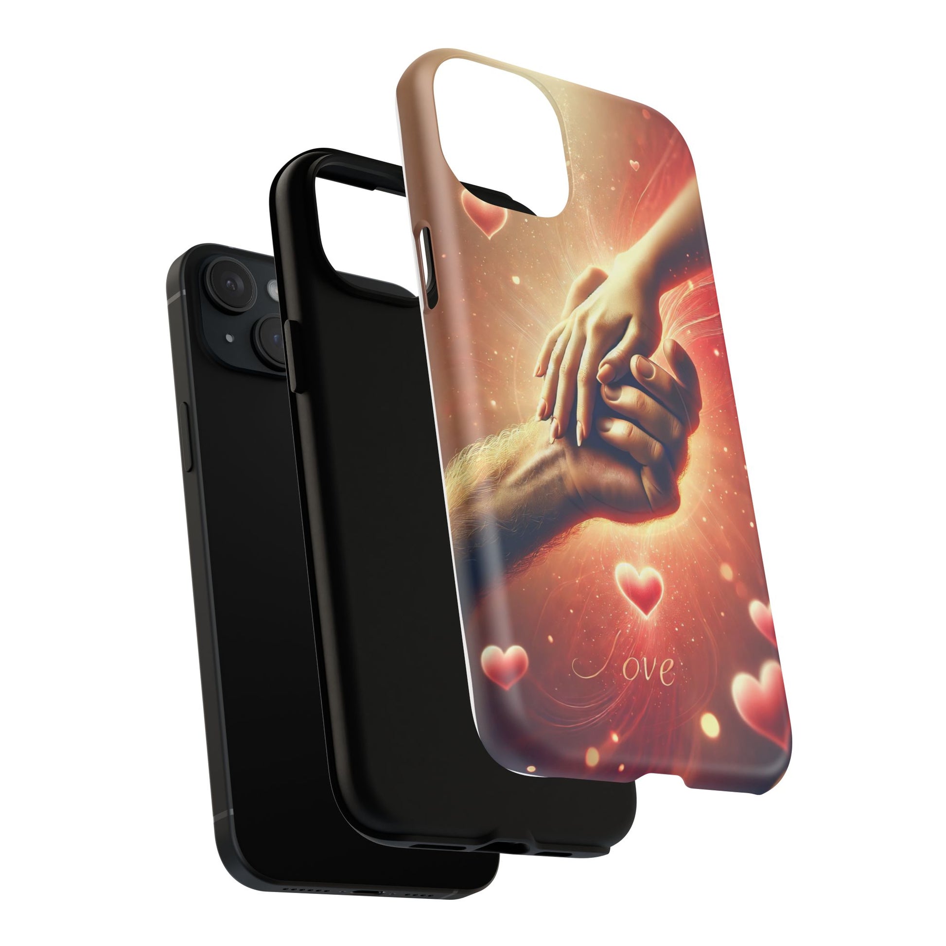 A tough magnetic phone case featuring a hands in love design. This phone case gives off a romantic and whimsical vibe, perfect for those who are in love or love love-themed products. Ideal for Valentine's Day, anniversaries, or as a sweet gift for a special someone.