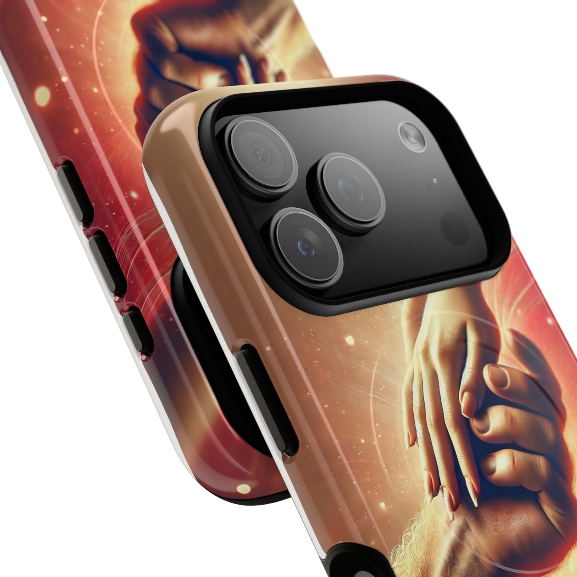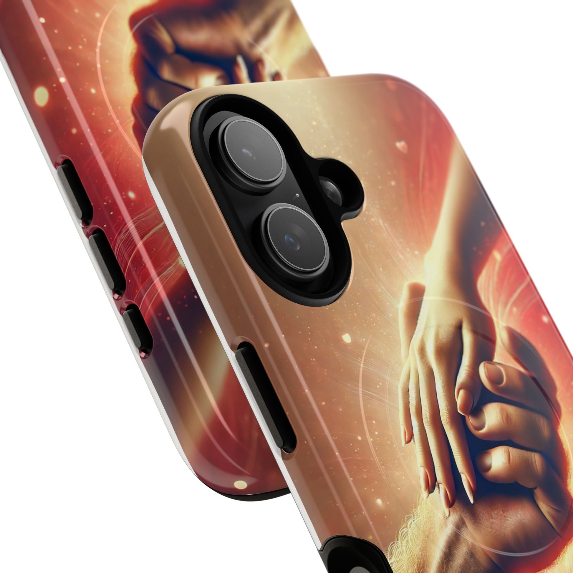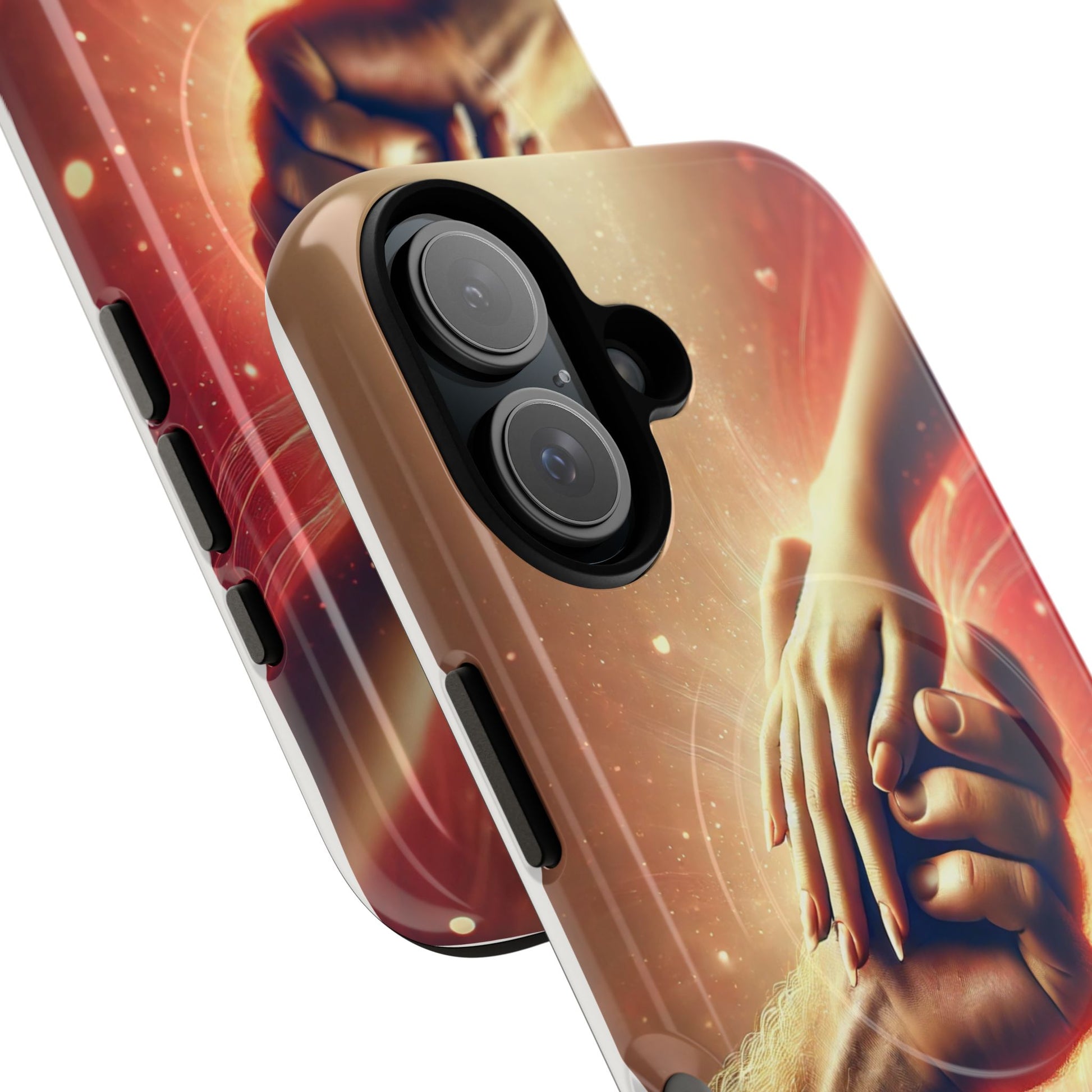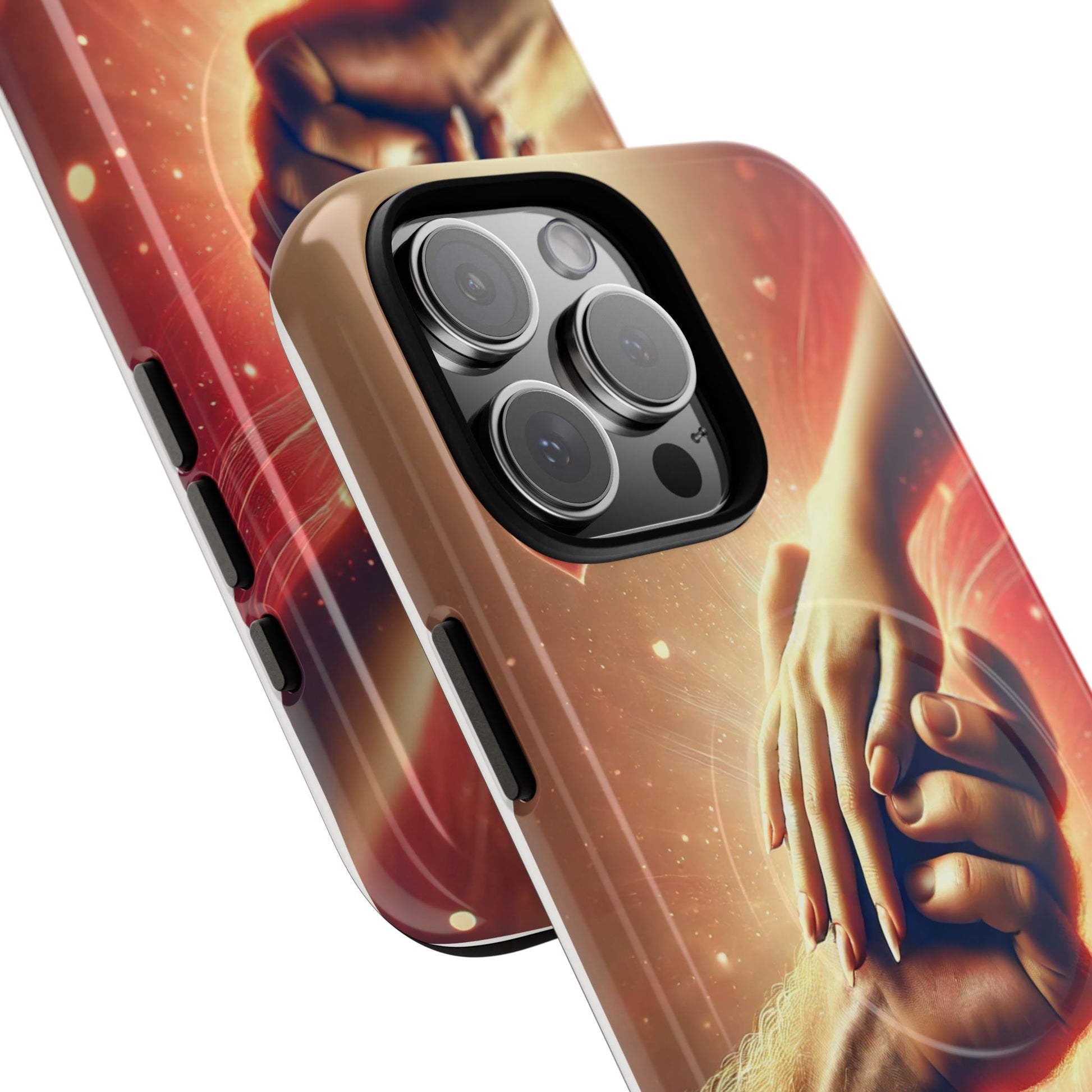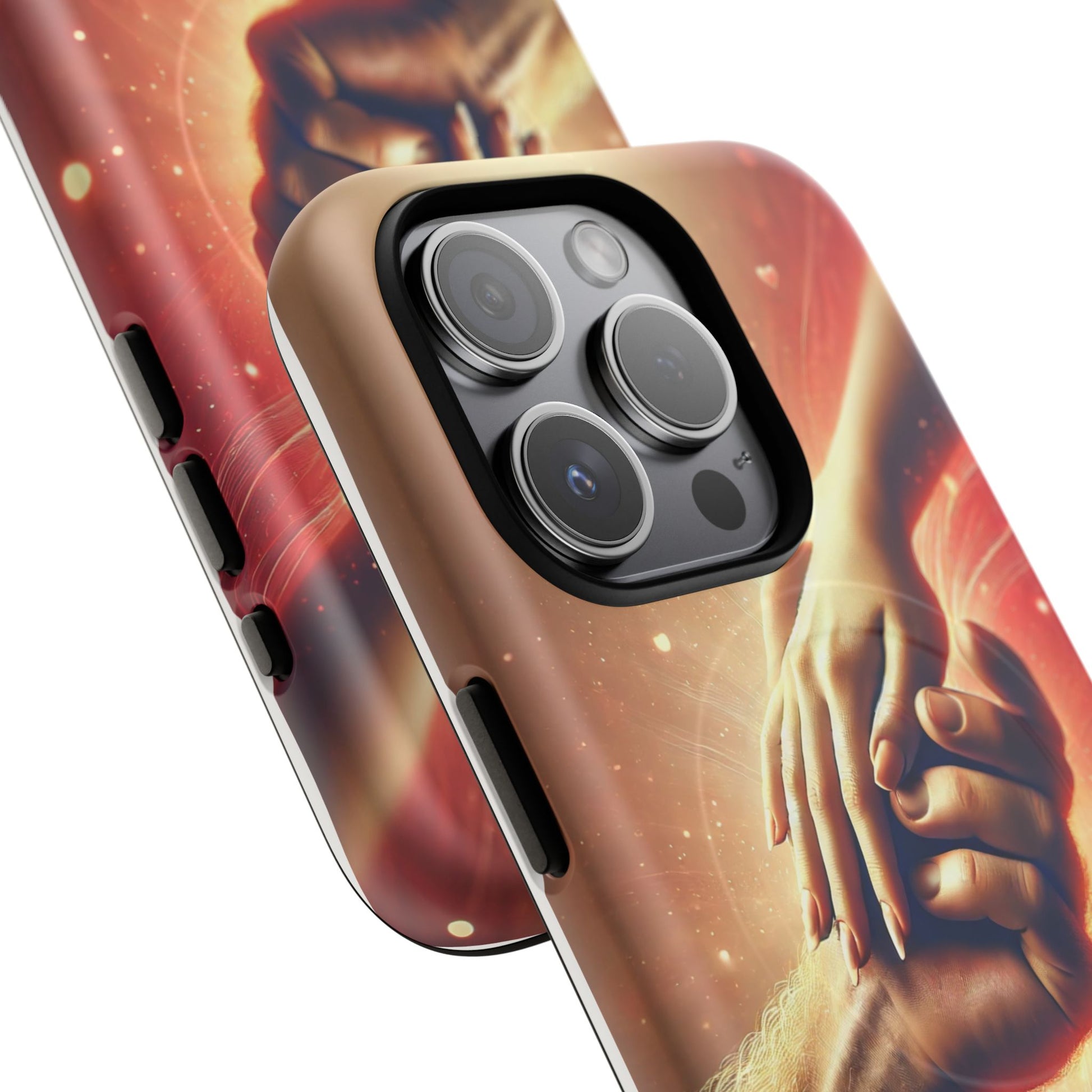 A tough magnetic phone case featuring a hands in love design. This phone case gives off a romantic and whimsical vibe, perfect for those who are in love or love love-themed products. Ideal for Valentine's Day, anniversaries, or as a sweet gift for a special someone.