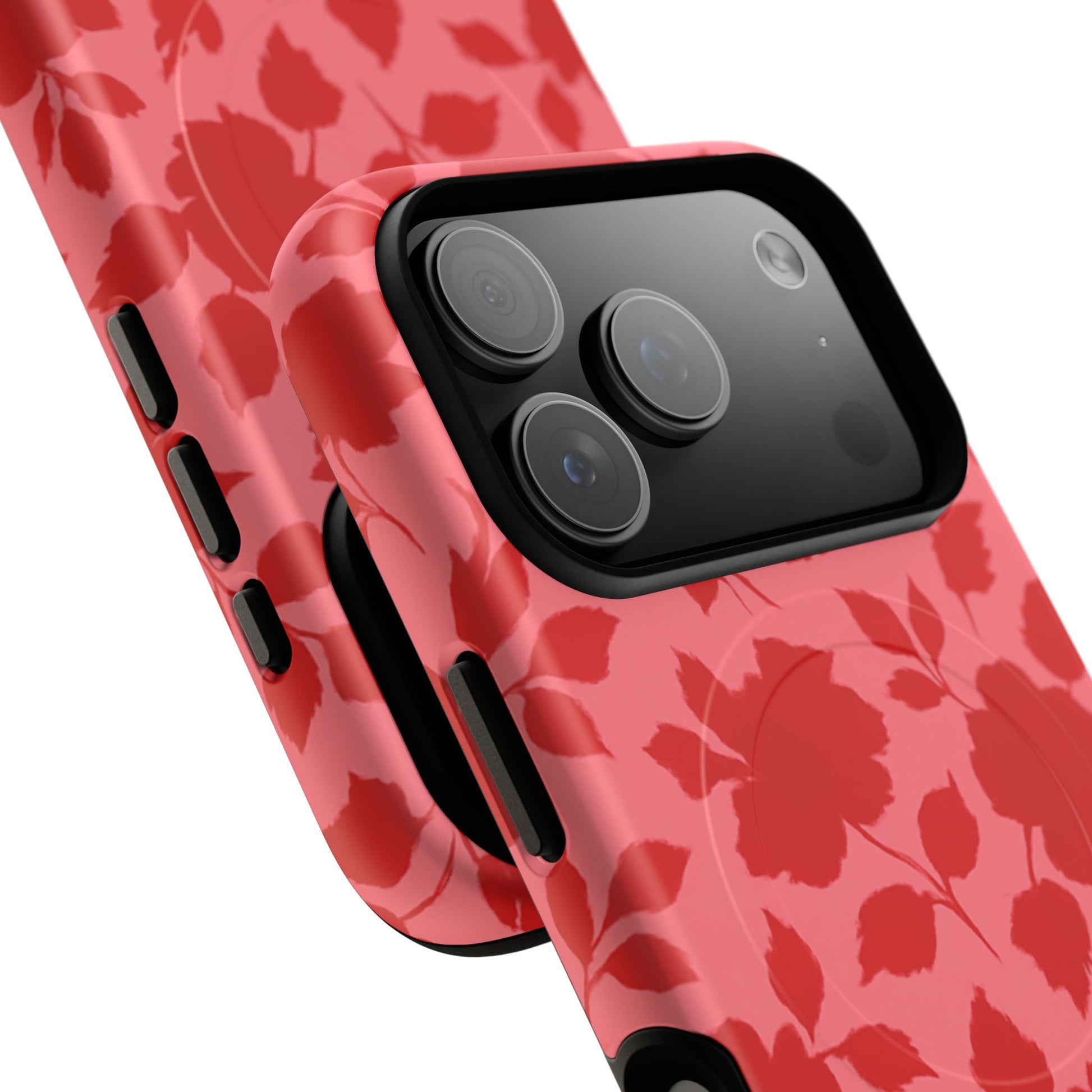 A slim, tough phone case that brings bold floral style without sacrificing protection. The glossy red-and-pink wrap features an all-over rose and leaf pattern transferred in full color across the surface, so the design flows around corners and keeps its vibrancy over time. Inside, a soft TPU silicone liner cushions bumps while the hard polycarbonate shell resists impacts. Built with a magnetic module compatible with MagSafe® accessories and precise open ports for charging, this dual-layer case balances daily practicality with eye-catching design. It’s lightweight, grippy at the edges, and available in glossy or matte finishes to suit how you use your phone.