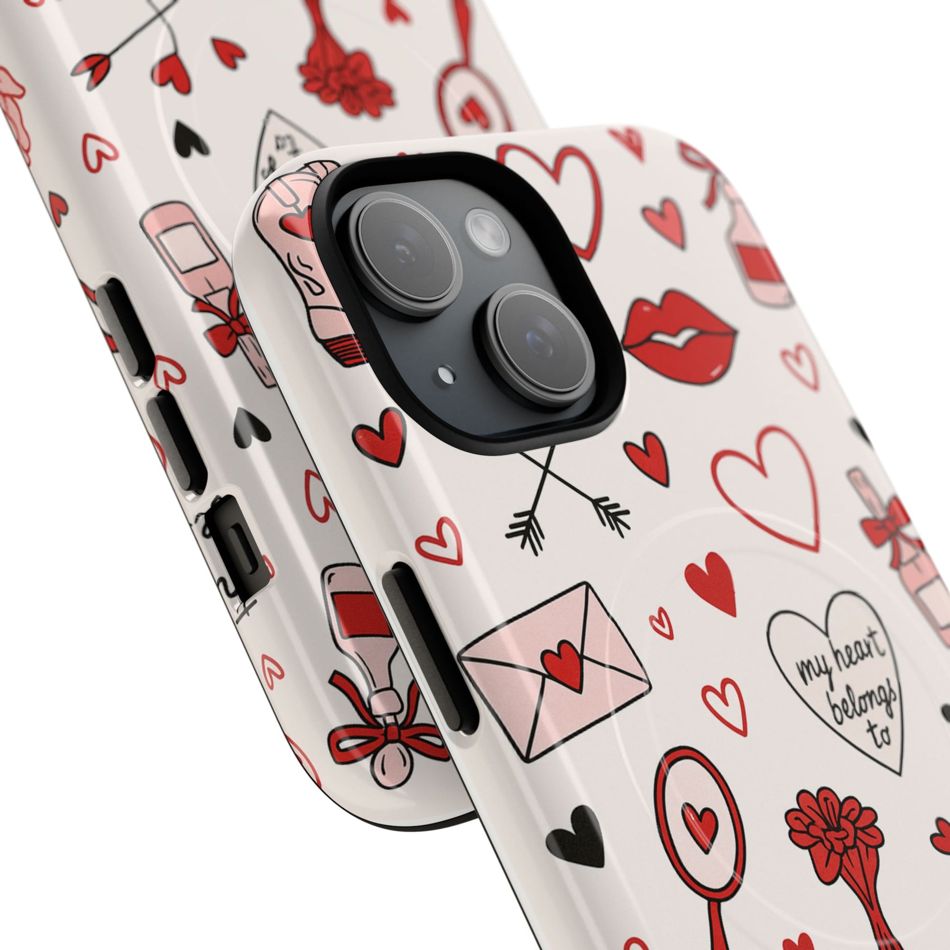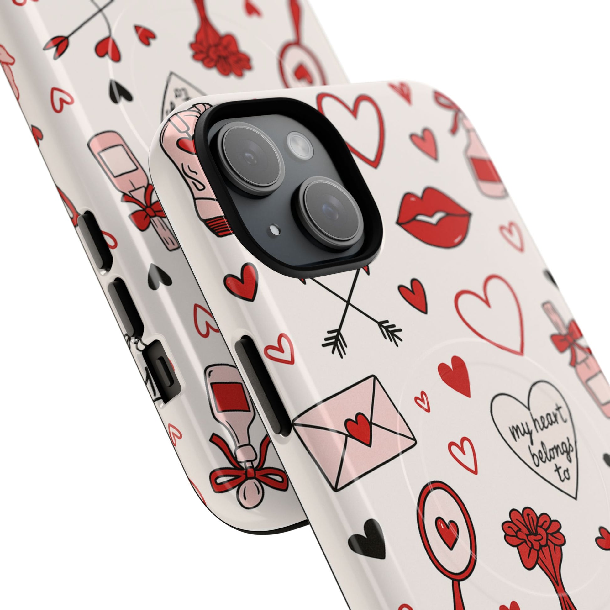 A slim, protective phone case that carries a playful, hand-drawn romance across every inch. The dual-layer shell pairs a glossy or matte 100% polycarbonate exterior with a shock-absorbing TPU silicone liner, and a built-in magnetic module for seamless MagSafe® use. Tiny hearts, roses, love letters and mirrors scatter across the surface in a soft red-and-pink palette, giving a cheerful, intimate vibe whenever the phone is picked up. Feels sturdy in the hand and keeps ports open for easy charging and accessories. Crafted from durable, impact-resistant materials and sourced from South Korea, this case blends everyday protection with whimsical, romantic style—great for anyone who likes to carry a little affection with their tech.
