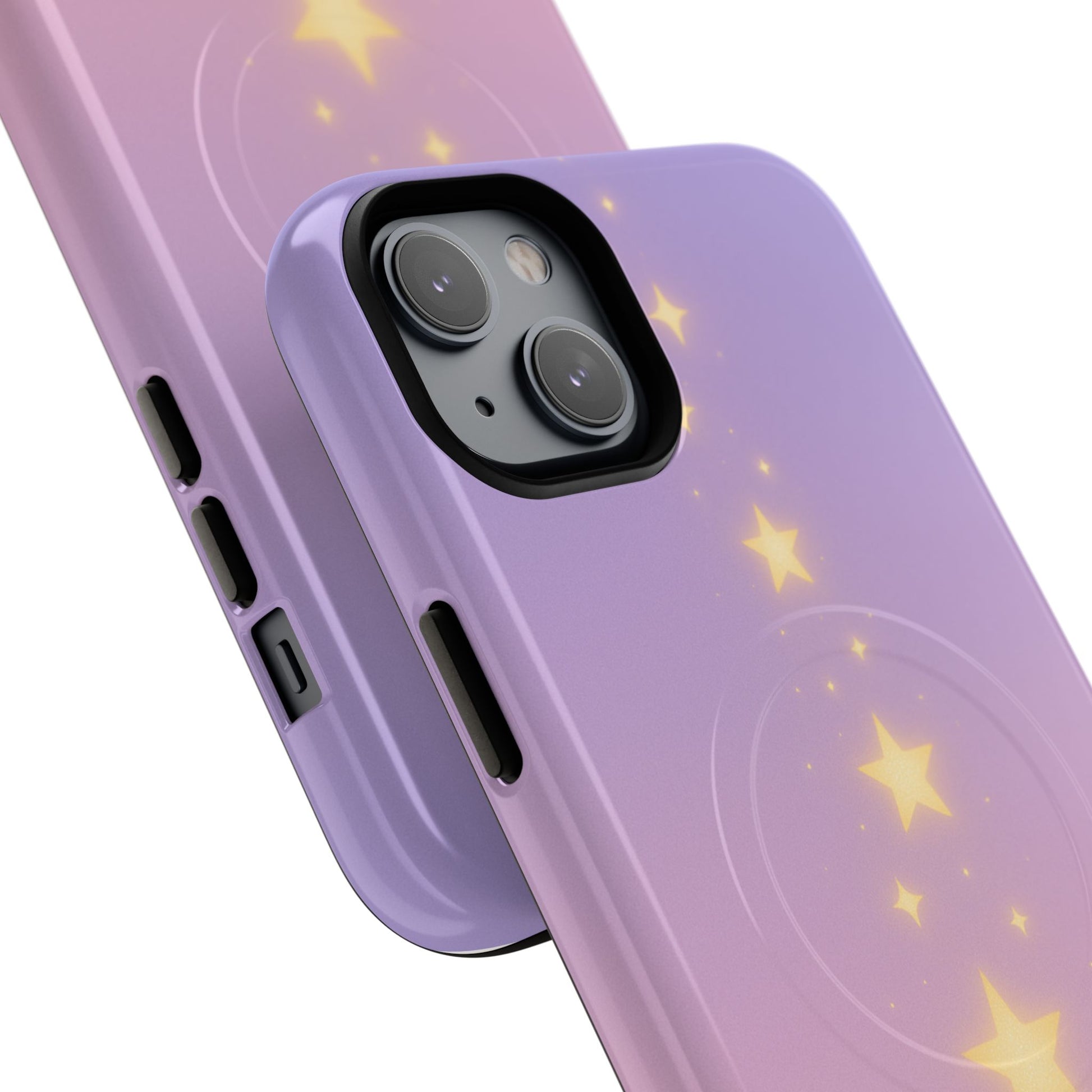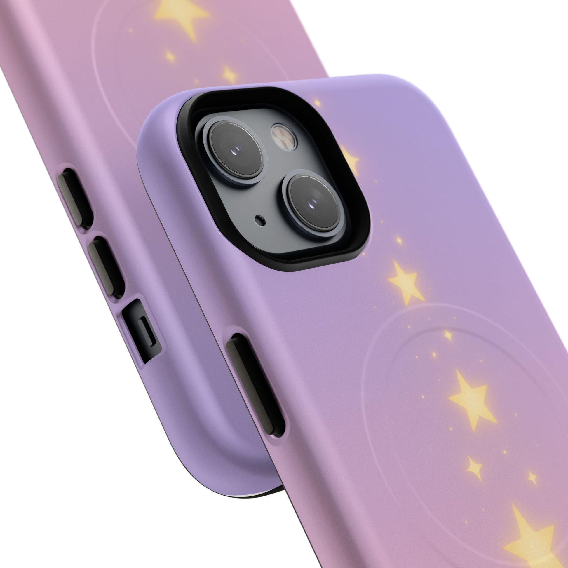 This slim, protective phone case blends dreamy pastel gradients with a trail of glowing stars — a quiet piece of everyday magic for people who love soft, whimsical design. The dual-layer construction pairs a rigid polycarbonate shell with a shock-absorbing TPU silicone liner, so your phone looks gentle and celestial while staying defended against everyday bumps and drops. The integrated magnetic module works with MagSafe® accessories, and precise cutouts keep charging, speakers, and cameras fully accessible. Choose glossy for a luminous sheen or matte for a velvety finish. It slips easily into routines — morning coffee, late-night texts, or a weekend walk under city lights — and brings a small, personal spark whenever you reach for your phone.